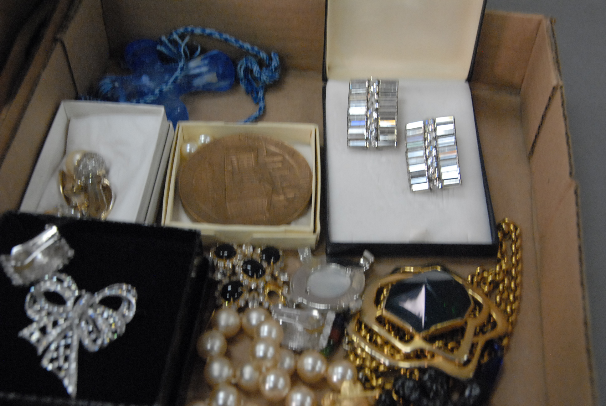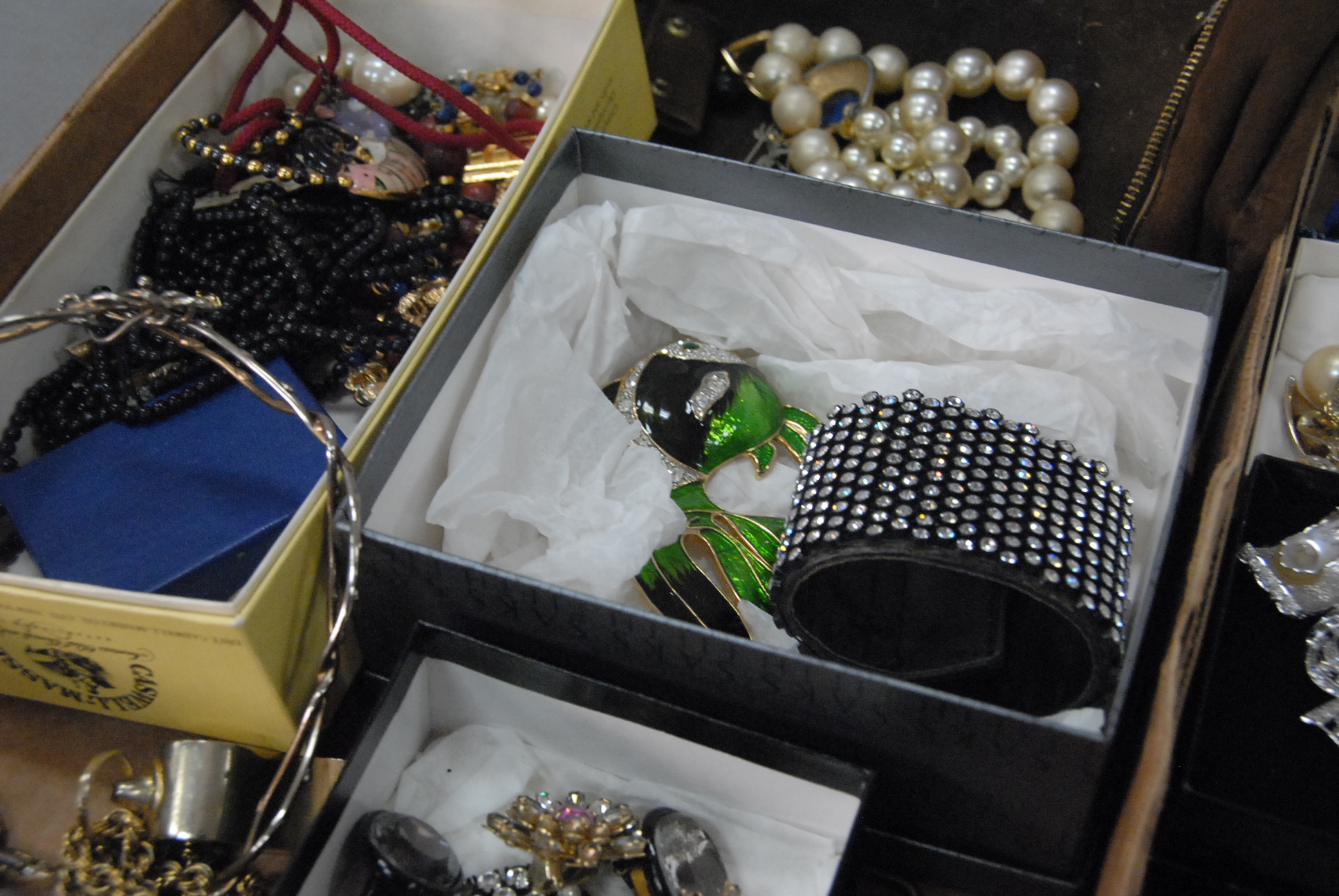 Two box lots of costume jewelry including necklaces, pins, bracelets, etc.