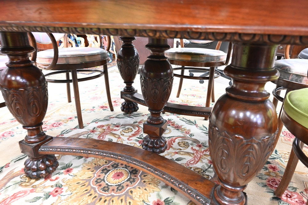 Victorian Mahogany Square Dining Table, having large paw feet and center leg, one leaf, height 30 inches, top 64″ x 64″. Provenance: Estate of James Dana English of New Haven to benefit the New Haven CT Museum.