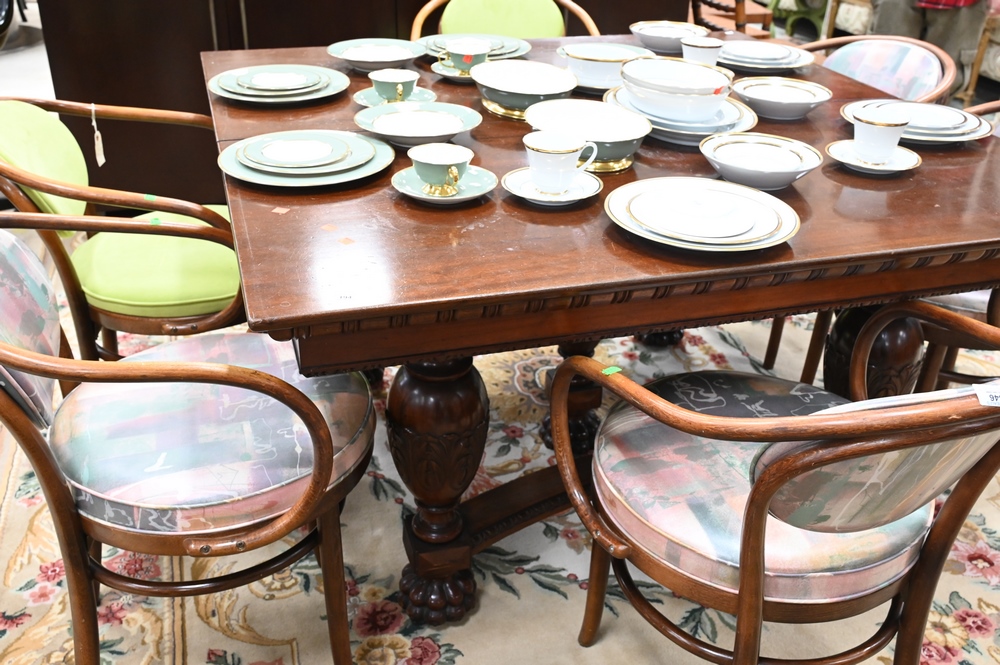 Lot 194: Victorian Mahogany Square Dining Table, having large paw feet and center leg, one leaf, height 30 inches, top 64″ x 64″. Provenance: Estate of James Dana English of New Haven to benefit the New Haven CT Museum.