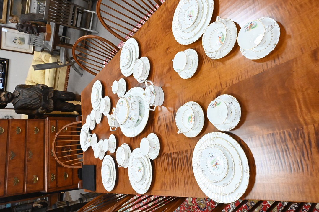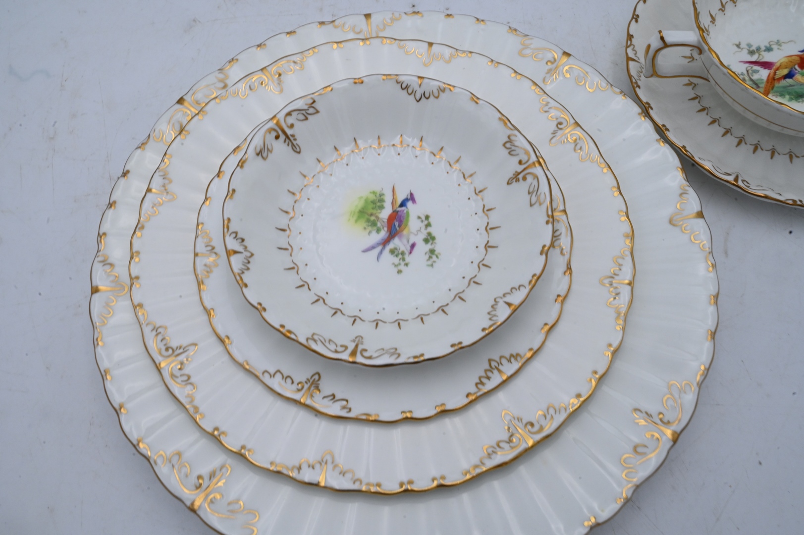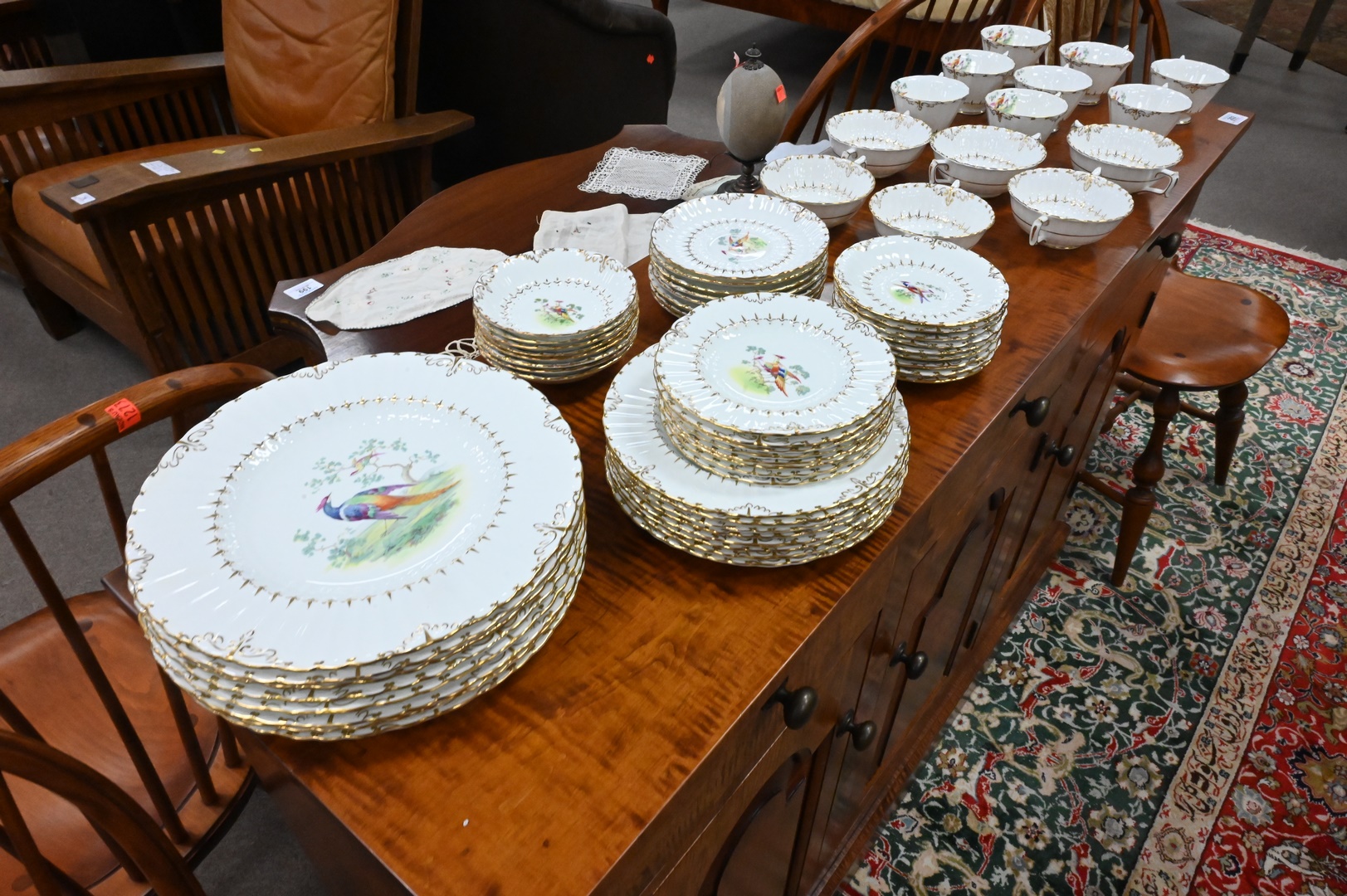 131 Piece Royal Crown Derby England Set, complete service for 16 plus serving pieces, having heavy gold rim depicting game birds, to include 16 dinner plates, 16 salad plates, 16 dessert plates, 16 fruit bowls, 14 soup cream, 16 soup cream underplates, 16 teacups, 17 tea saucers, 1 tureen, 1 sugar, 1 creamer, along with 1 oval serving plate.