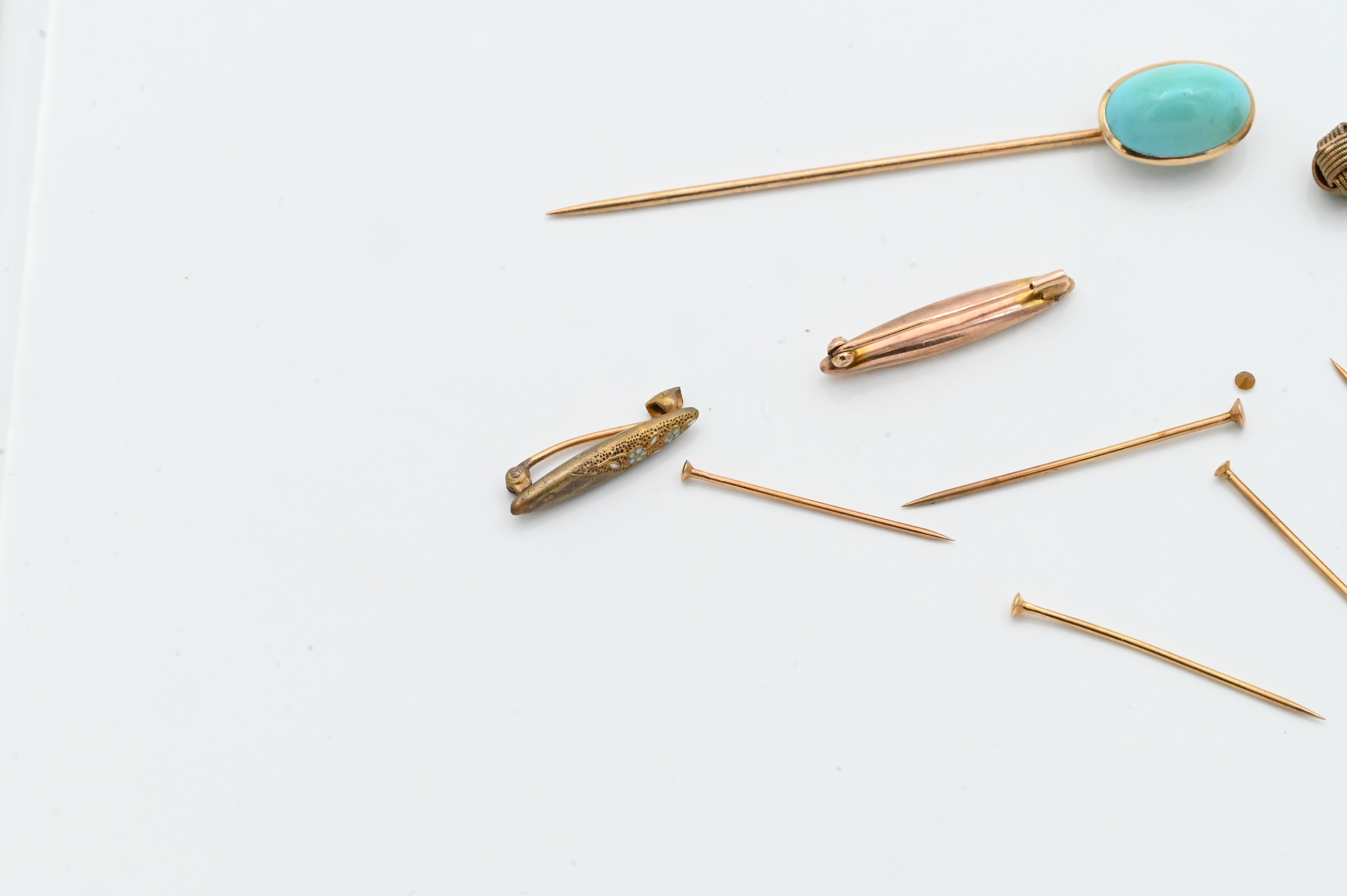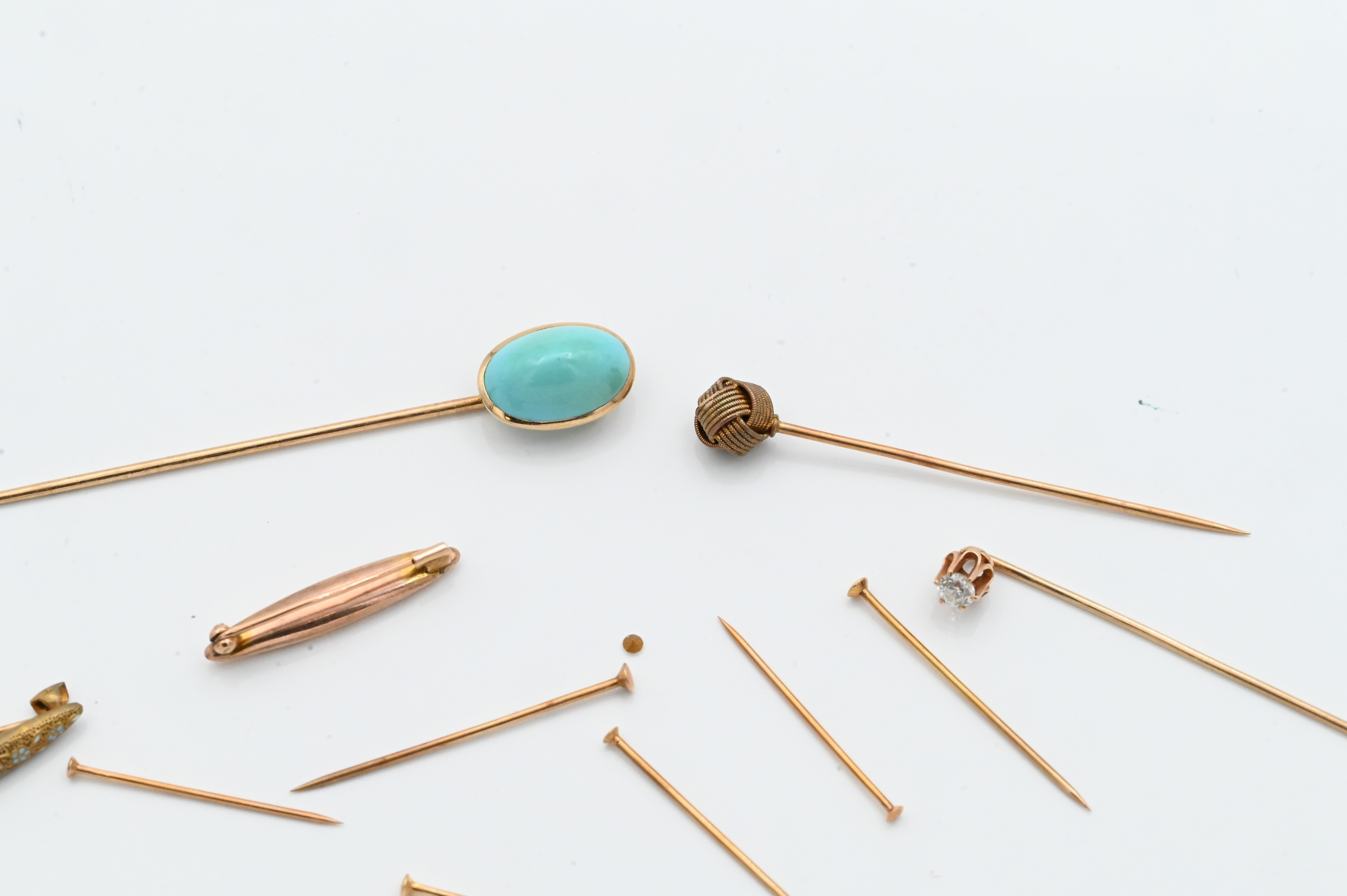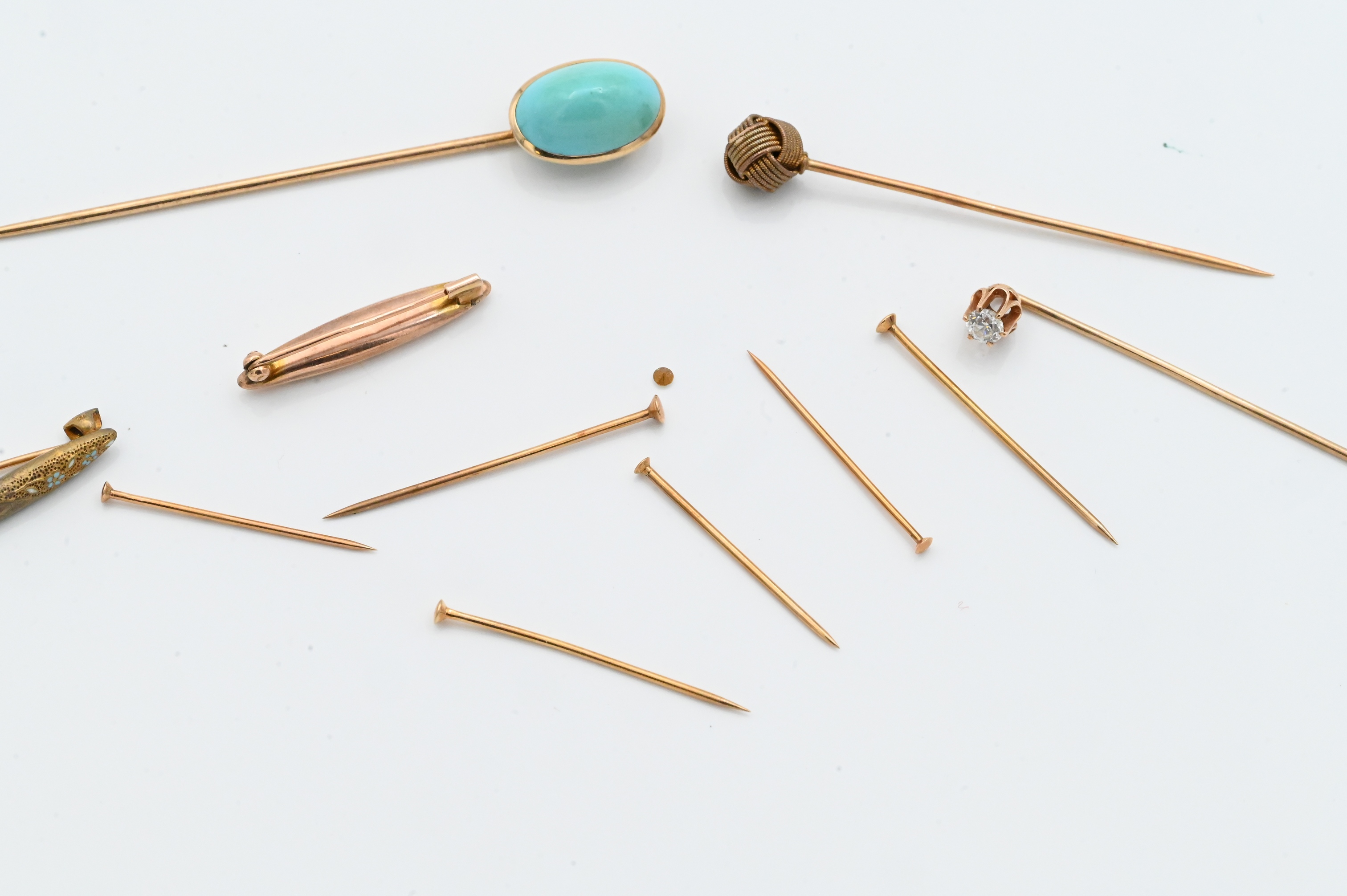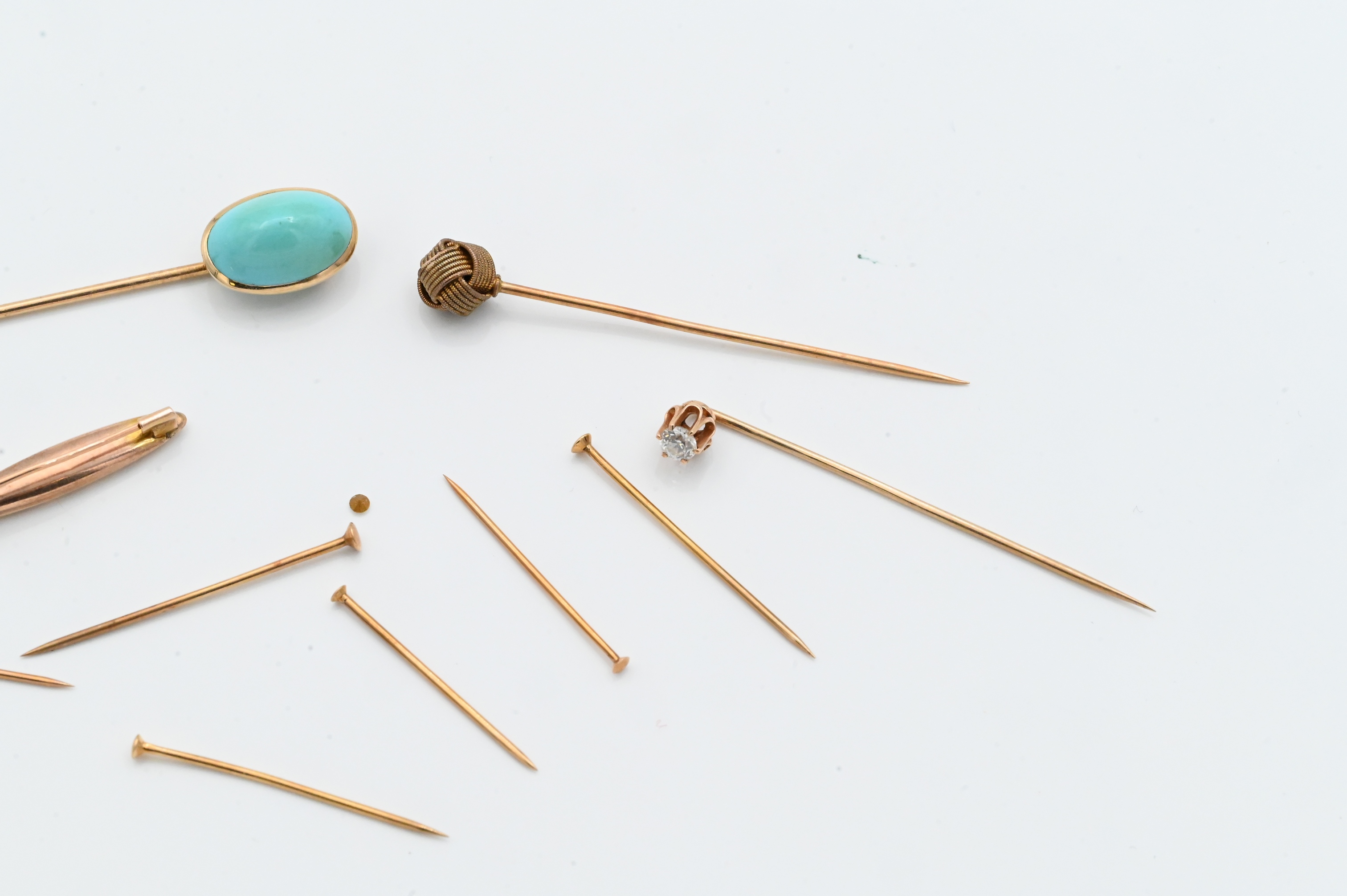 to include six gold pins / nails, two gold bar pins, and three gold stack pins are with an approximately 3.6 millimeter diamond, and one with blue stone
