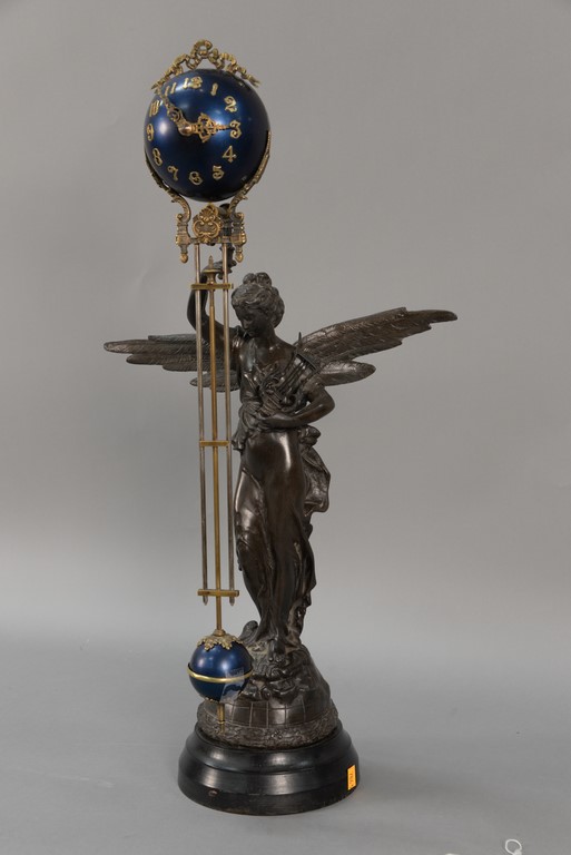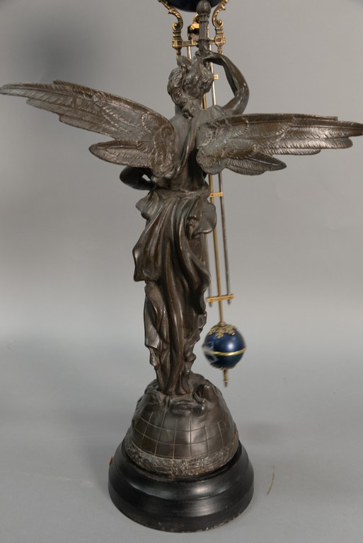 Ansonia figural swinging clock Gloria angel standing on globe holding a lyre, brown finish standing on iron base, working condition. ht. 28 in.