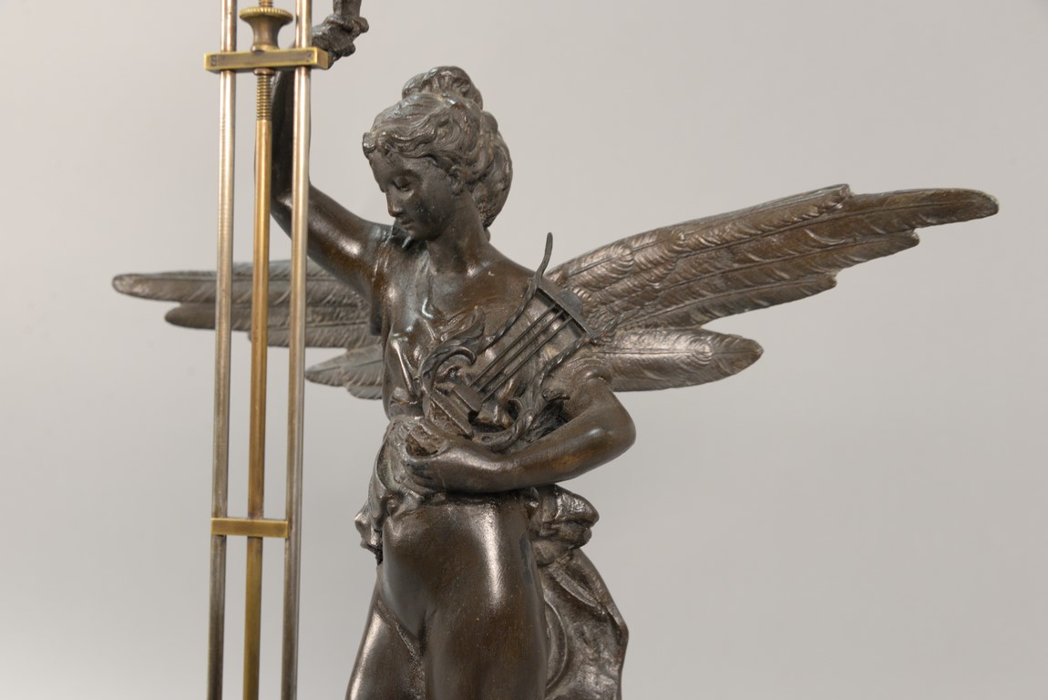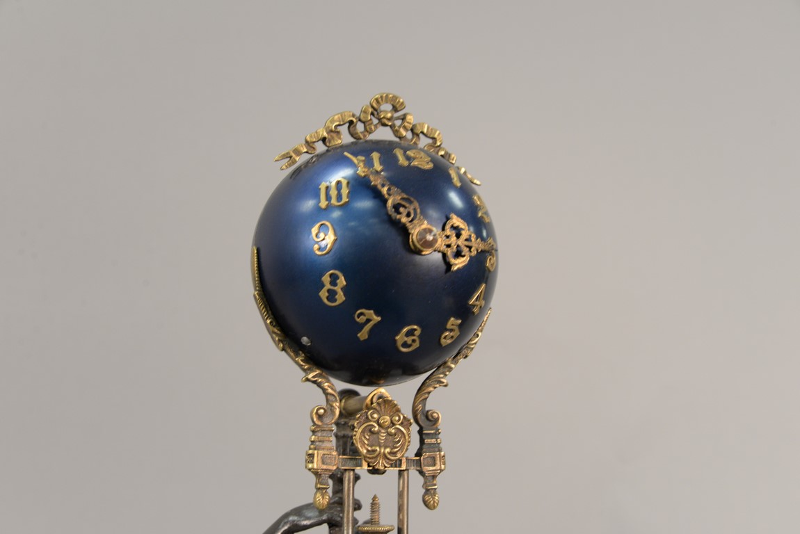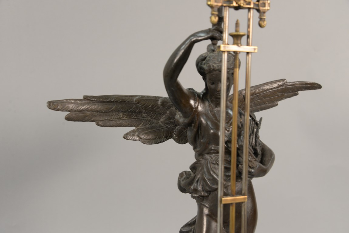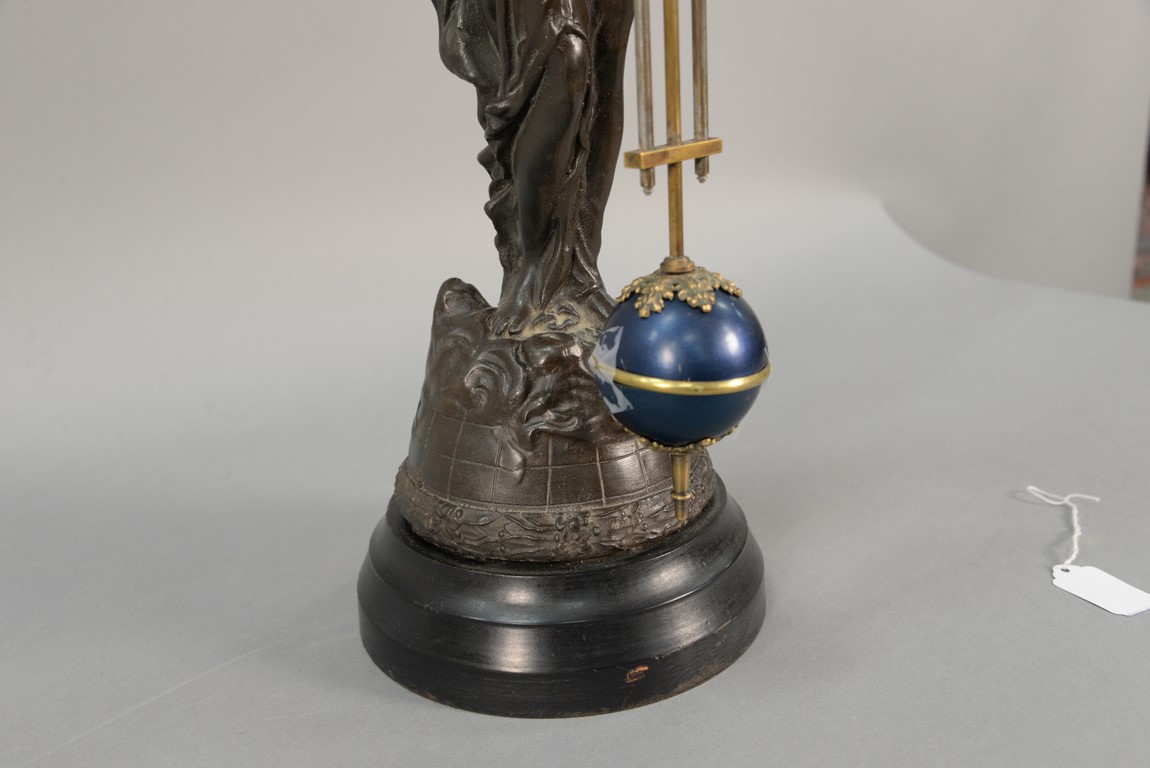 Lot 195: Ansonia figural swinging clock Gloria angel standing on globe holding a lyre, brown finish standing on iron base, working conditio…