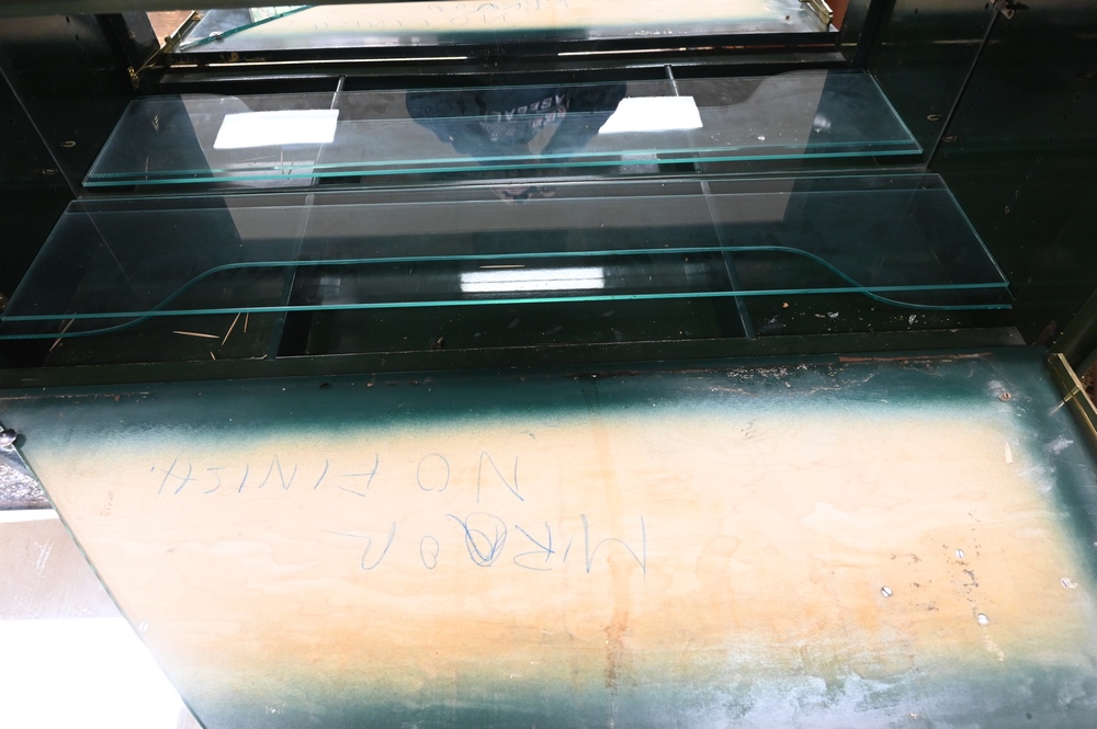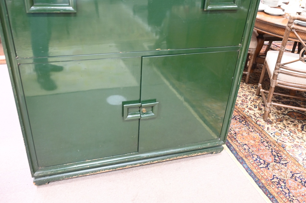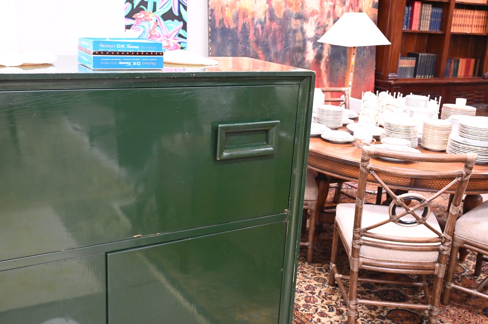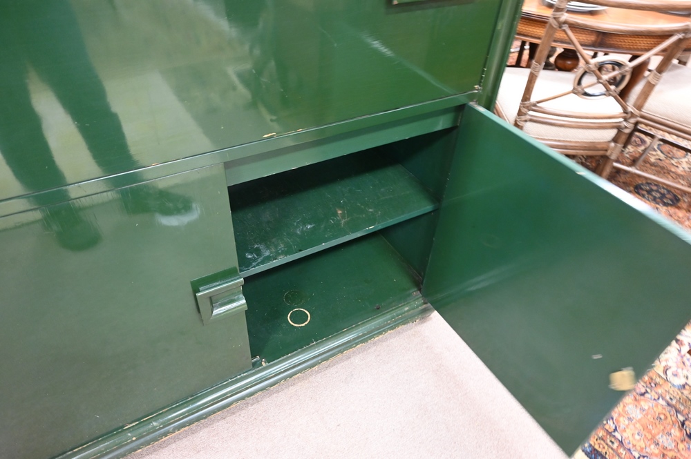 Lot 195: Green Art Deco Bar Cabinet, having drop front over two doors, interior as is, height 50 inches, top 16″ x 50″.