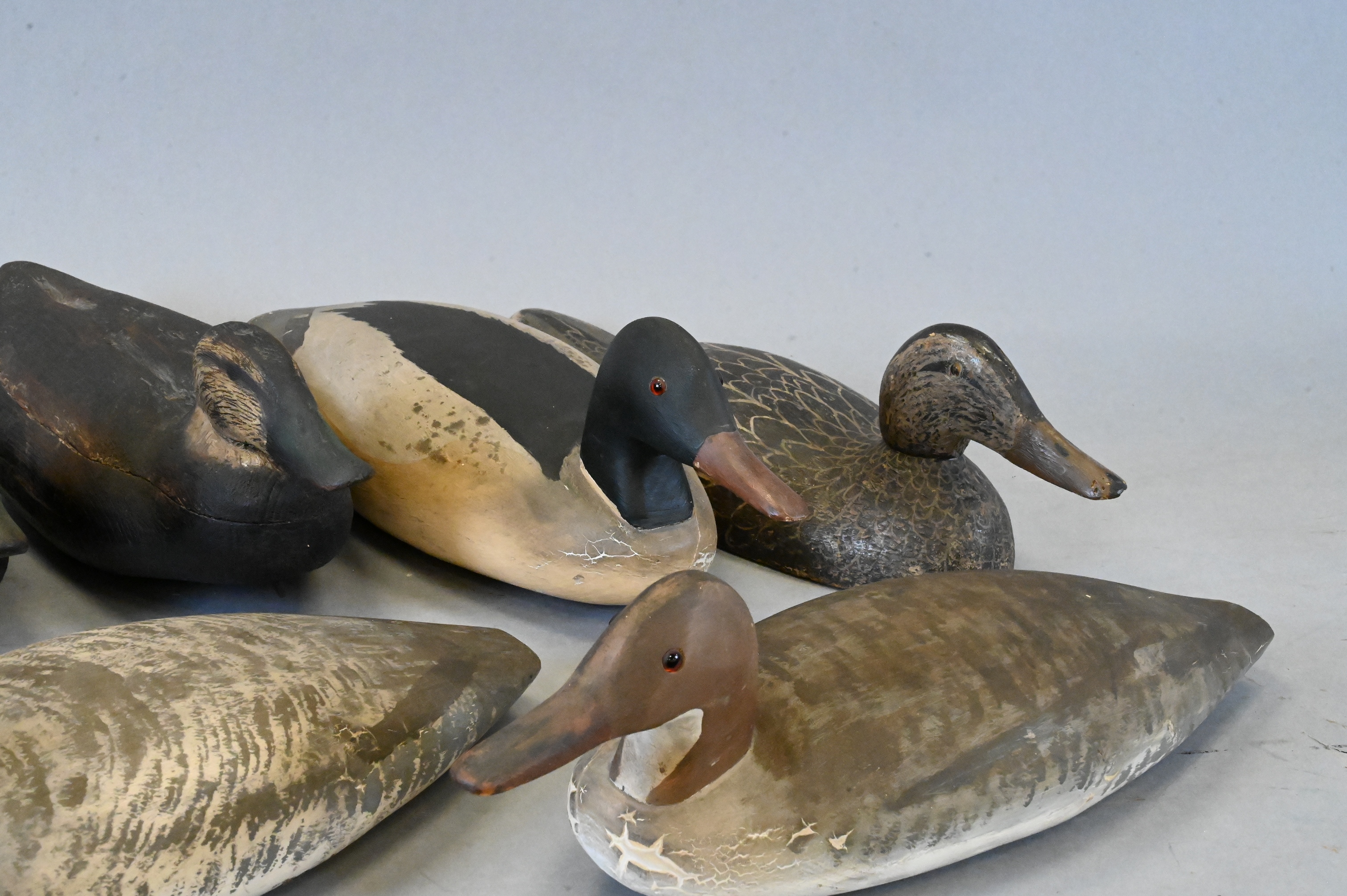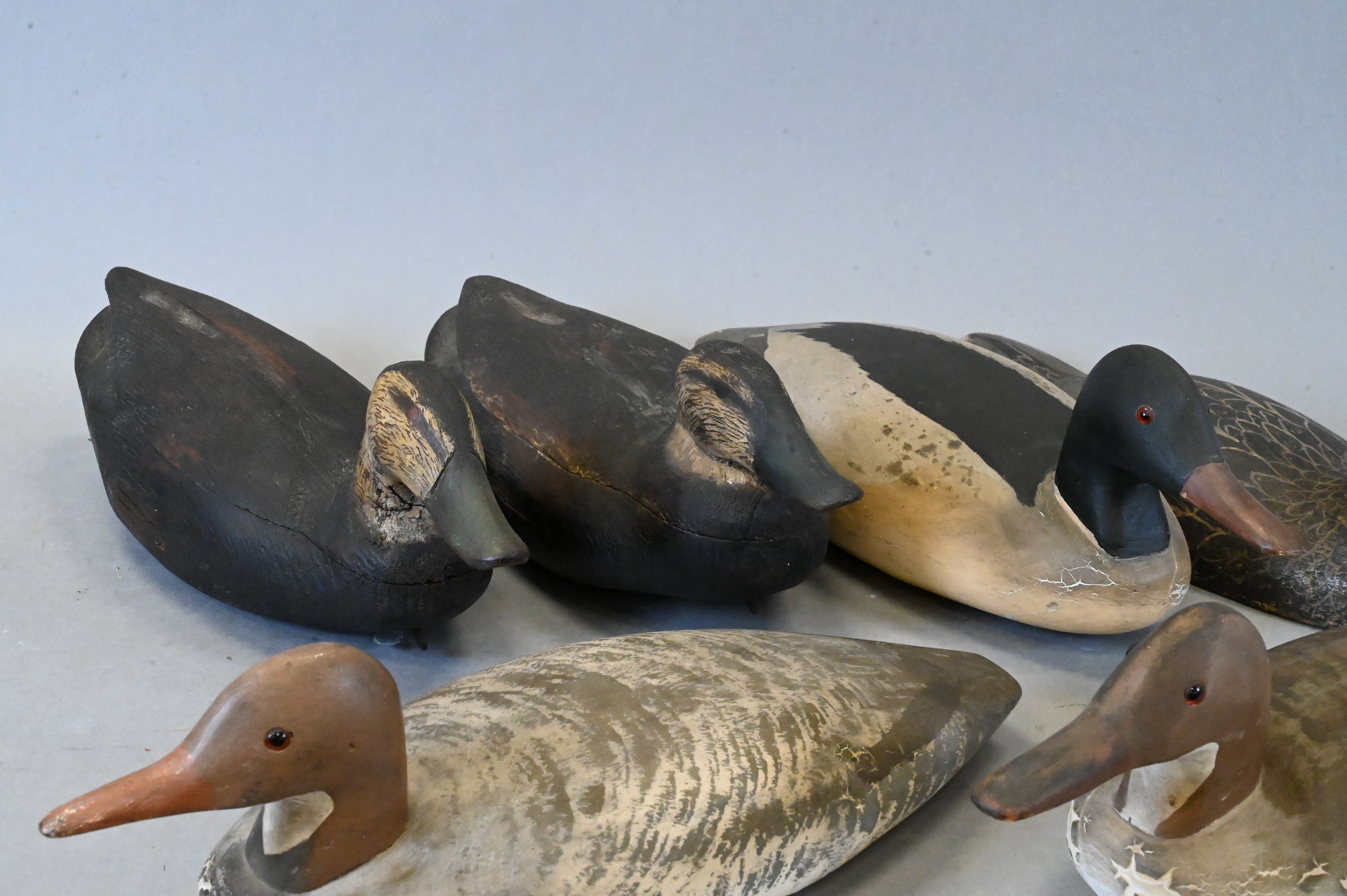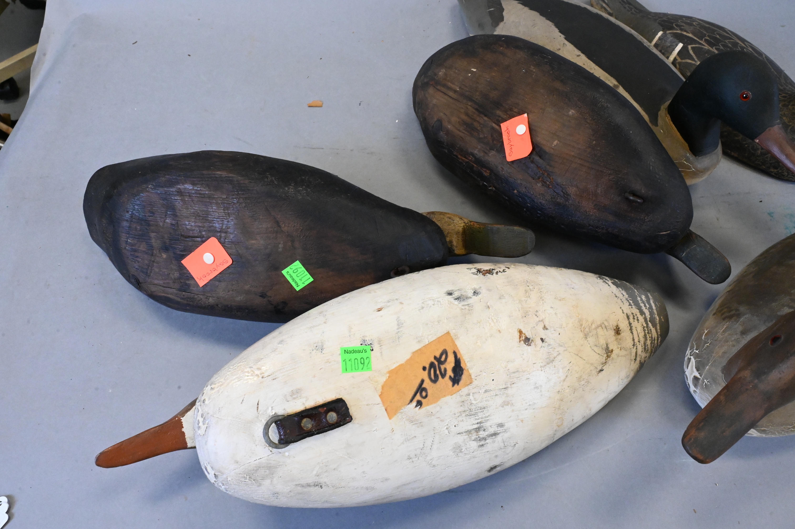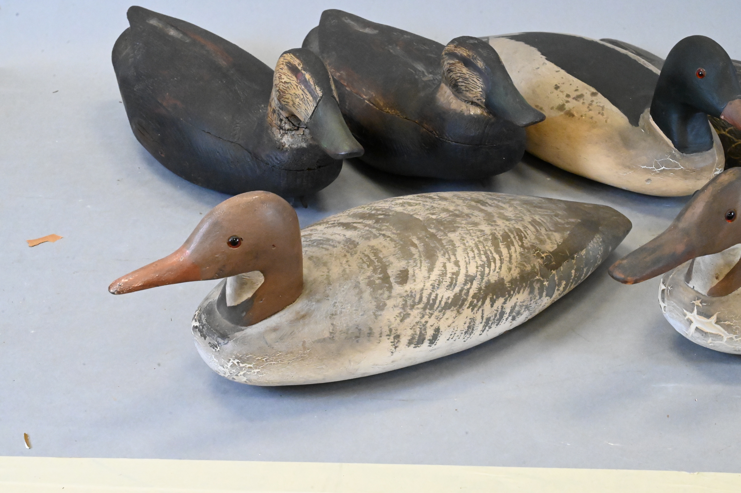 to include Roy Collins, CT black ducks rig mate pair and factory made black duck gundelfinger or benz, original paint and weight, and Rig of Mergansers, Drake and two hens of solid construction, craquelure on breasts