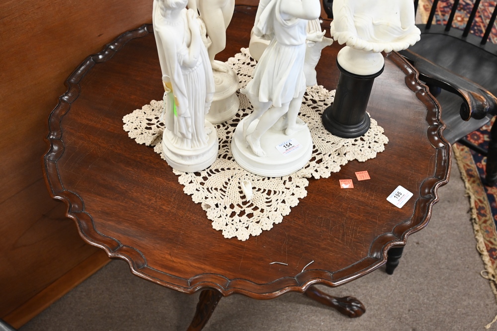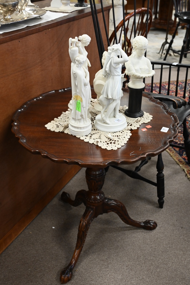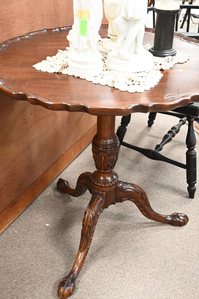 Lot 195: Henkel Harris Custom Mahogany Piecrust Tip Table, having birdcage on carved pedestal, height 28 inches, diameter 27 1/2 inches, finish cracked.