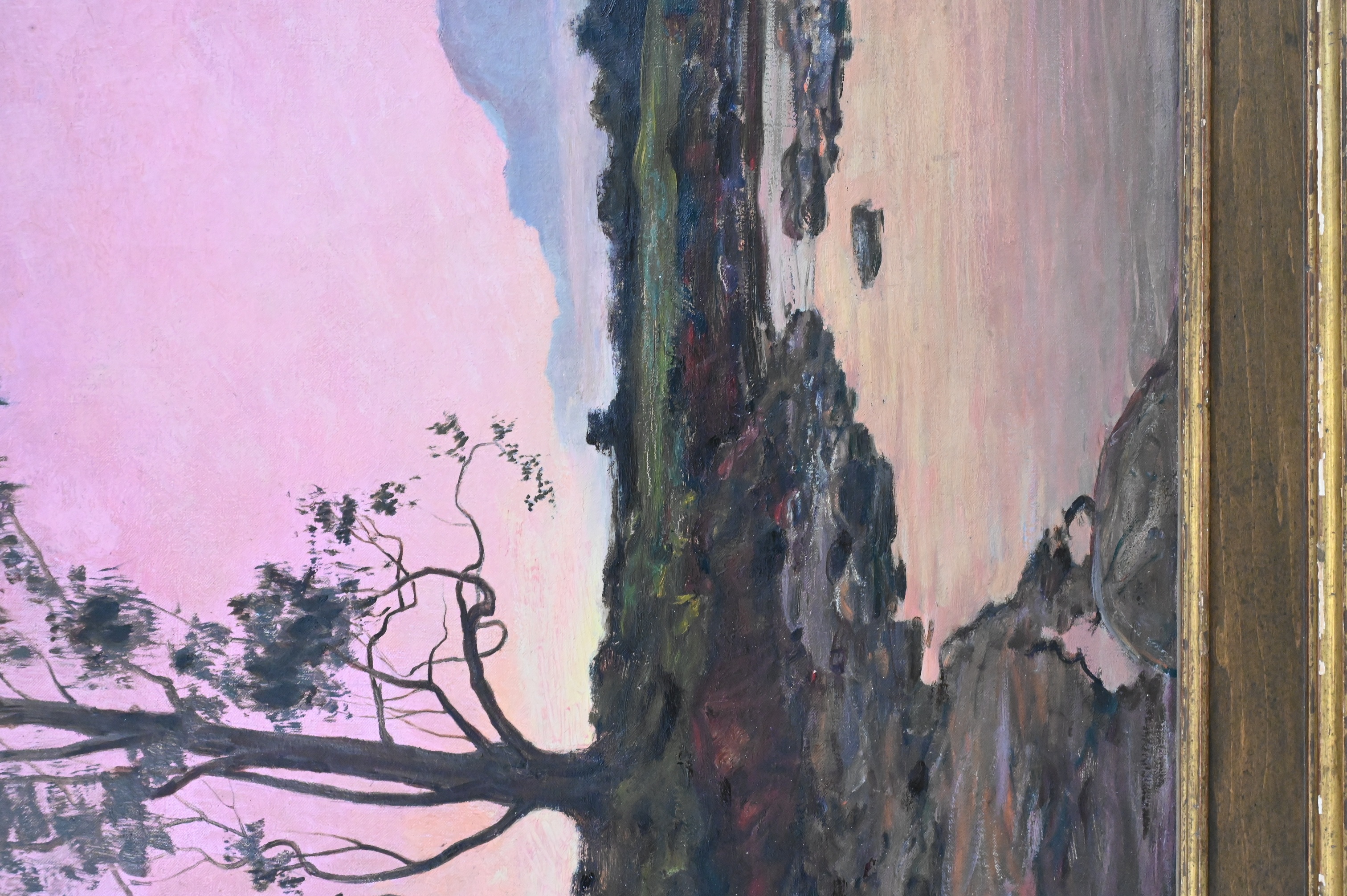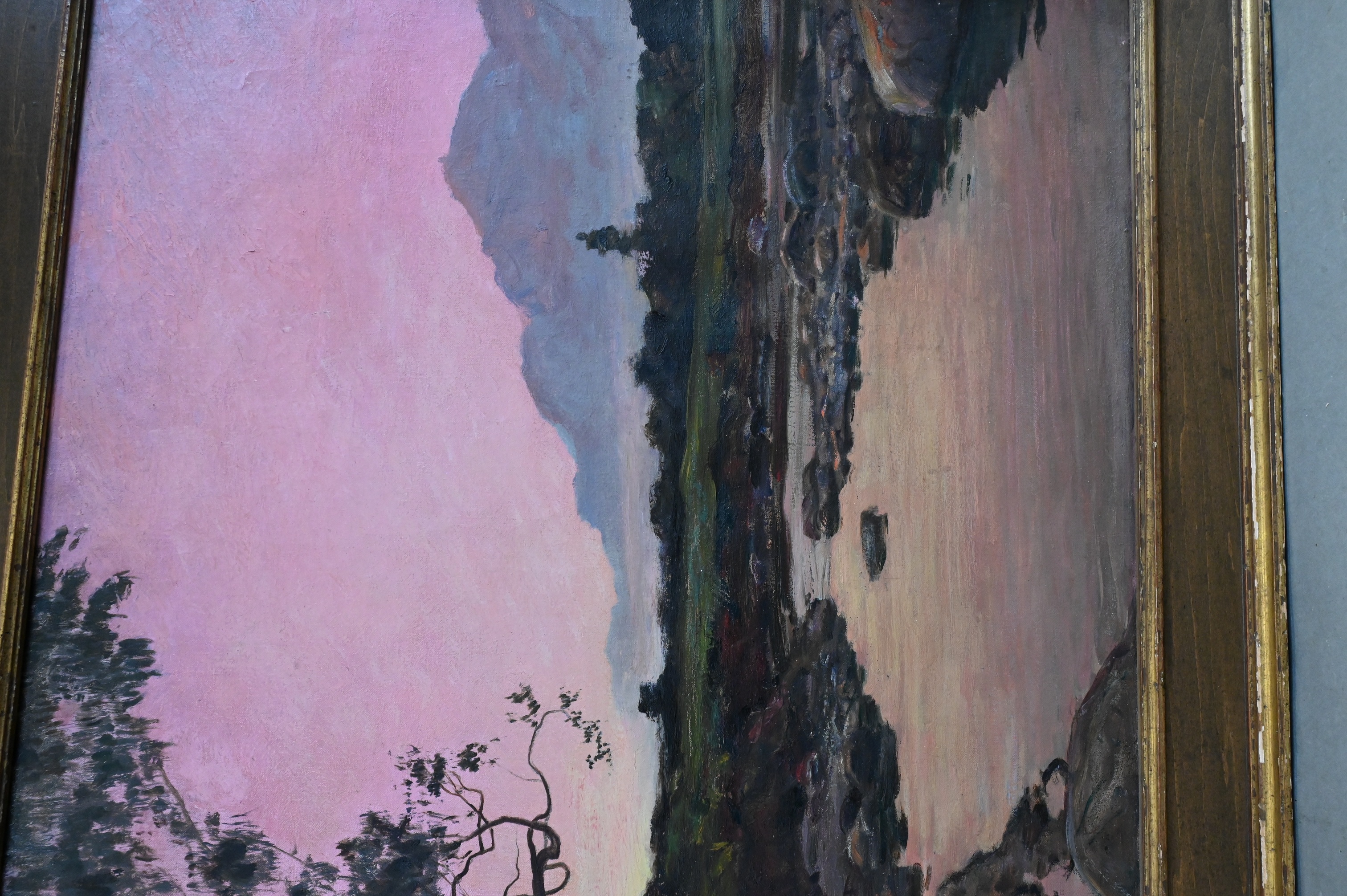 “The Pink Glow, California” Twilight landscape with stream and mountains, 1901
