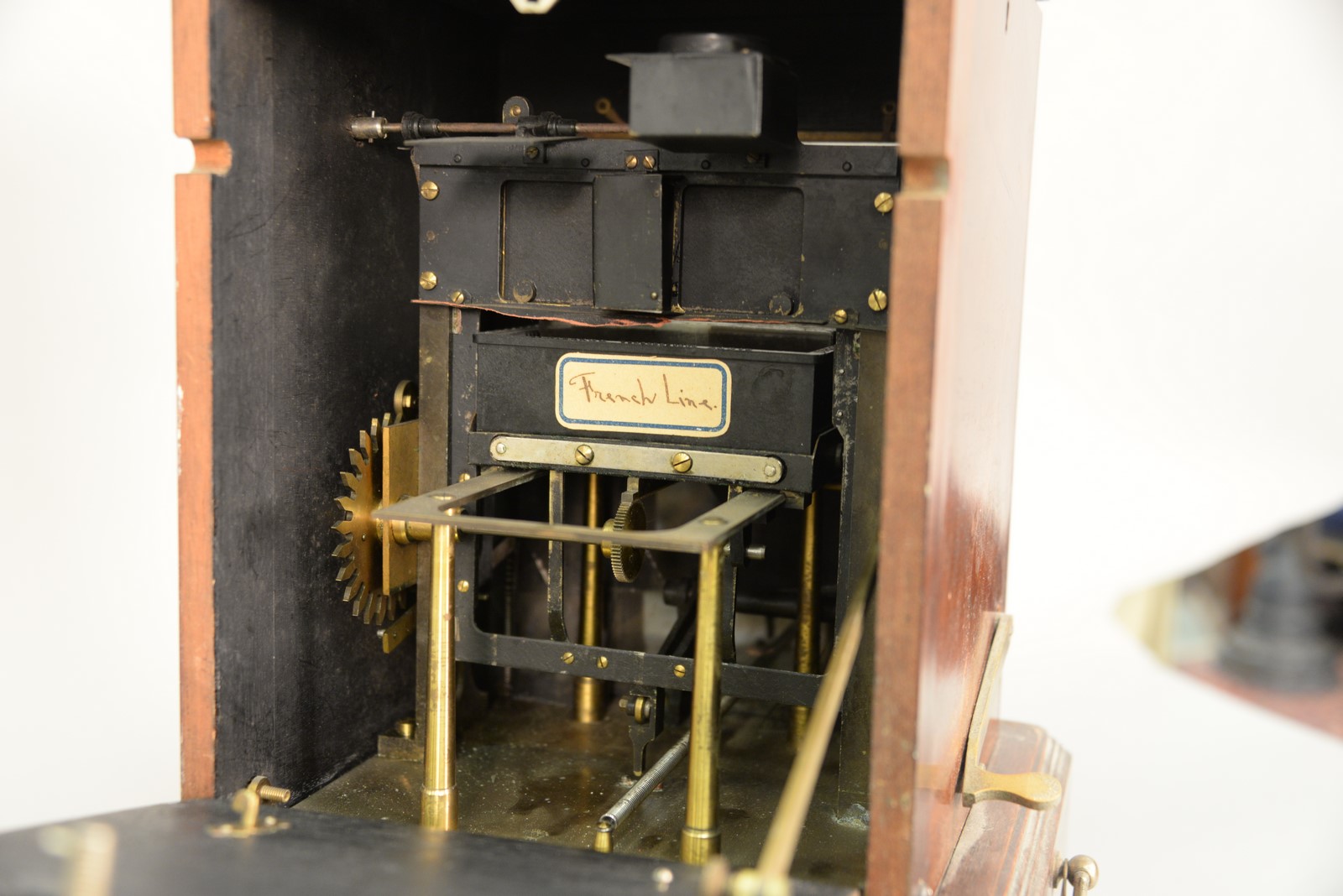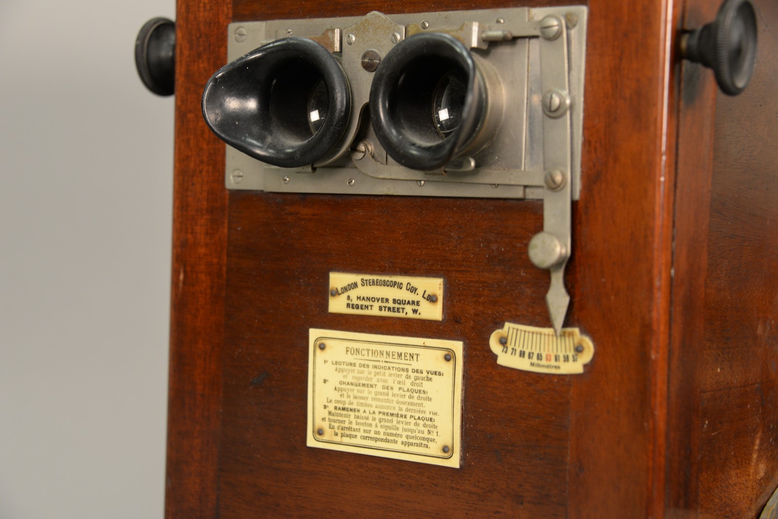 Lot 195: London Stereoscopic Coy, Ltd. revolving stereoscopic viewer with mahogany case and glass slides. ht. 19 in. wd. 10 3/4 in.