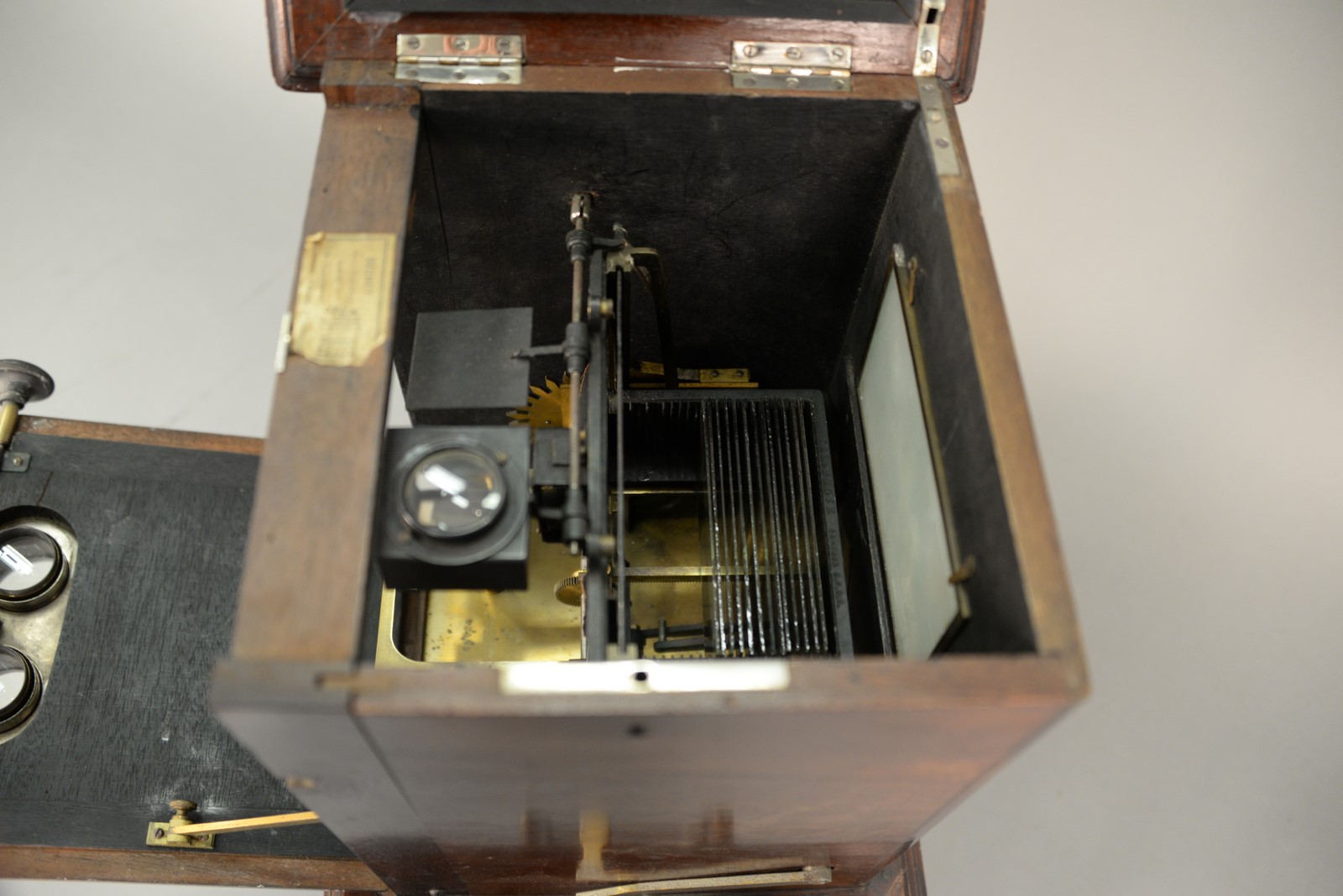 London Stereoscopic Coy, Ltd. revolving stereoscopic viewer with mahogany case and glass slides. ht. 19 in. wd. 10 3/4 in.