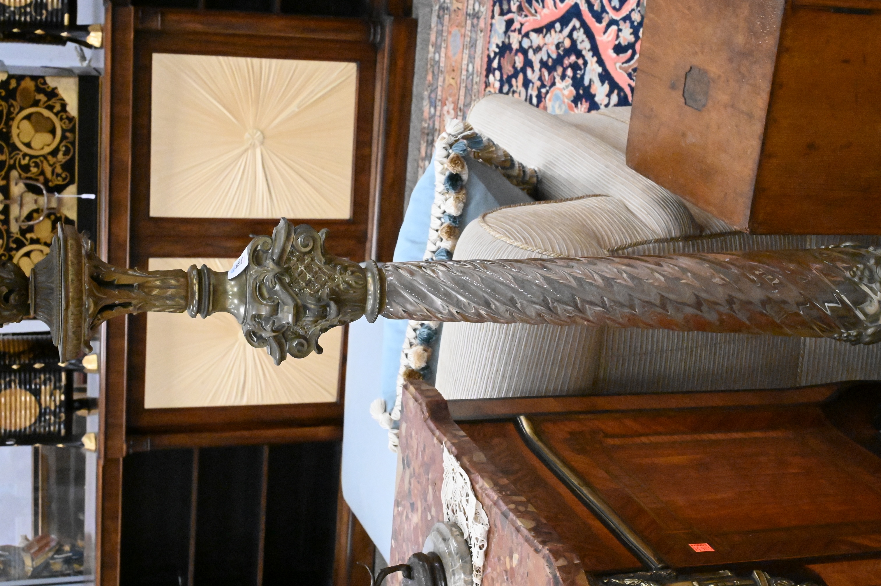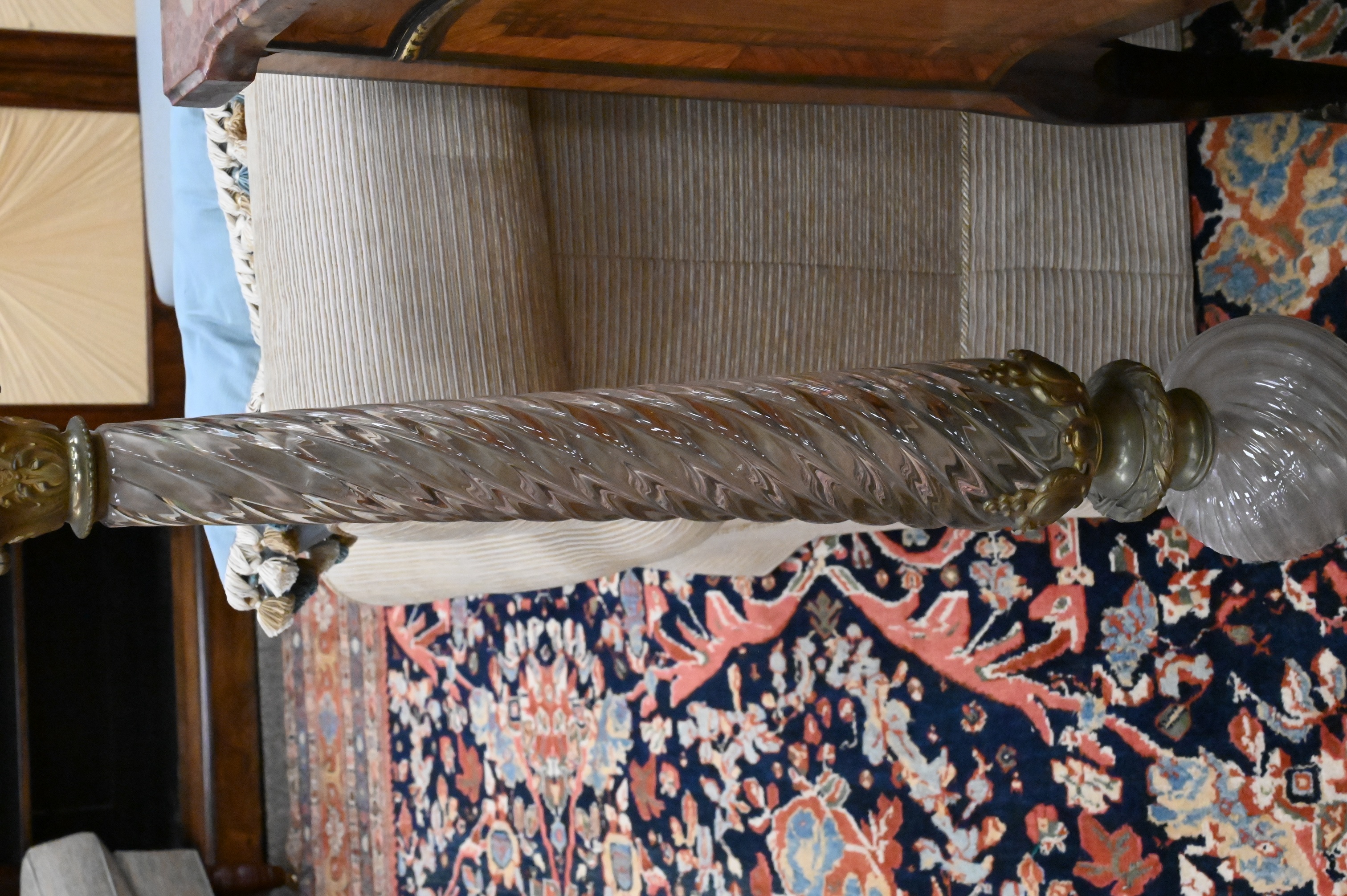 each with a spirally fluted crystal shaft mounted with finely cast bronze foliate and latticework ornament, surmounted by a finial in the form of a cluster of berries, and raised on a large circular base with gadrooned edge; one retains original glass base, the other with later wood base, early 20th century