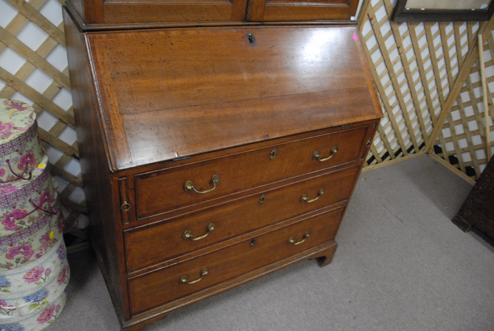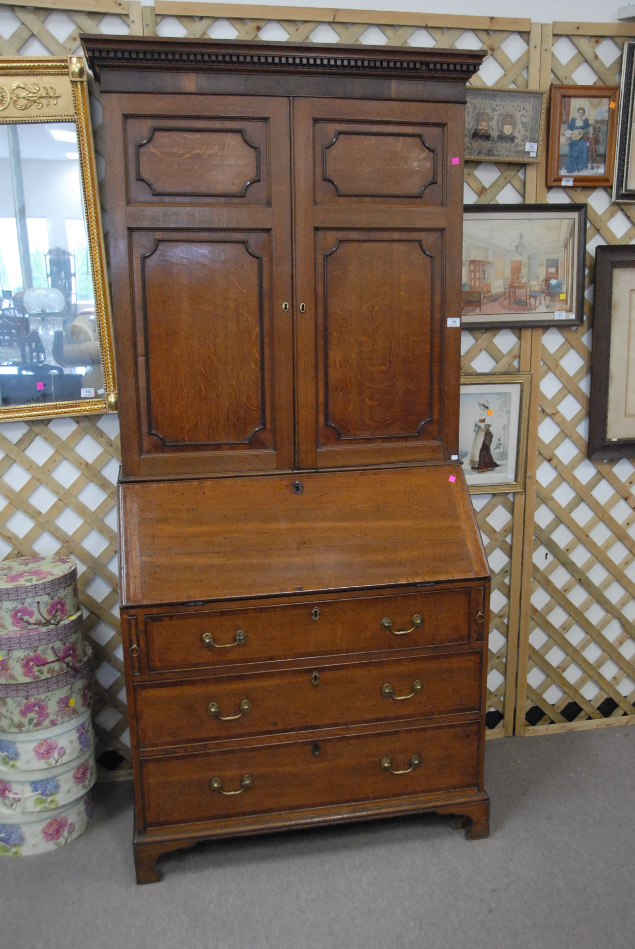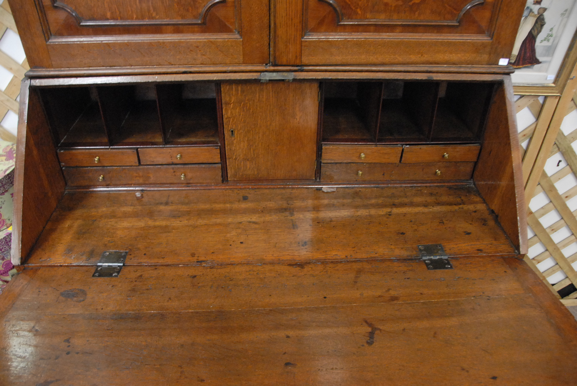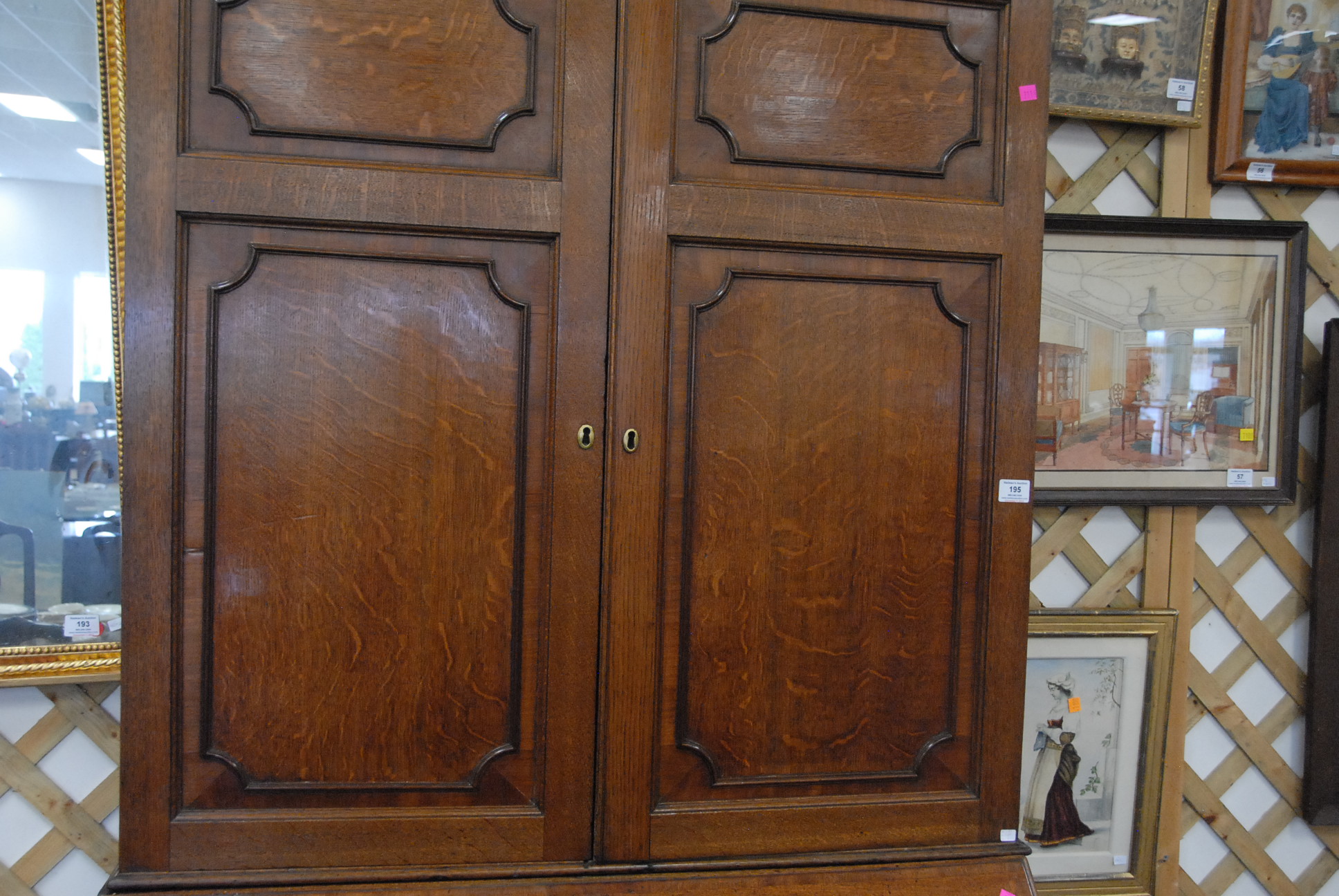 Lot 195: Oak secretary desk in two parts, upper section with two paneled doors on lower section with slant lid over four drawers on bracket b…