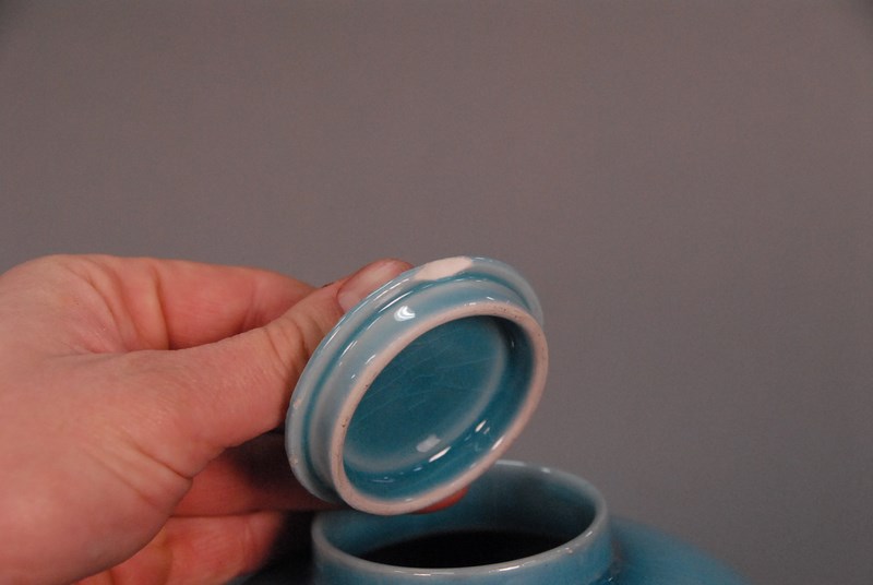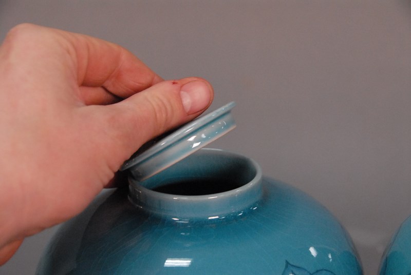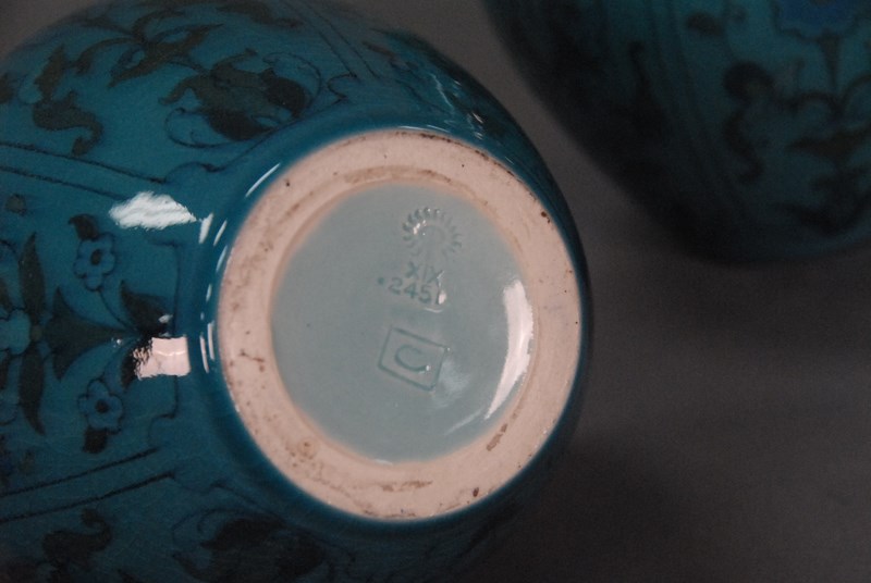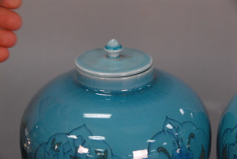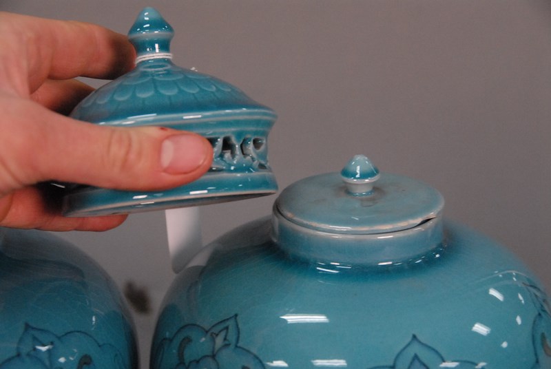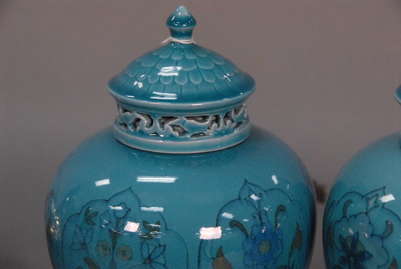 Lot 195: Pair of Rookwood jars with pagoda style reticulated covers plus inside covers signed Arthur Conant 1919, #2451 chip on inside cover. ht. 10in.