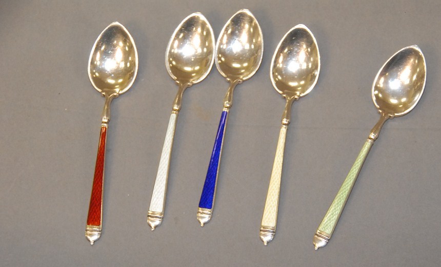 Set of five enameled sterling silver spoons, 2.9 t oz. Provenance: Estate of Judy Gengras McDonough of West Hartford, CT.