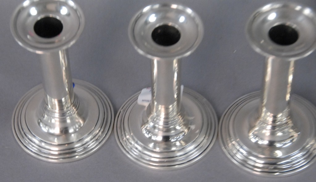 Set of four Tiffany and Company sterling silver candlesticks with round bases. 17.8 troy oz.
