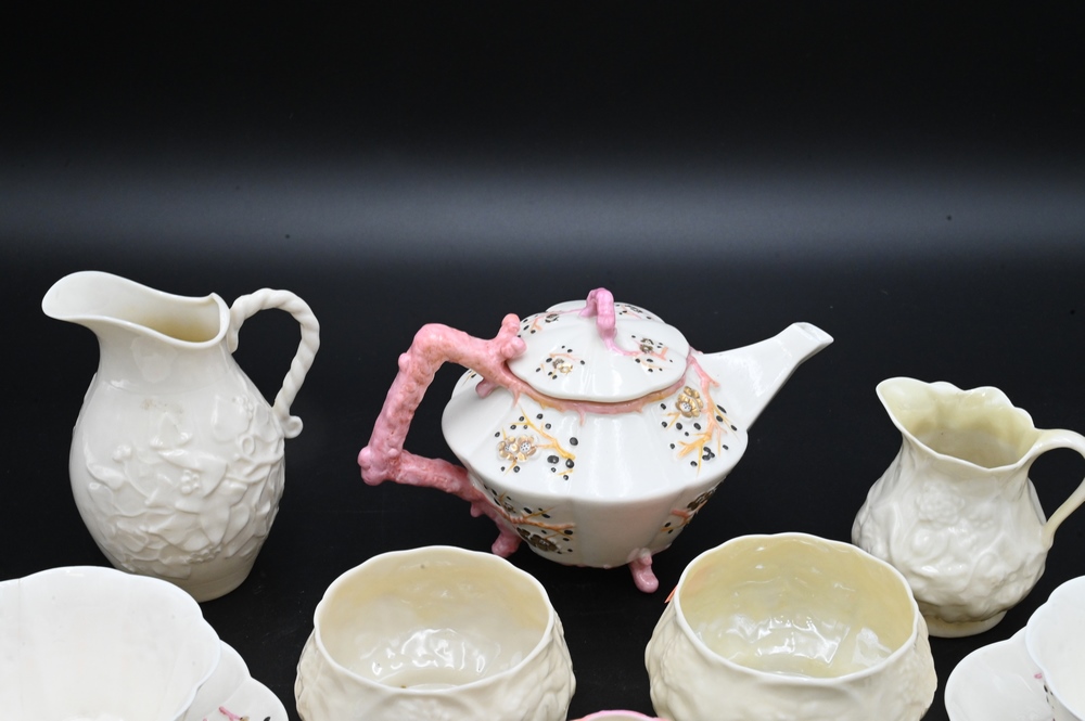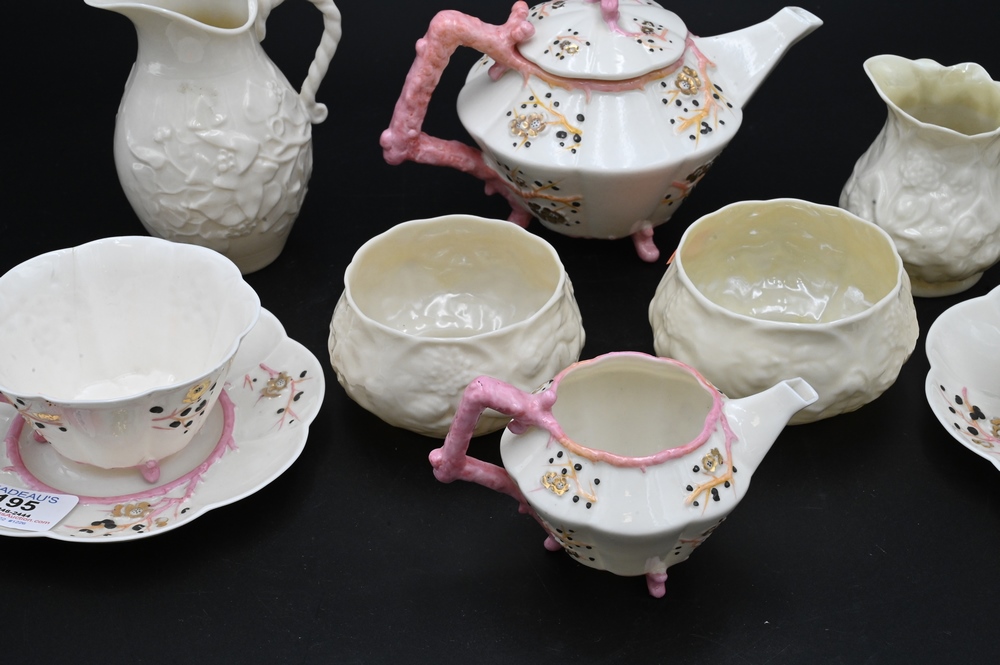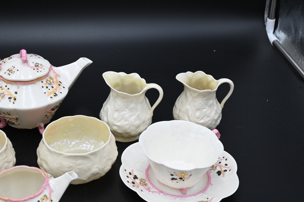 Lot 195: Six Piece Belleek Thornberry Pink Set, pink with black mark; along with five piece creamer and sugar set having black mark, tallest 4 1/2 inches. Provenance: Collections of Norma Reilly, New Jersey.