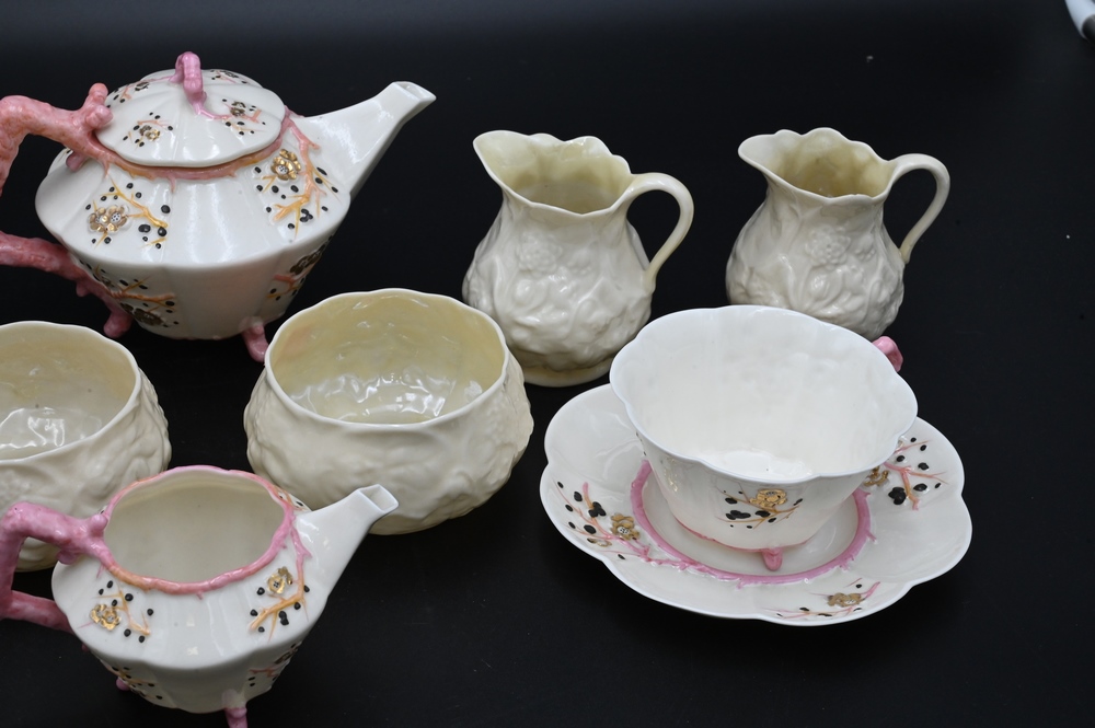 Six Piece Belleek Thornberry Pink Set, pink with black mark; along with five piece creamer and sugar set having black mark, tallest 4 1/2 inches. Provenance: Collections of Norma Reilly, New Jersey.