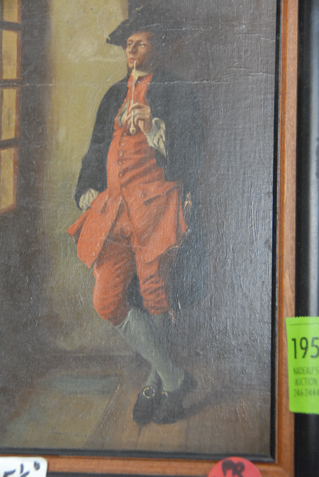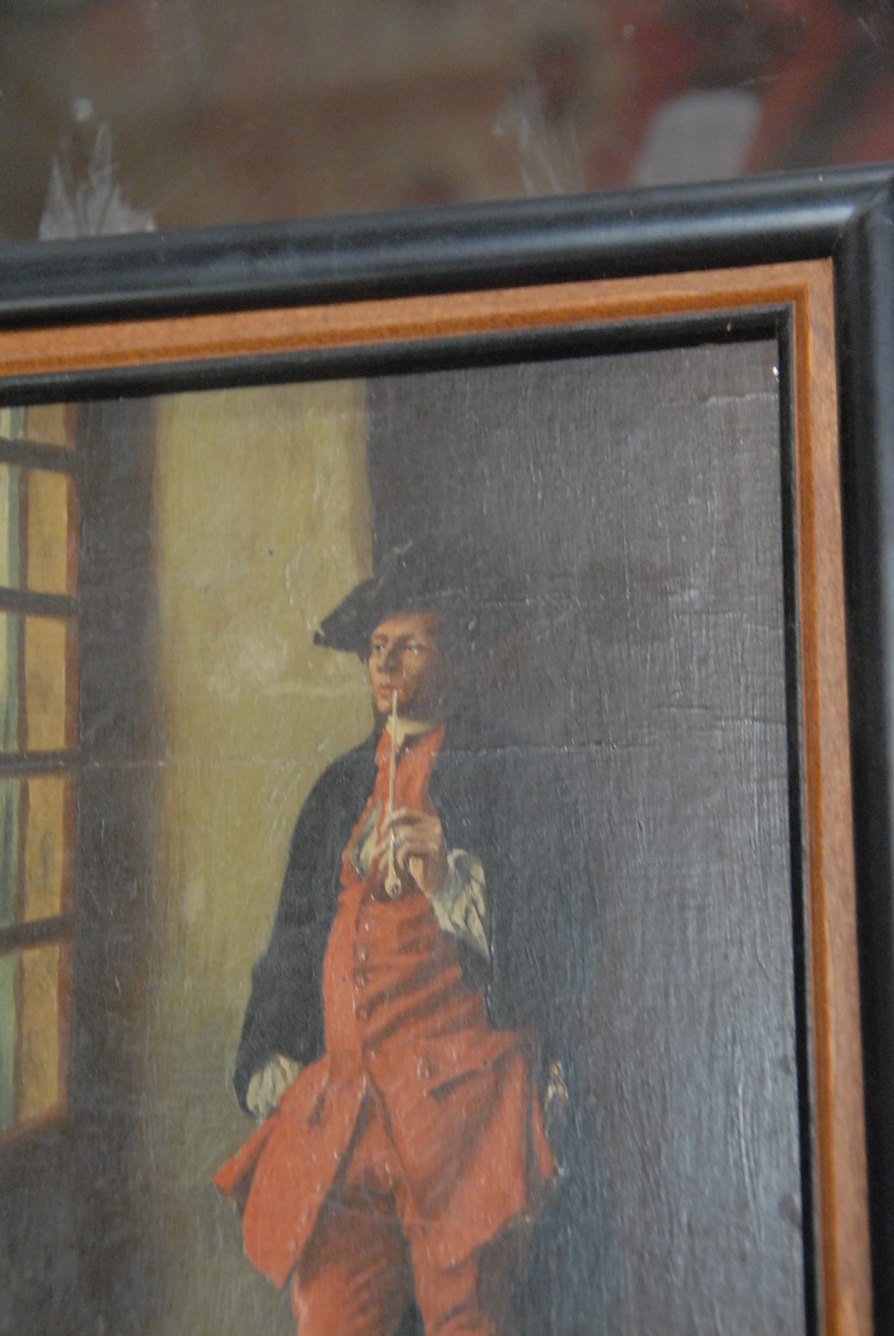 Small oil on board of a man smoking a clay pipe, pencil writing on reverse.