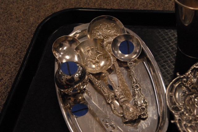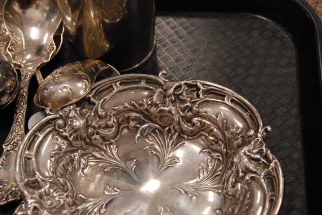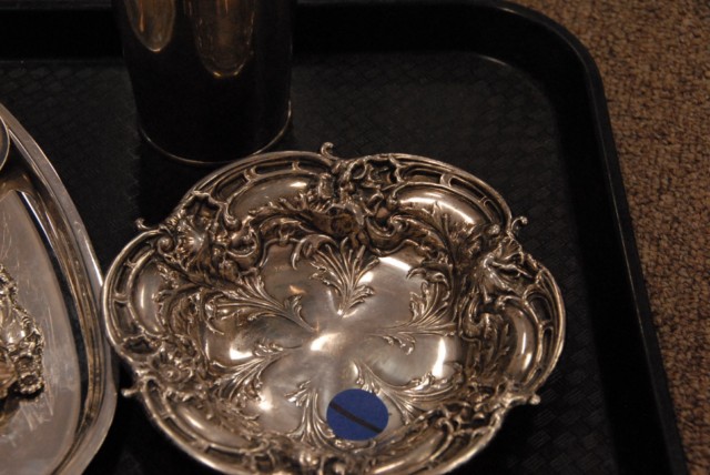 Sterling silver and plated lot including small oval tray, dish, cup, tea strainer and 4 spoons.