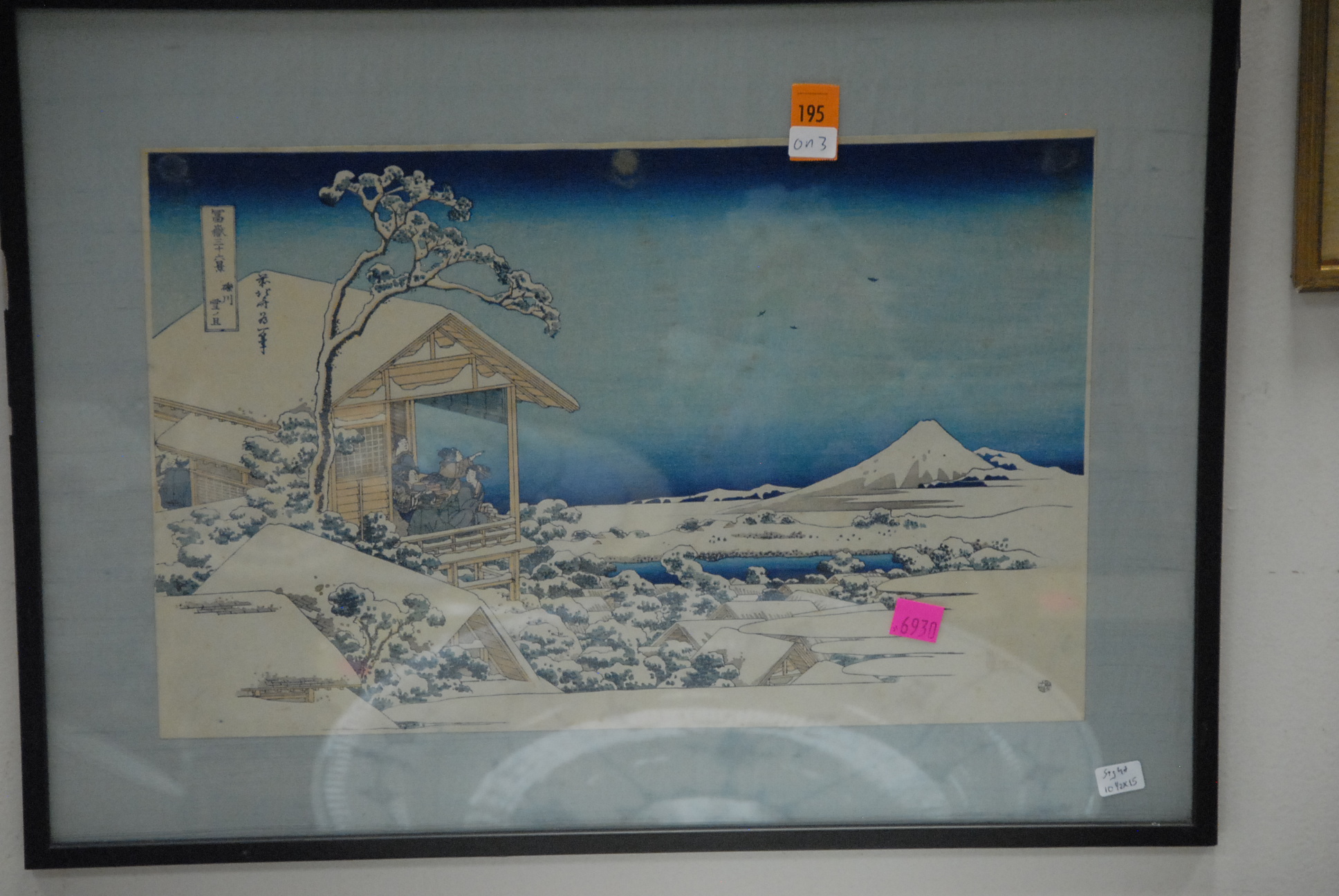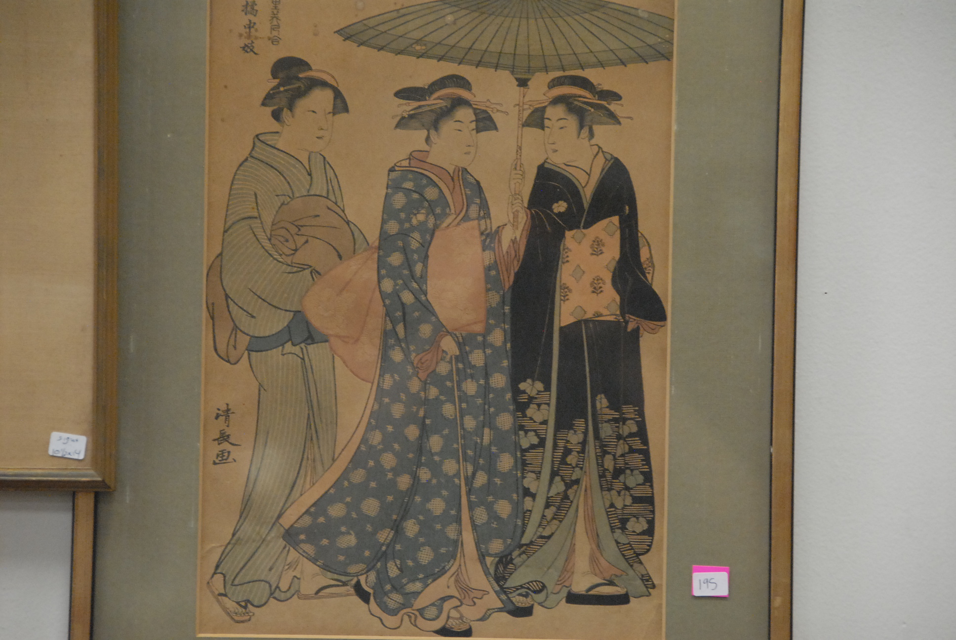 Three Japanese framed woodblock prints, 9 x 13, 15 x 10, & 10 x 15.