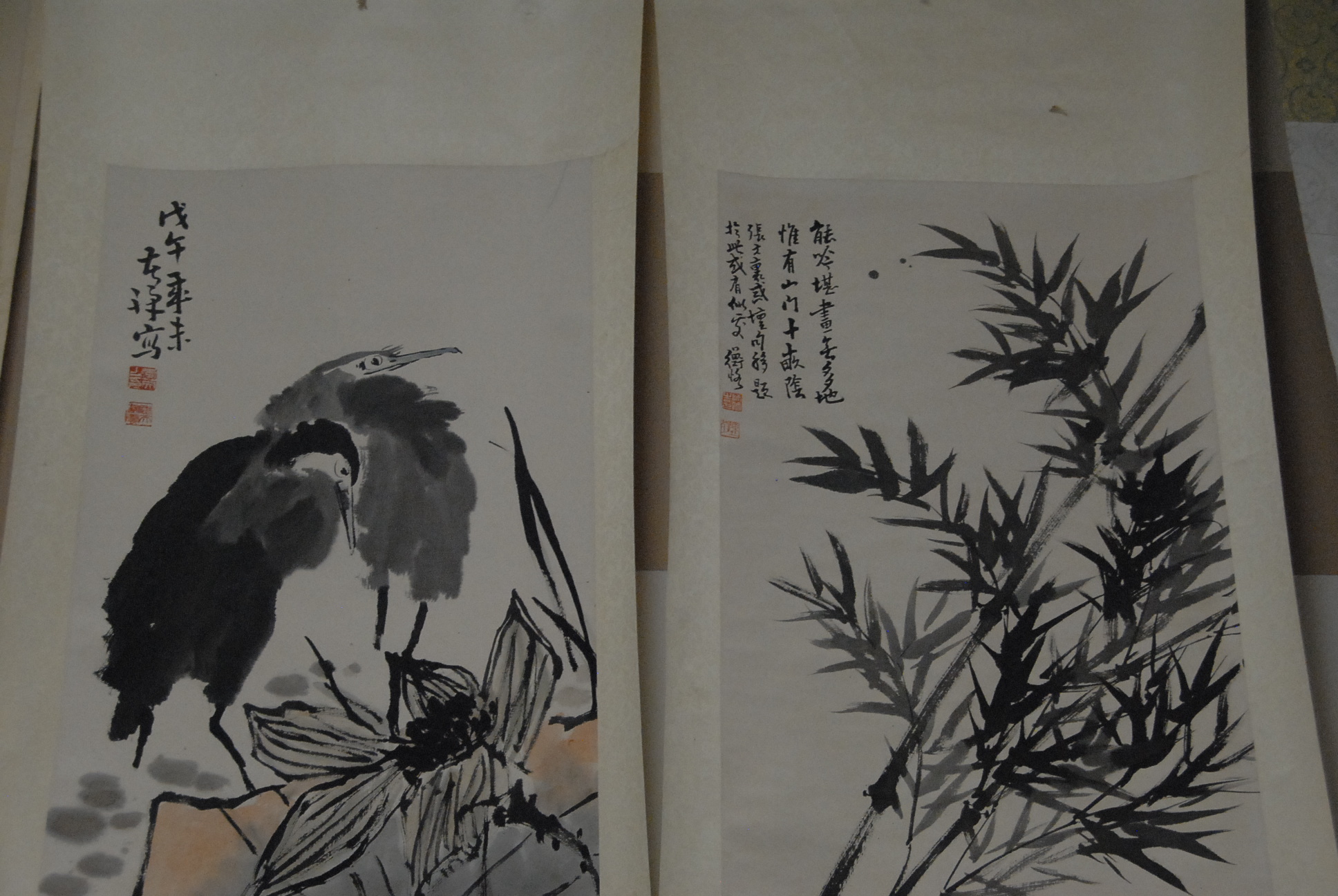 Two Oriental scrolls one watercolor of cranes and one watercolor of bamboo, both 38 x 17.