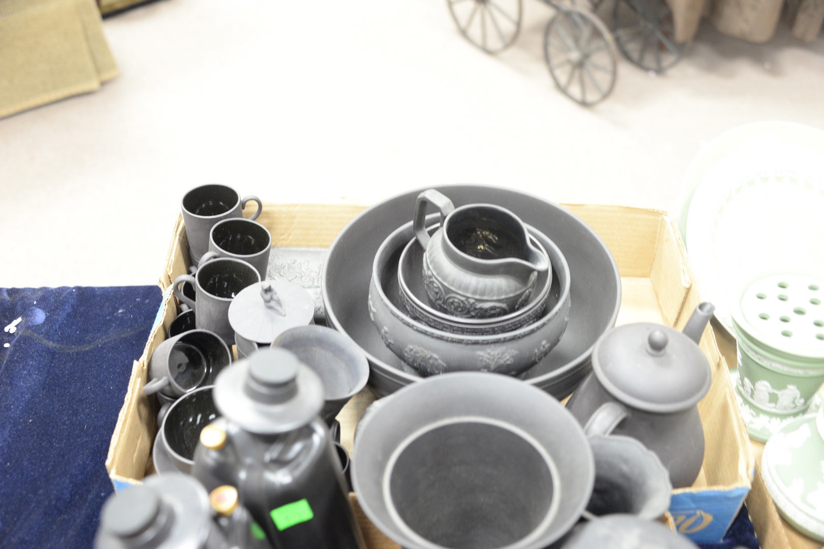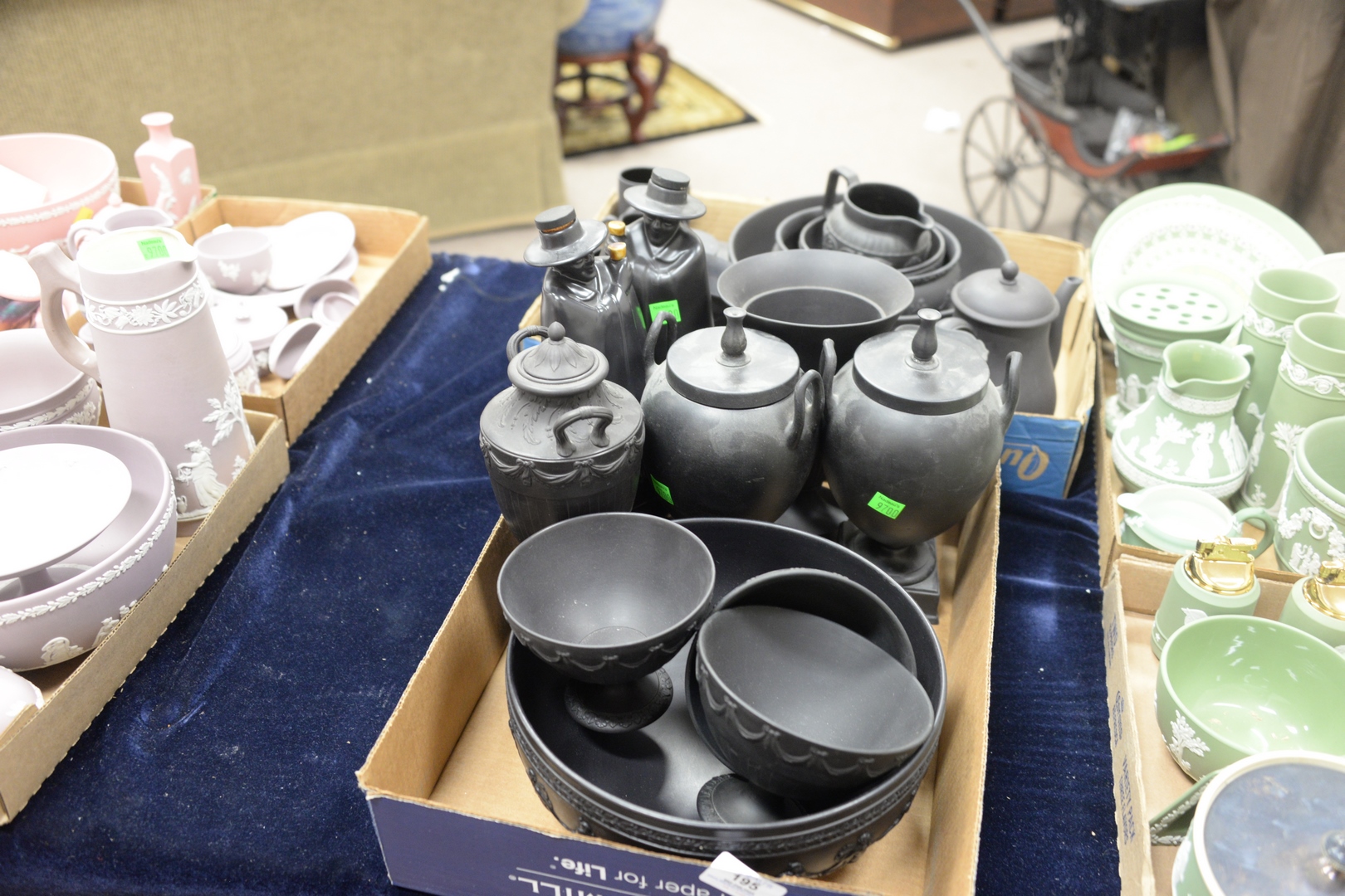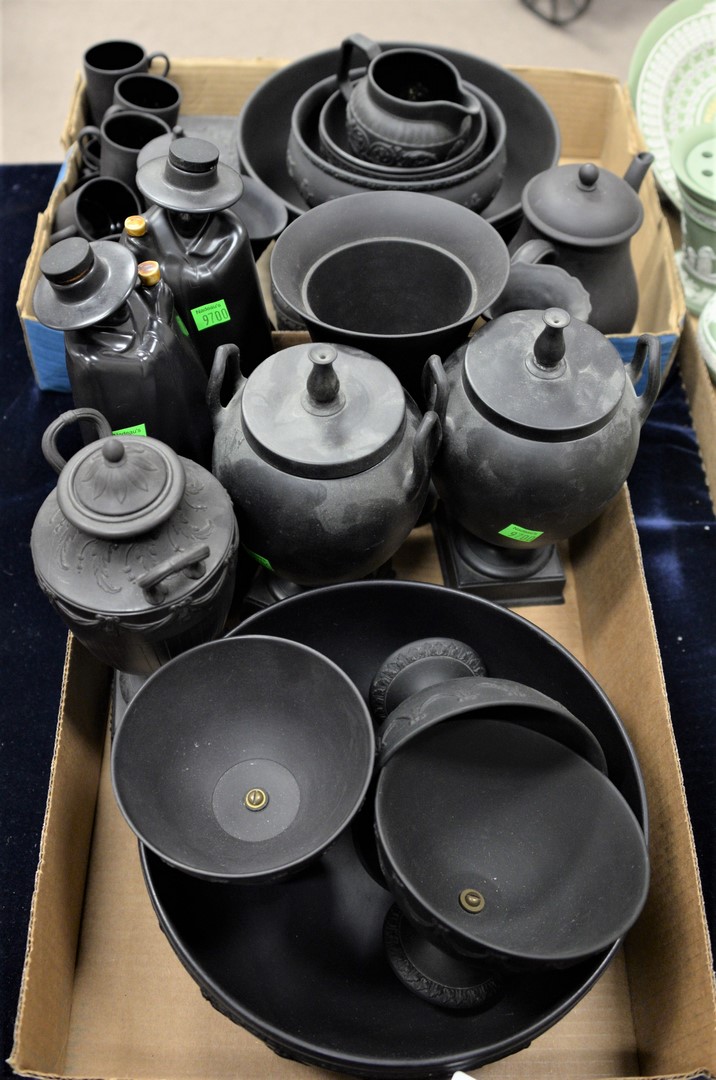 Lot 195: Two Tray Lots of Wedgwood Black Basalt, to include a pair of urns, bowls, cups, saucers, teapot, urns, etc. Provenance: Estate of James Wadhams.