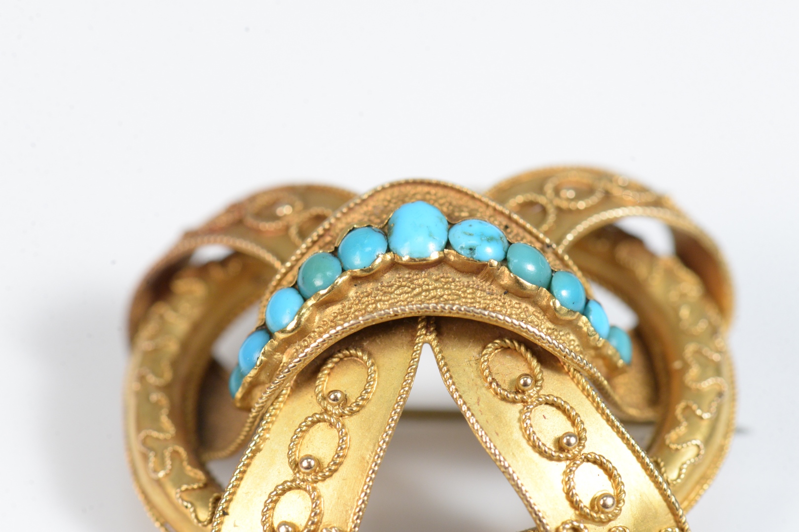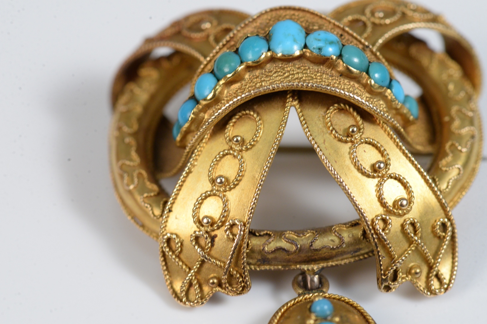 14 Karat Gold Victorian Brooch set with turquoise, hung with small hair locket 10 grams