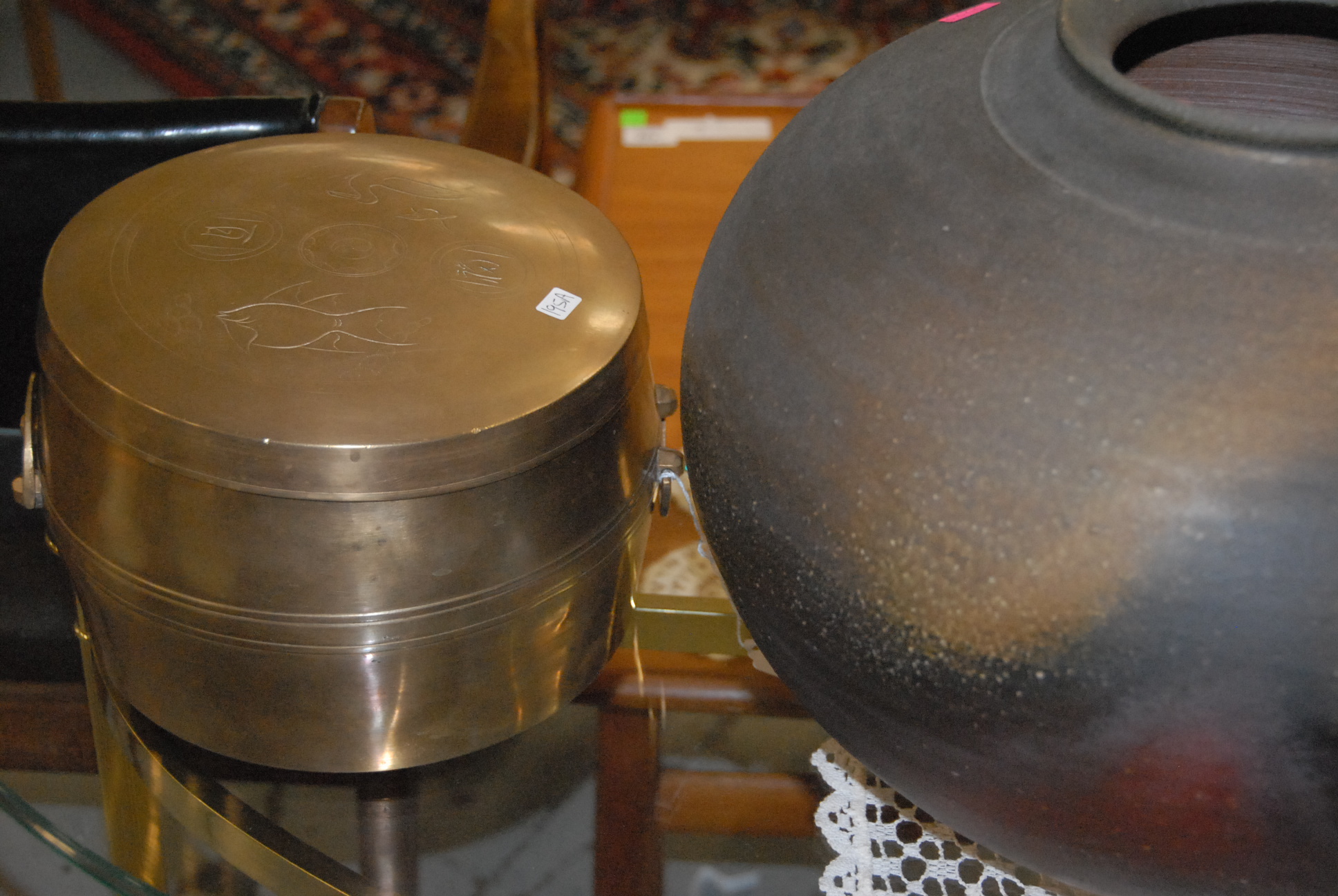 Turned brass covered pot, large ceramic pot signed on bottom, and square stand.