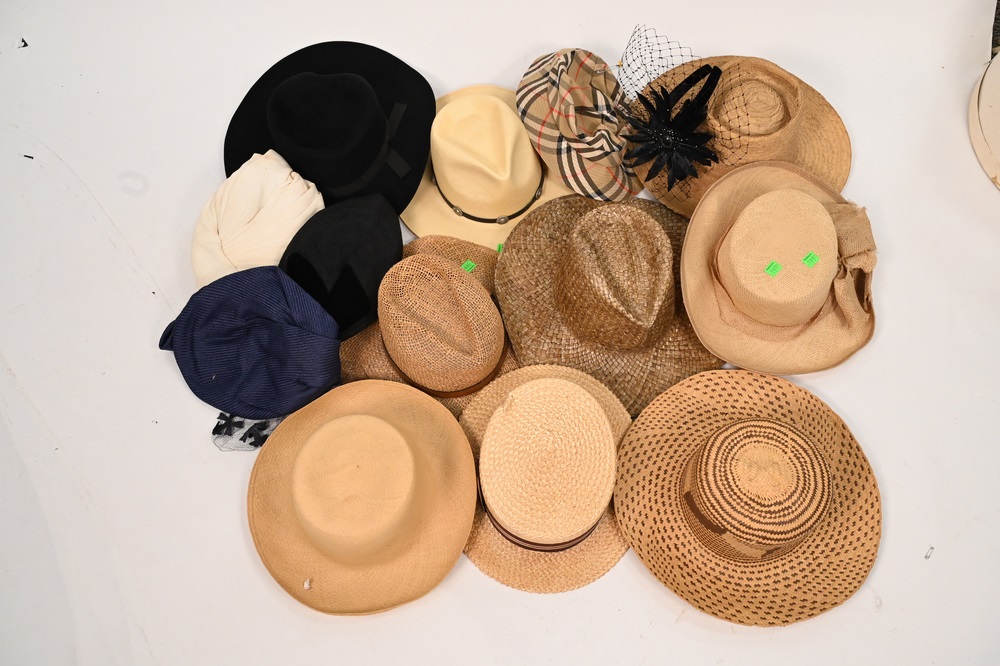 13 Piece Lot of Vintage and Contemporary Hats, to include womens vintage, mens Cavanaugh Boater, classic Burberry (size 5), straw cowboys, etc., various sizes, some breaks in straw hats, Burberry hardly worn.