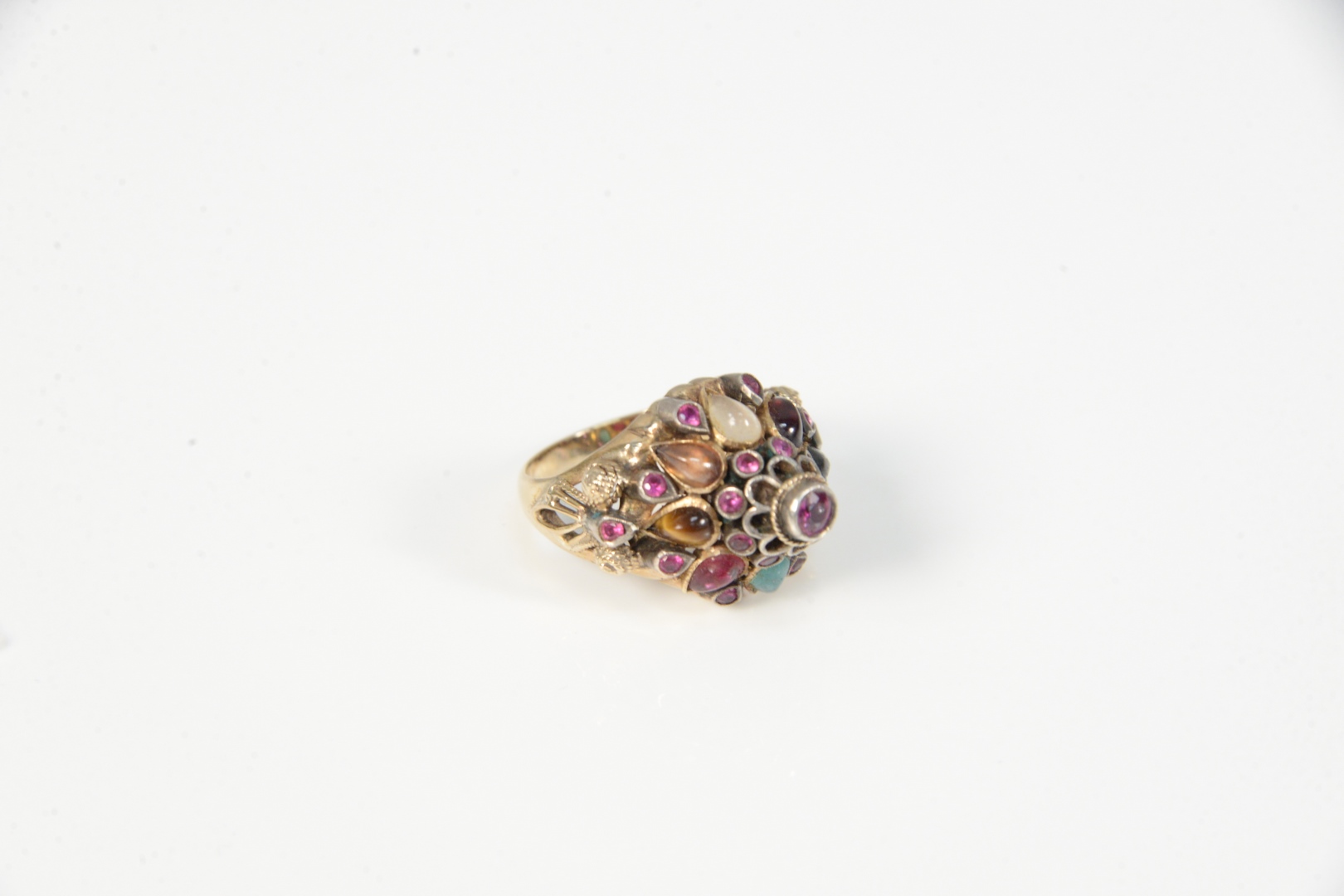 18K gold Thai princess ring set with various stones, ruby, sapphire, moonstone, topaz, garnet, agate, etc., size 7.5, 9.3 gr. Provenance: Estate of Dr. Thomas & Alice Kugelman, Bloomfield, Connecticut.