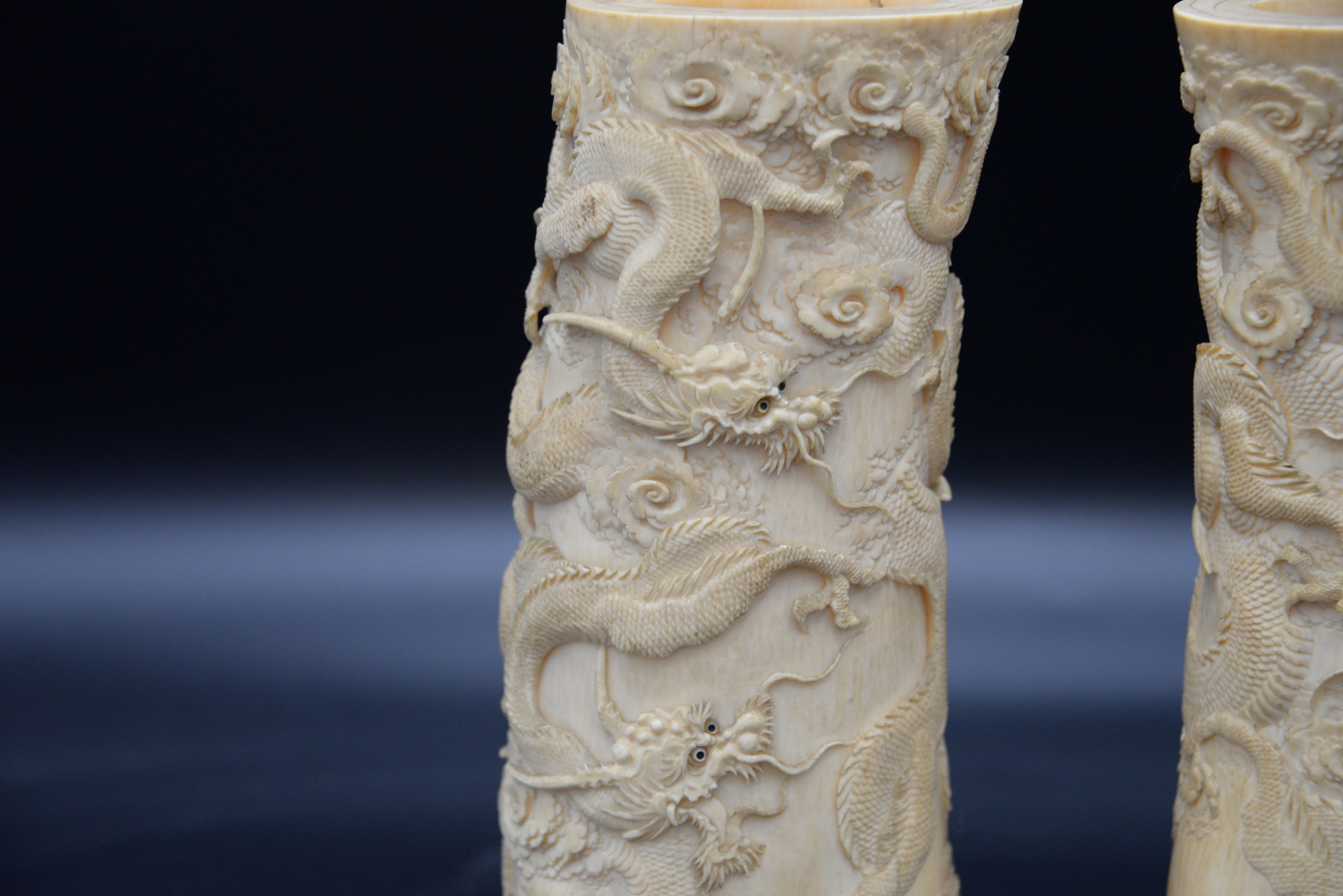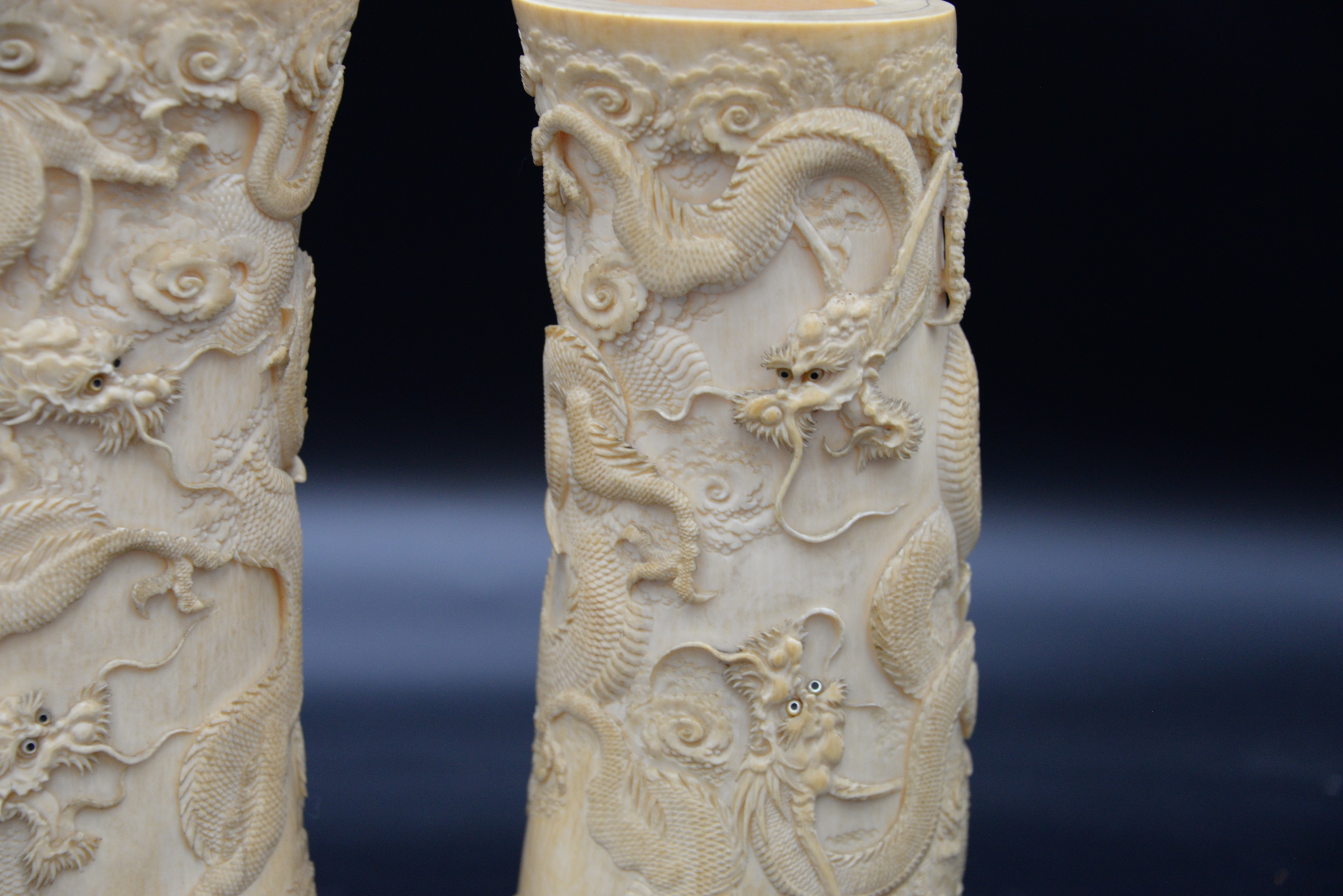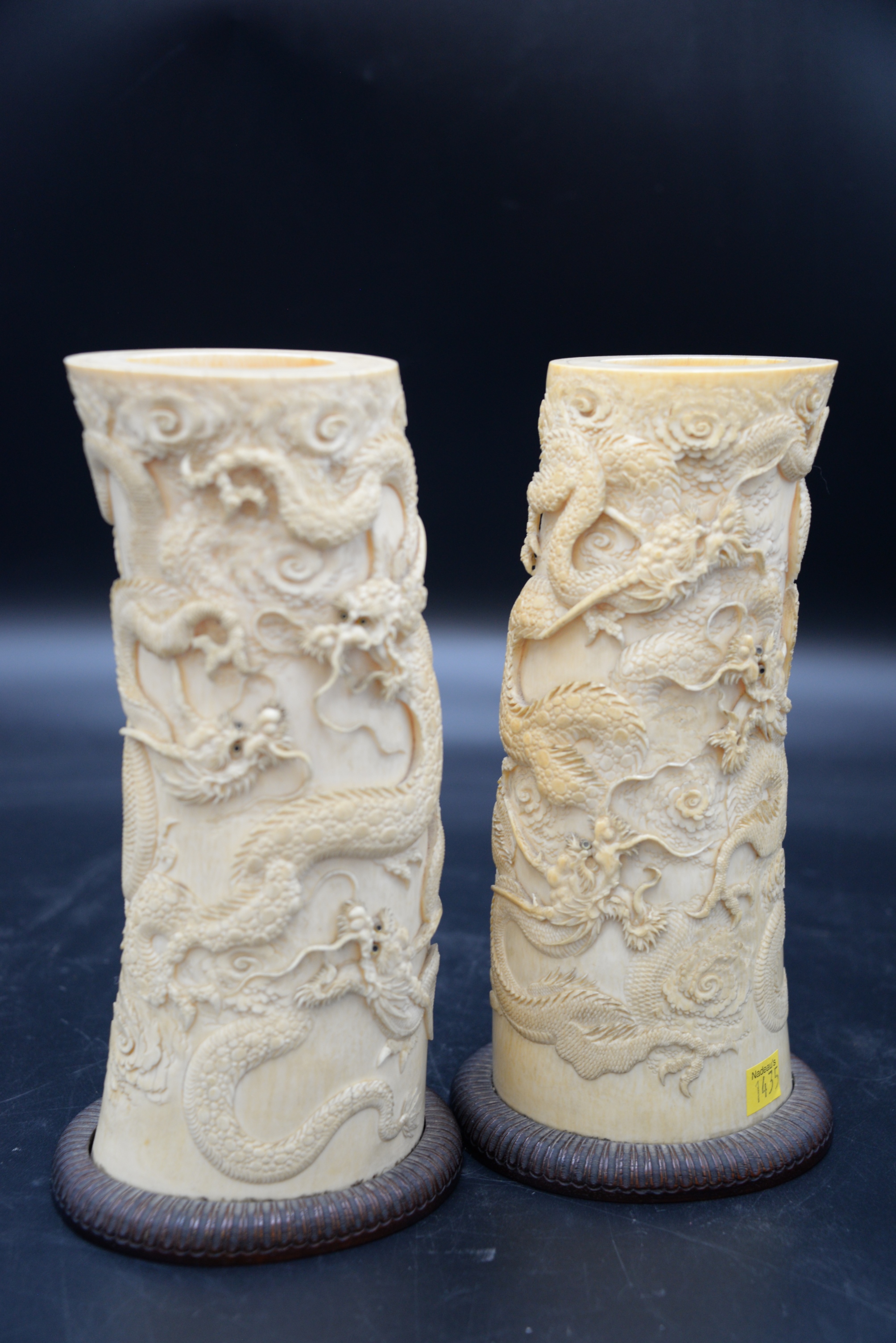 A Pair of 19th Century Dragon Vases, carved with multiple three claw dragons on wood bases, height 10 inches.