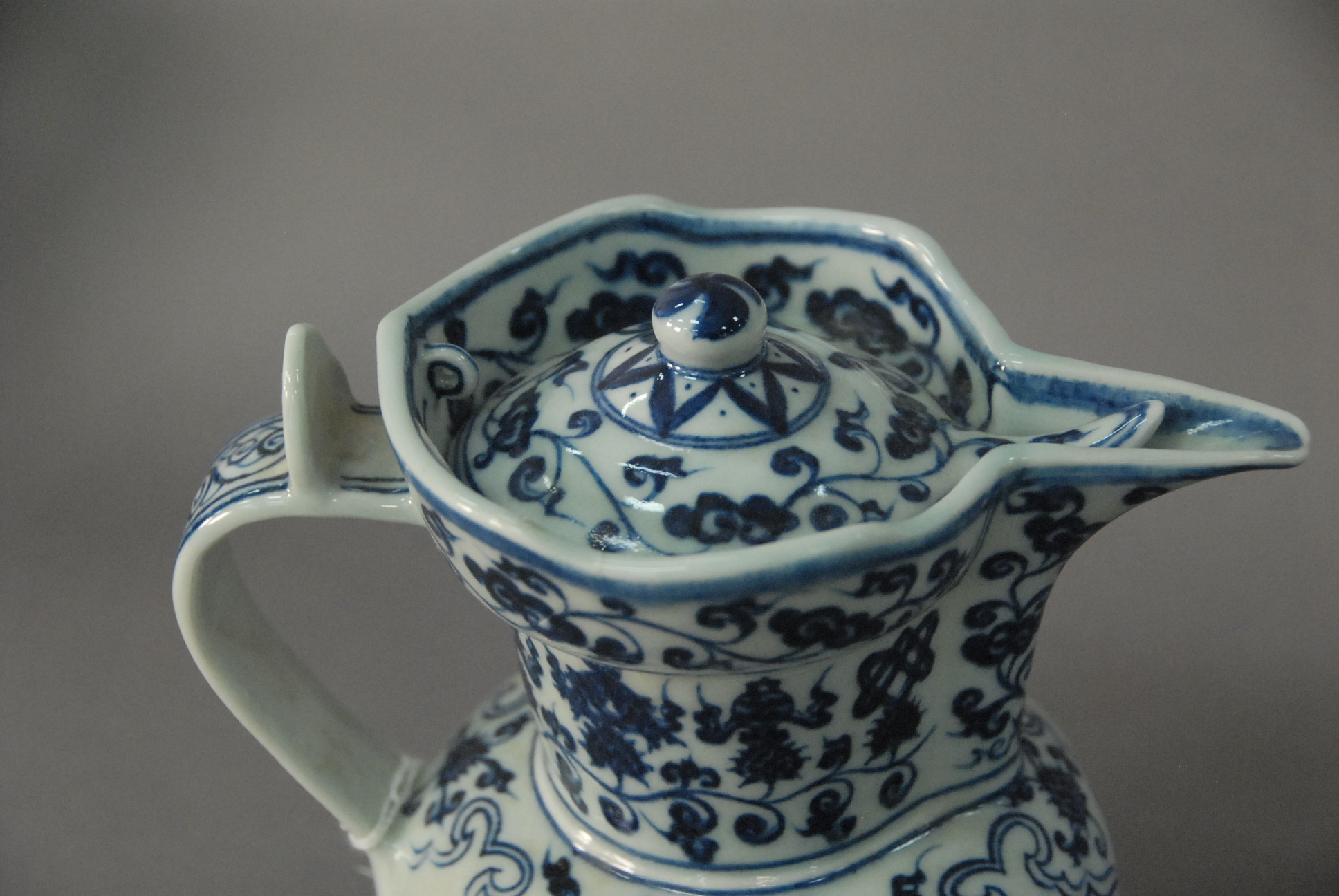 Lot 196: Blue and white porcelain teapot having scrolling flowers and vine decoration with cover and six character mark on base, ht. 7in.