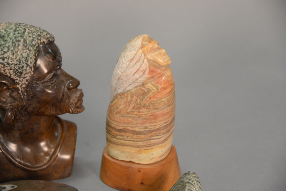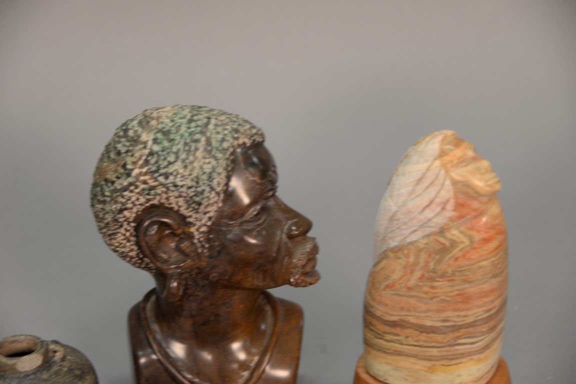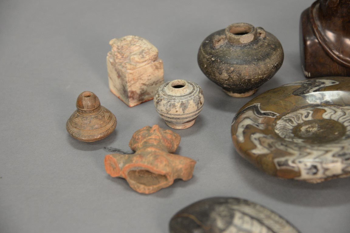 Lot 196: Box lot of early vases, partial figures, stone seal, two busts, and fossils. vases: ht. 1 1/2 in. to 2 3/4 in.