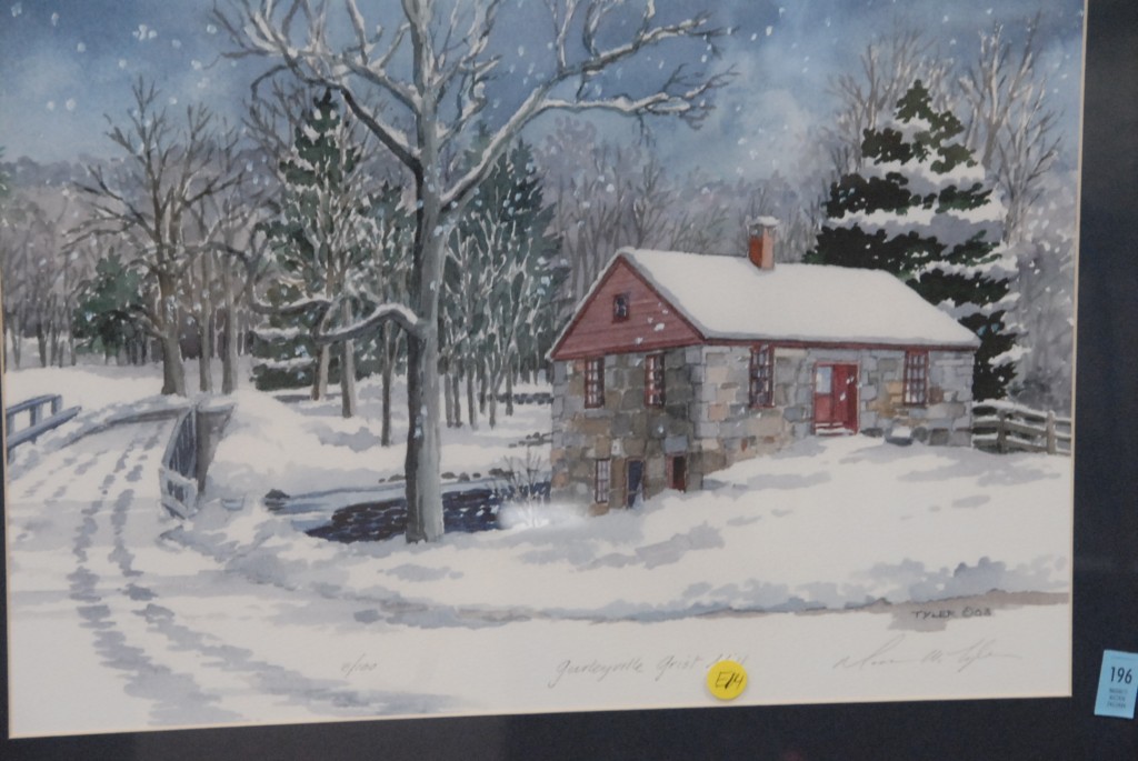 Four piece lot watercolor of Gurleyville Grist Mill signed Tyler, Victorian frame, print of photo, and small mirror.