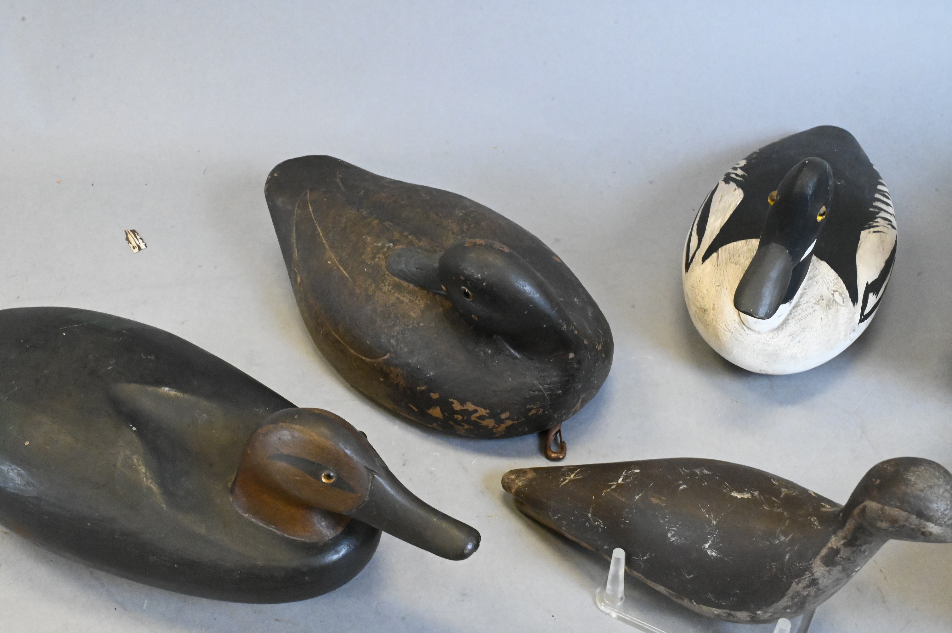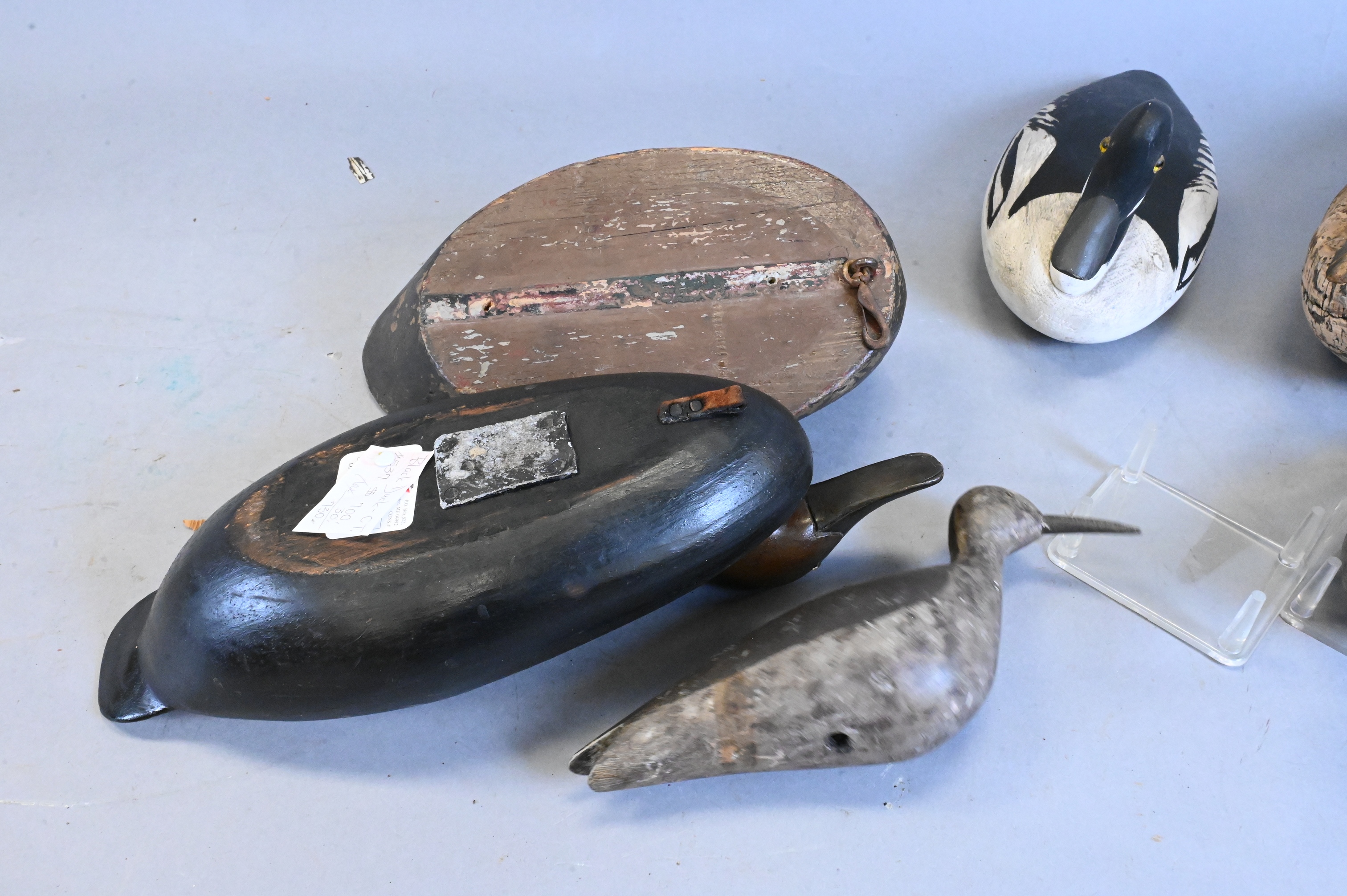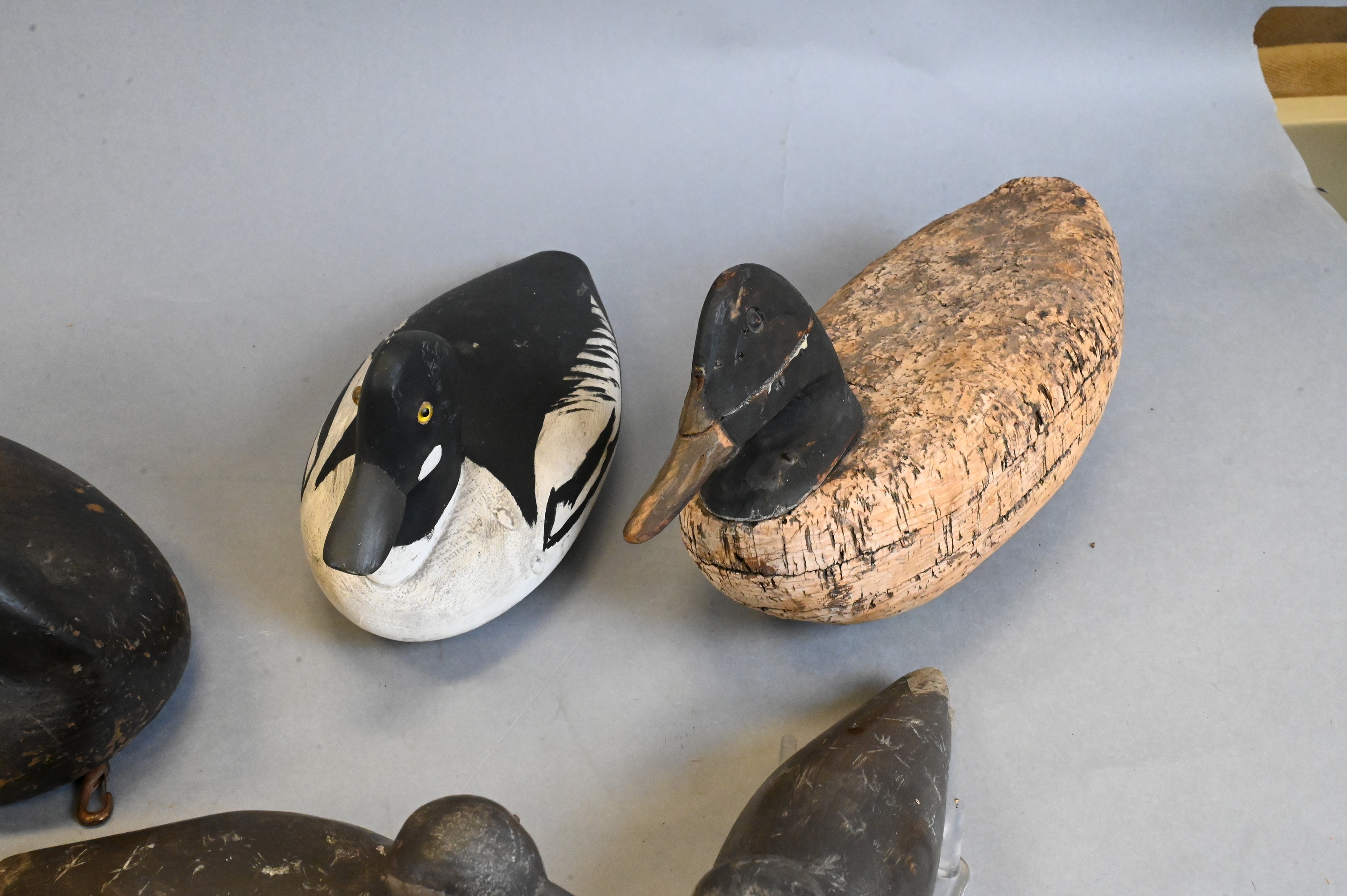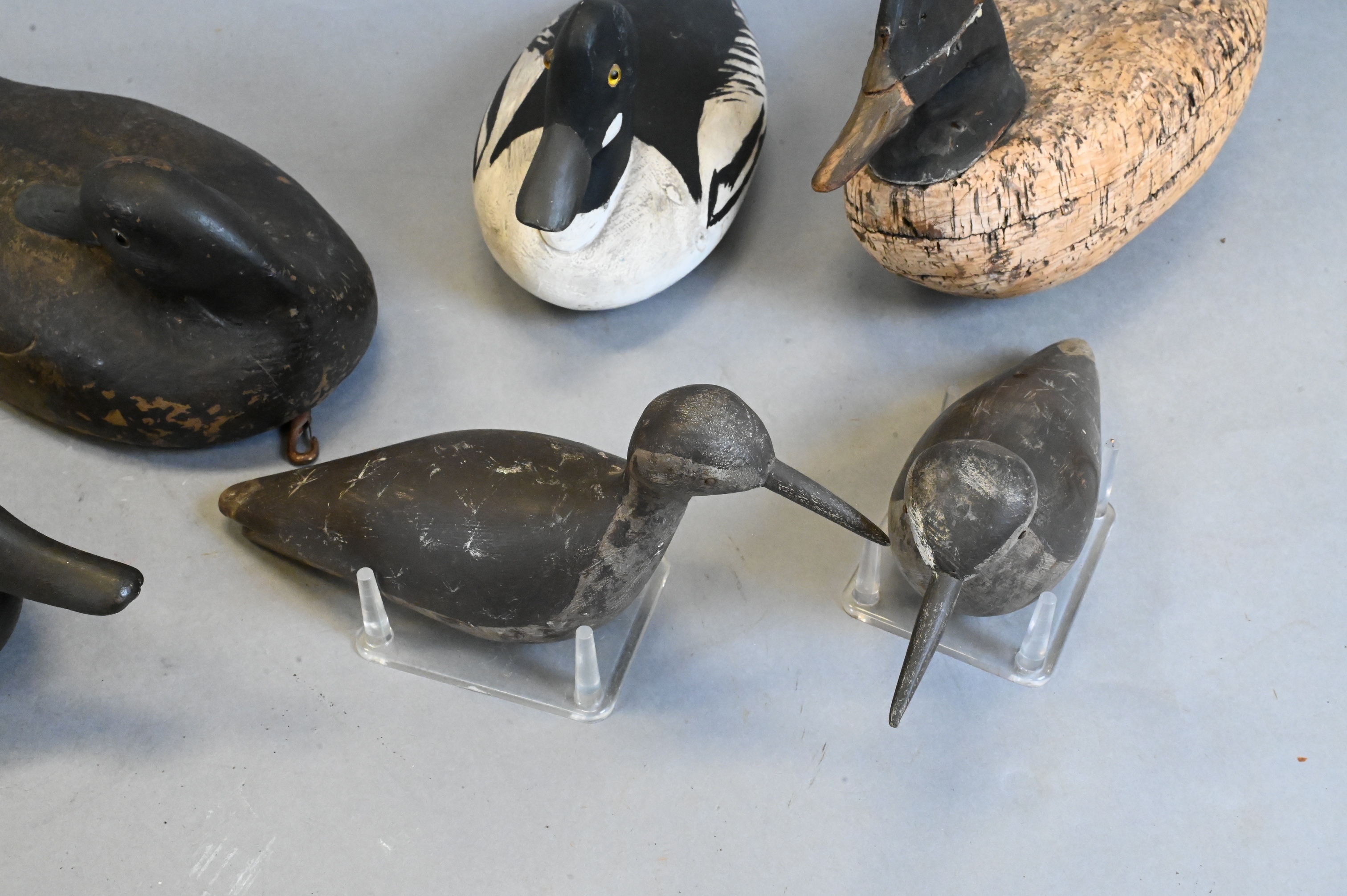 to include Preener or Sleeping broad bill hen New York or Midwest, Goldeneye Drake with lime tie, appears to be original paint Maine or Maritimes Canada, Long Island Cork decoy possibly Gene Welles, redhead cracked through head, original weights, structurally sound body, carved eye, New Jersey Merganser hen style of Harry Shourds inlet weight, and two shore birds, New Jersey or New England liley bills replaced