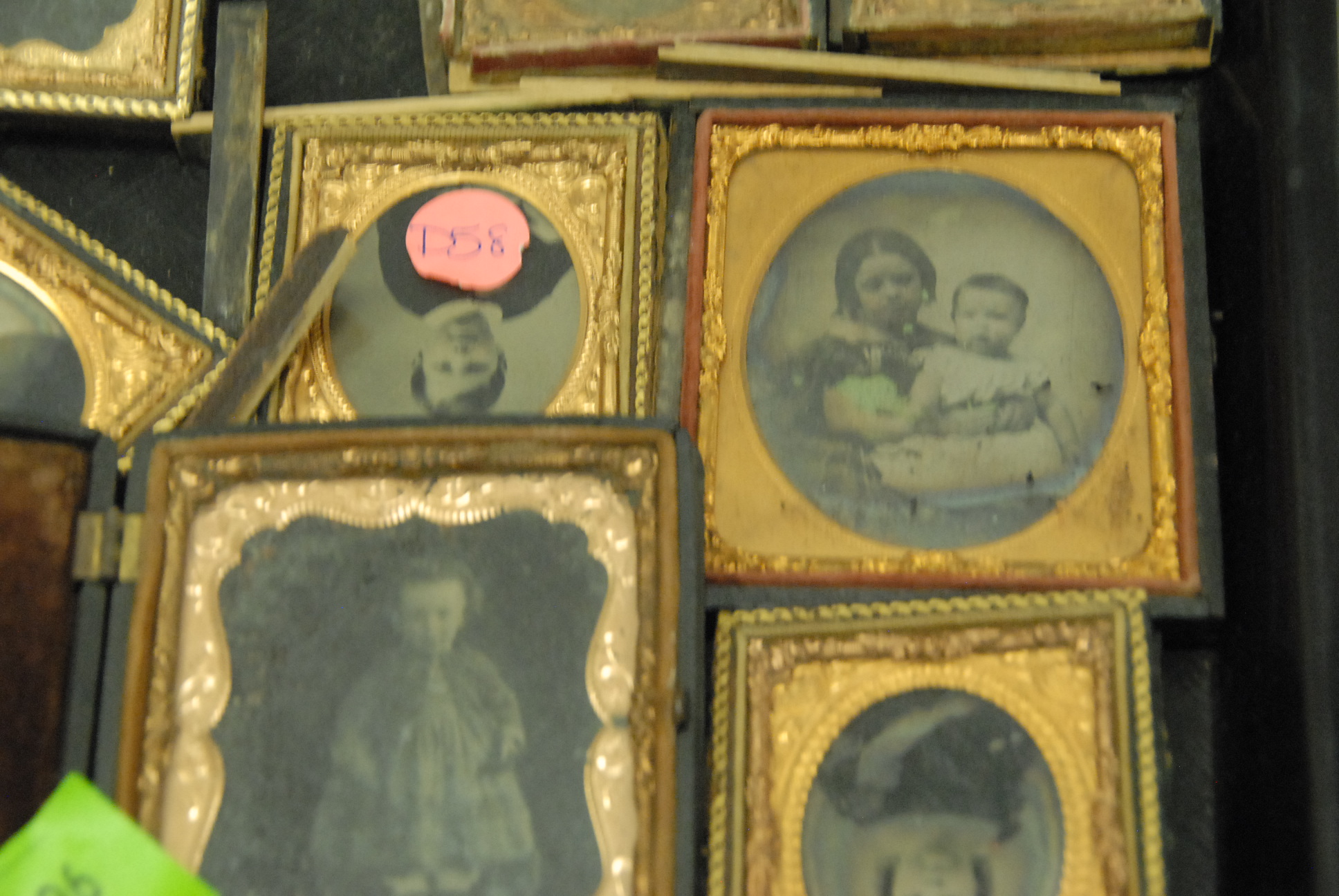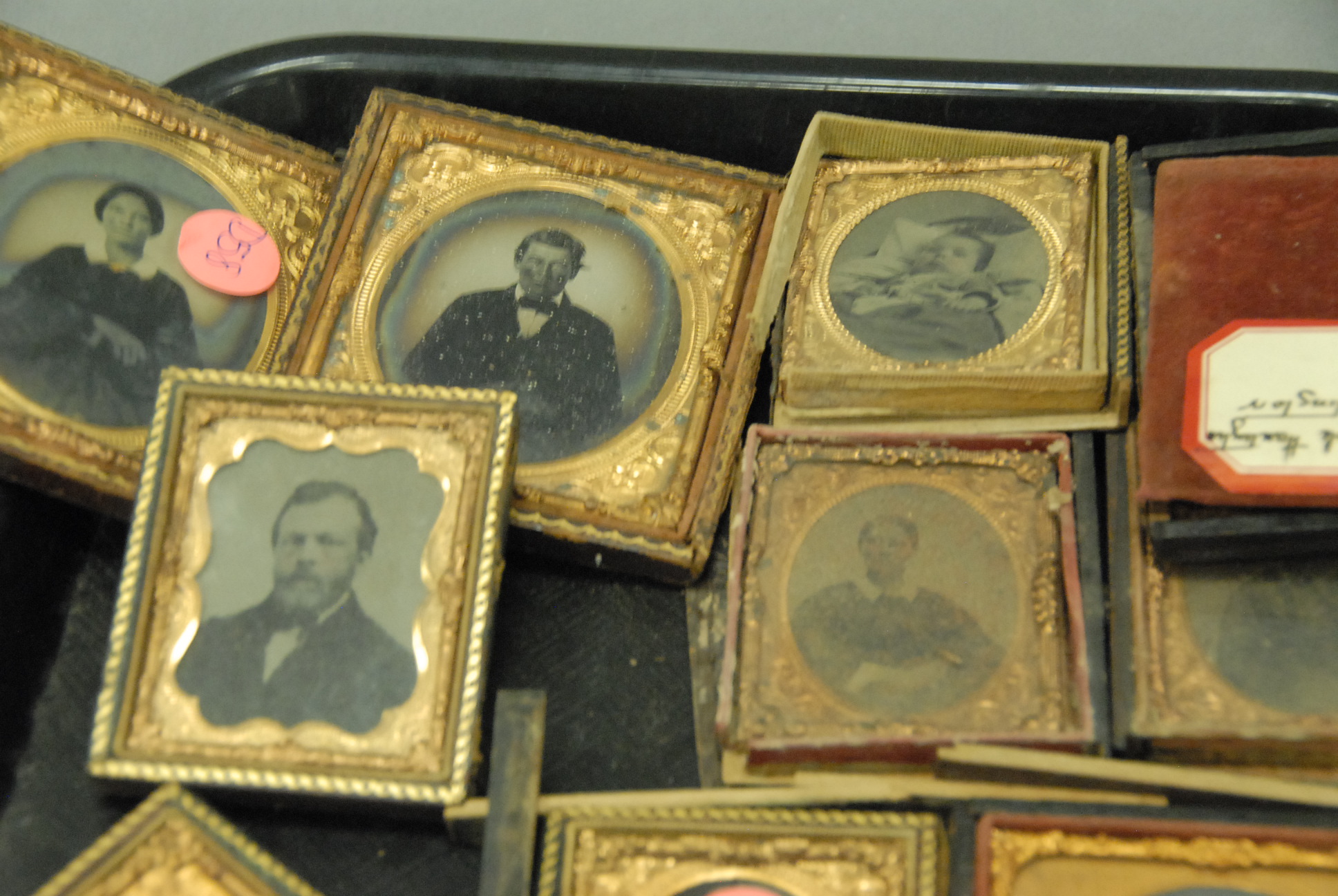 Group of twelve tin-types and ambrotypes of men, women, and children.