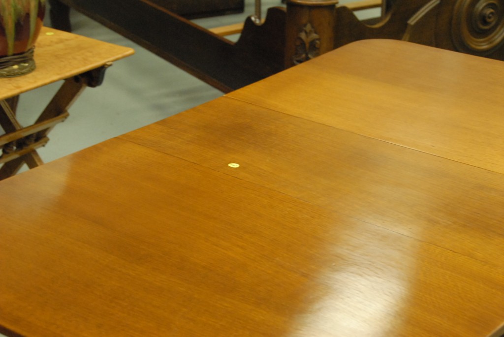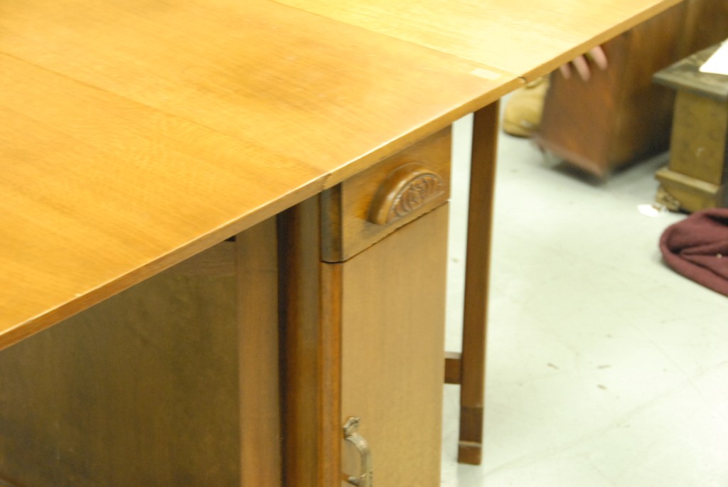 Oak dropleaf table with cabinet base.