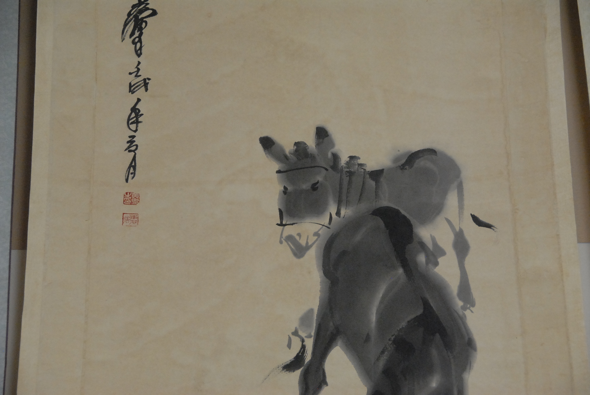 Oriental horse scroll watercolor of three horses, 38 1/2 x 23.