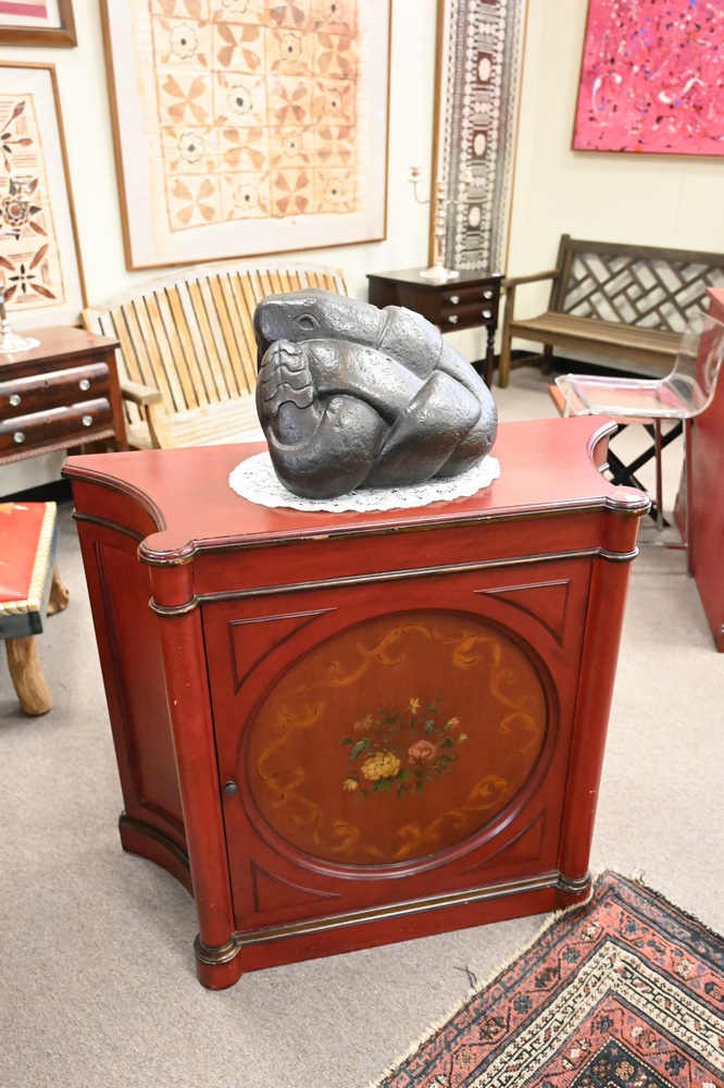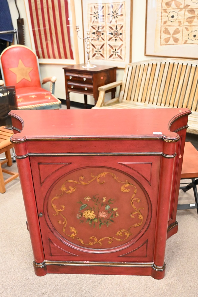 Lot 196: Pair of Adams Style Cabinets, in red paint having painted foliate design to each door, opening to two shelf fitted interior, height 35 inches, width 41 inches, depth 17 inches.