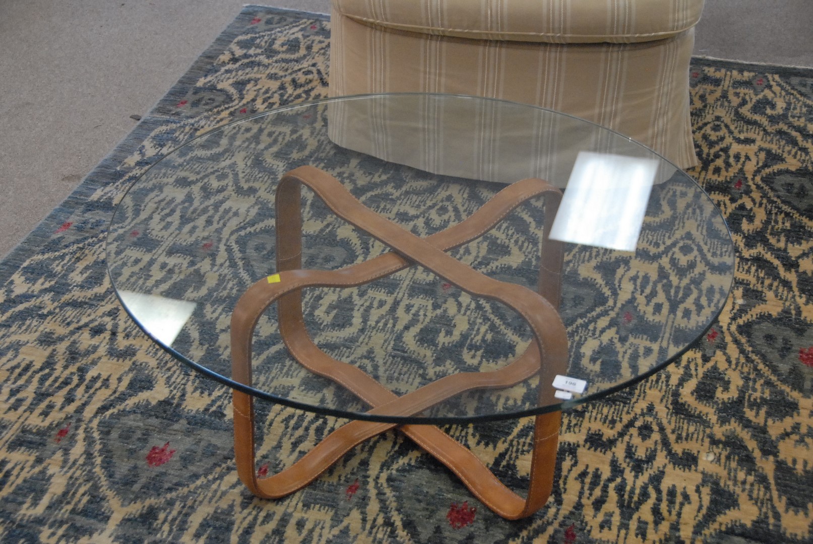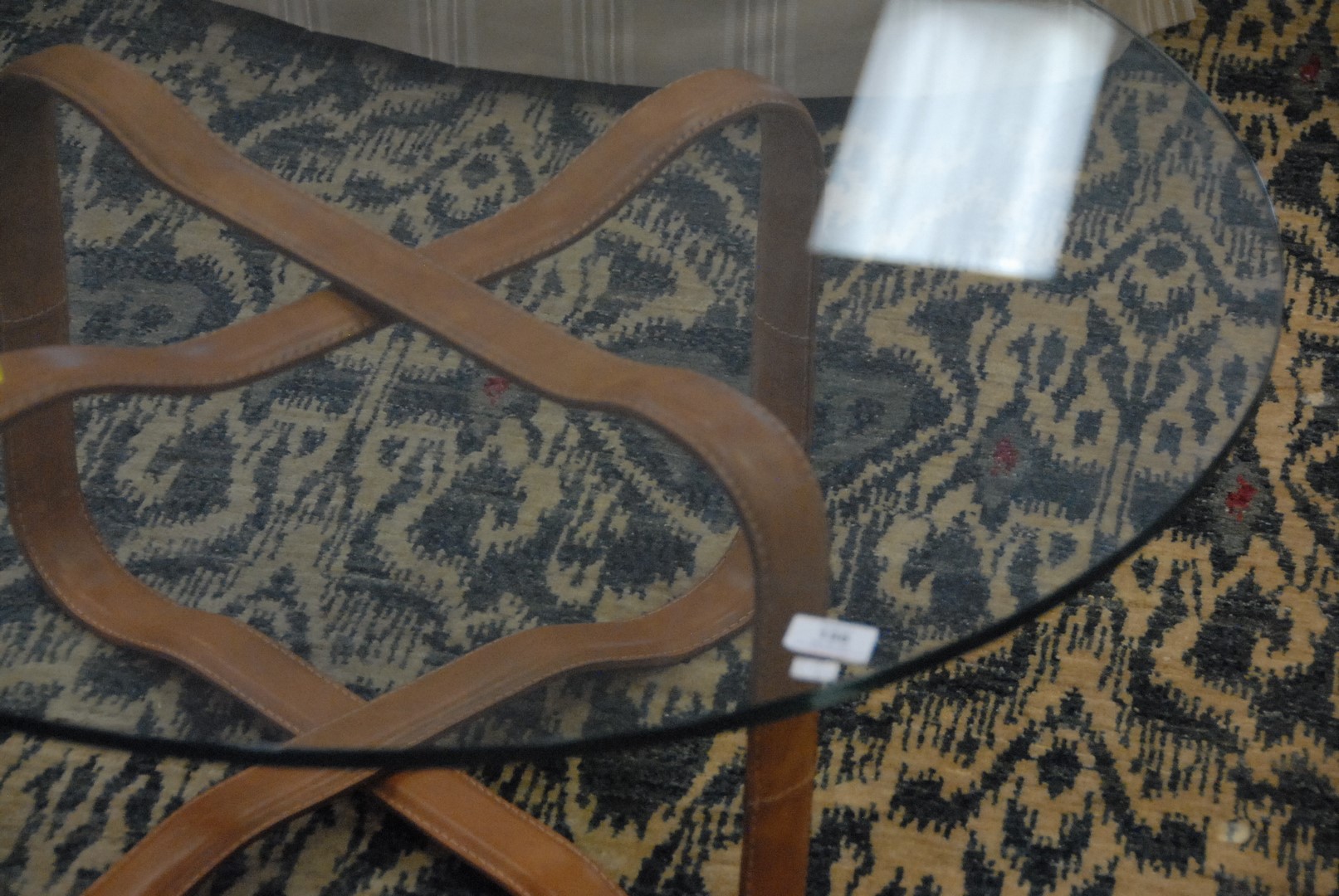 Ralph Lauren glass top table with leather base. ht. 15 in. dia. 35 1/2 in.