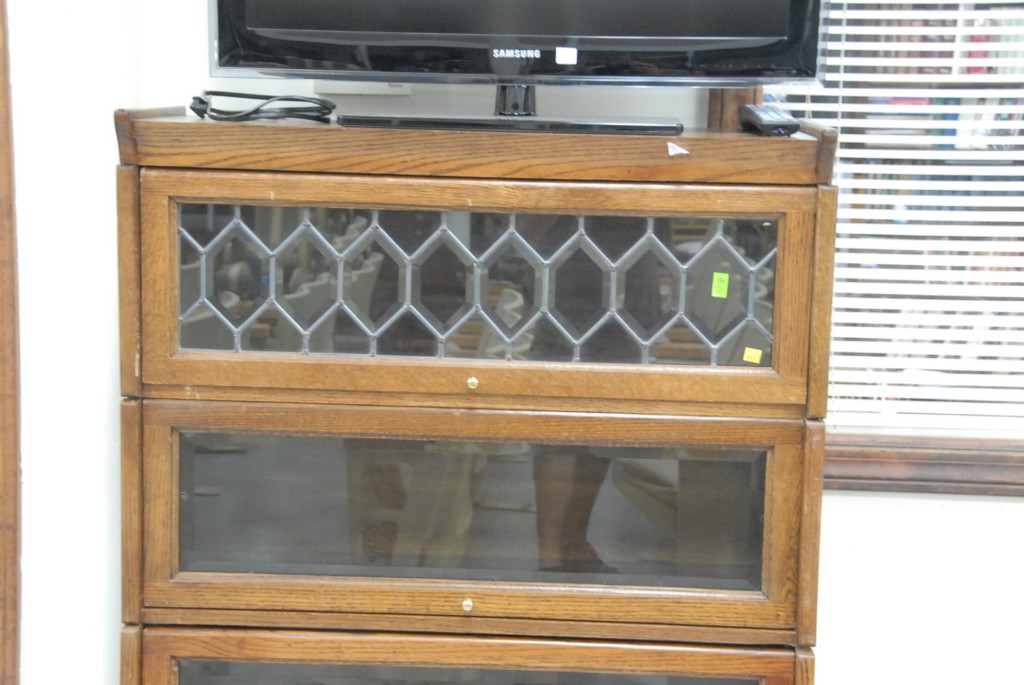 Reproduction oak stacking bookcase with leaded glass door top.