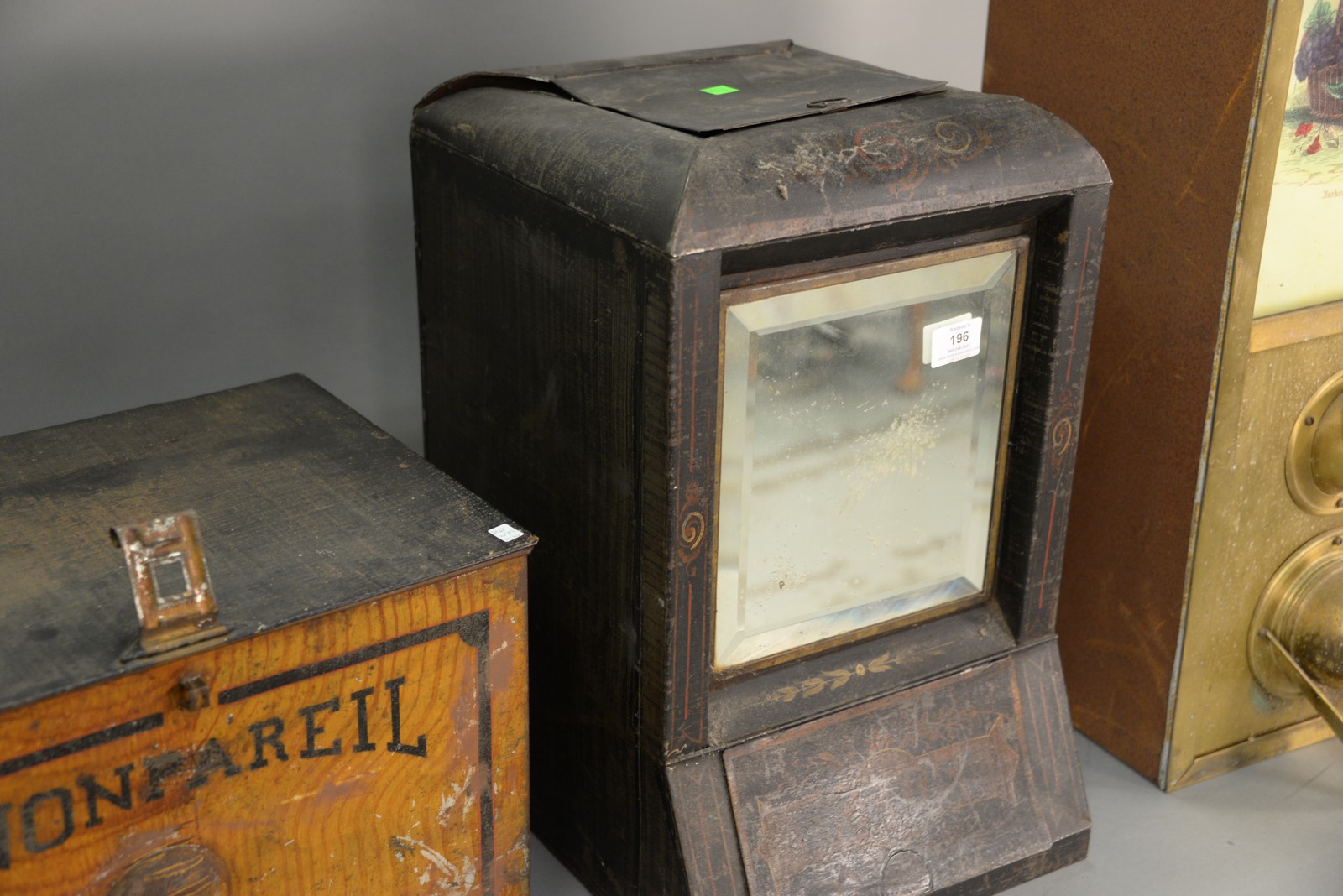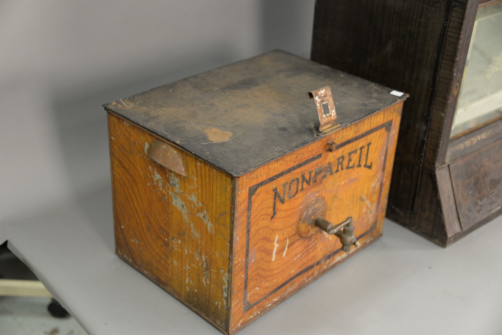 Lot 196: Three large dispensers including tole wood grain painted Nonfareil refrigerator box with spigot, tole coal hod with mirror, and bras…