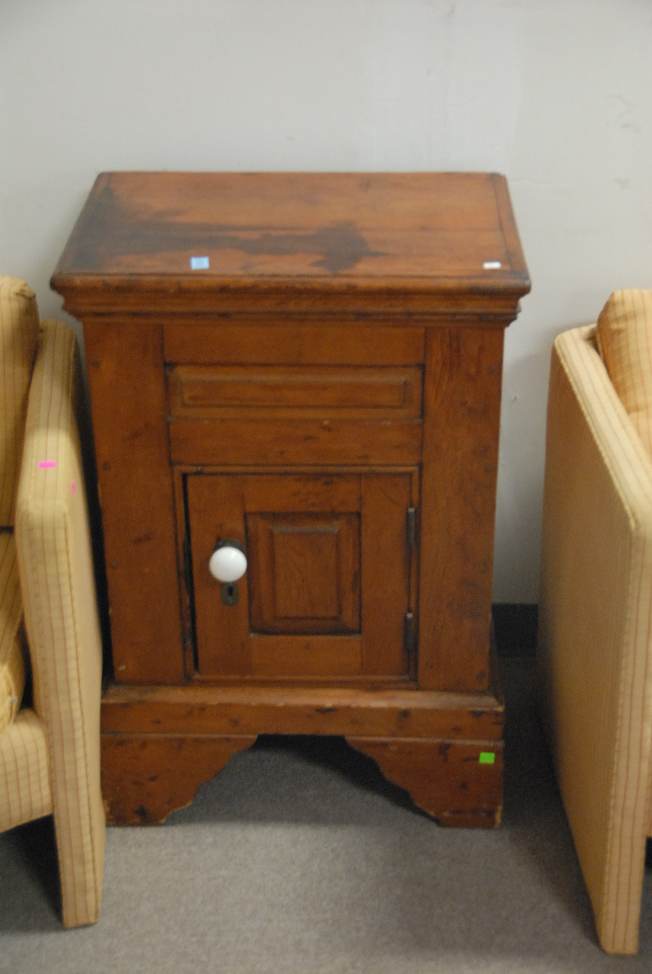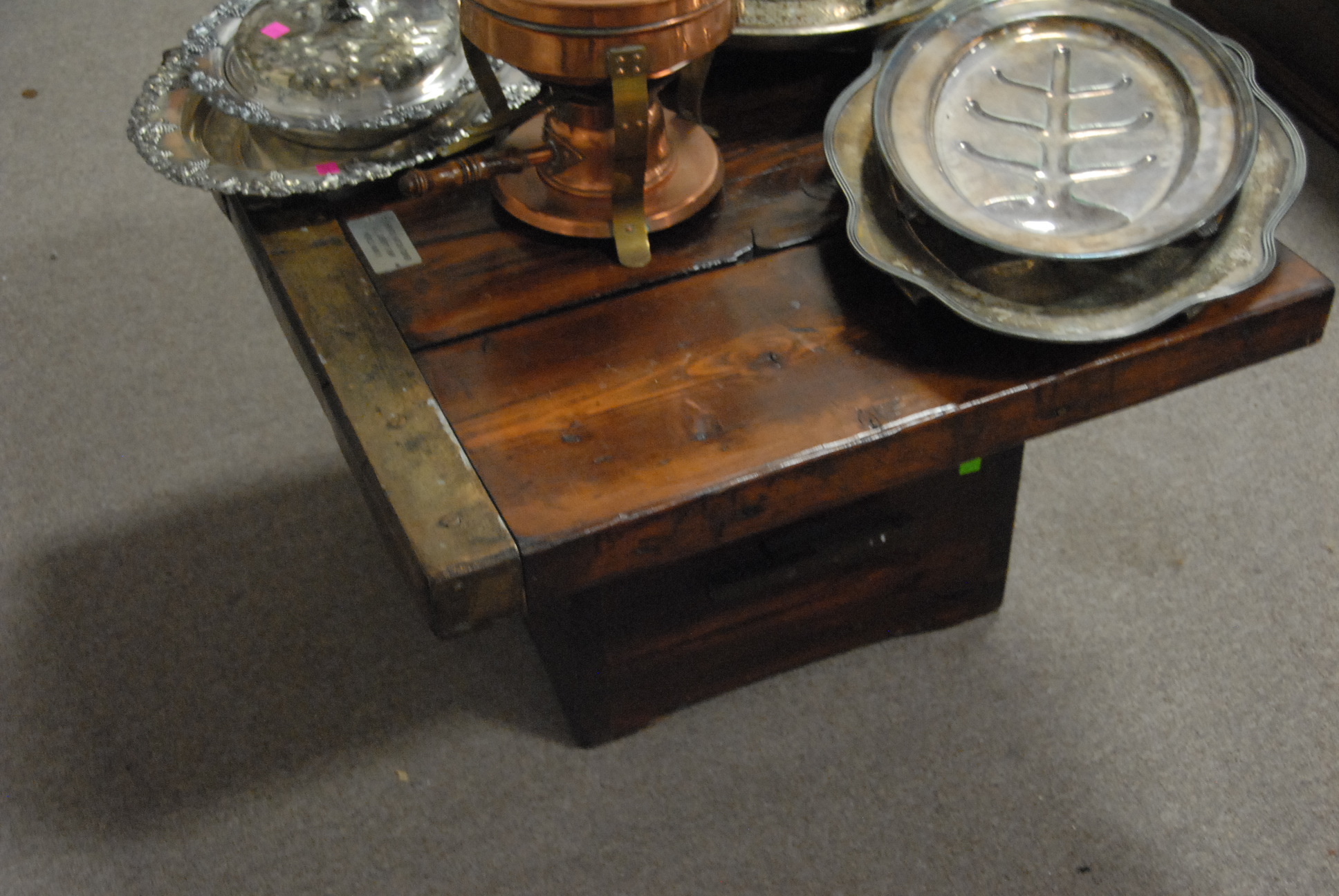 Lot 196: Three piece lot to include pine lift top primitive ice box, ht. 34in. wd. 23in., upholstered stool, and ship’s hatch cover coffee t…