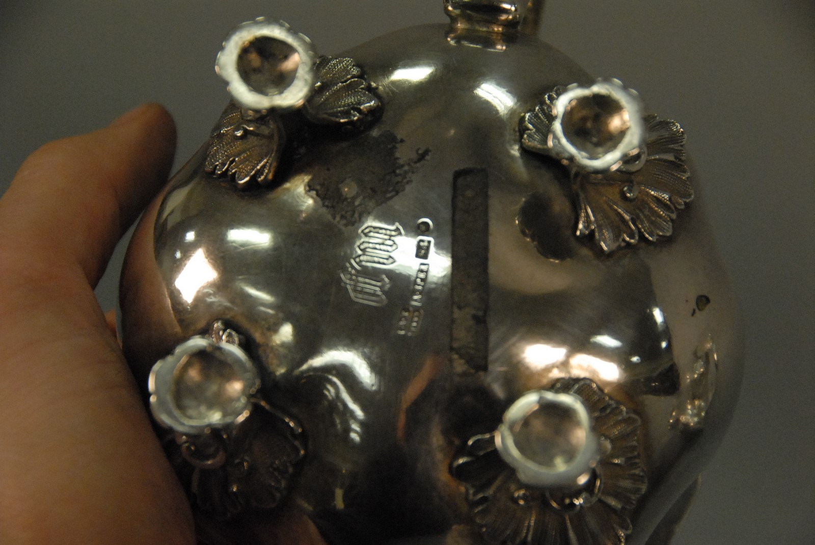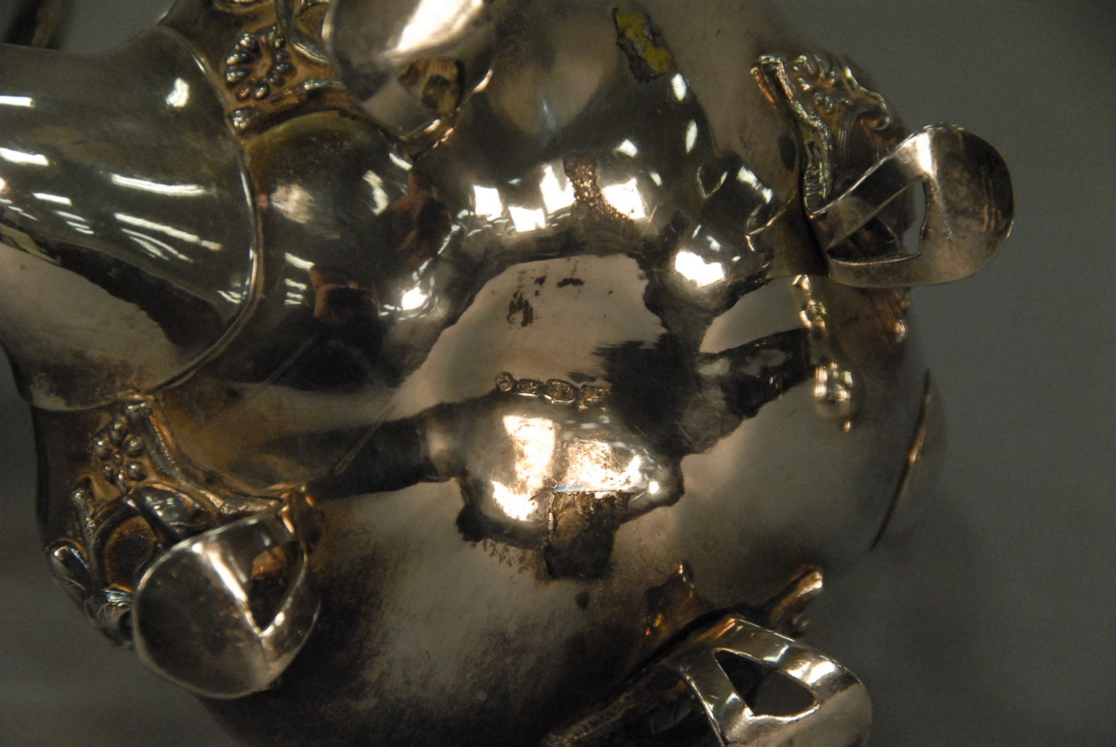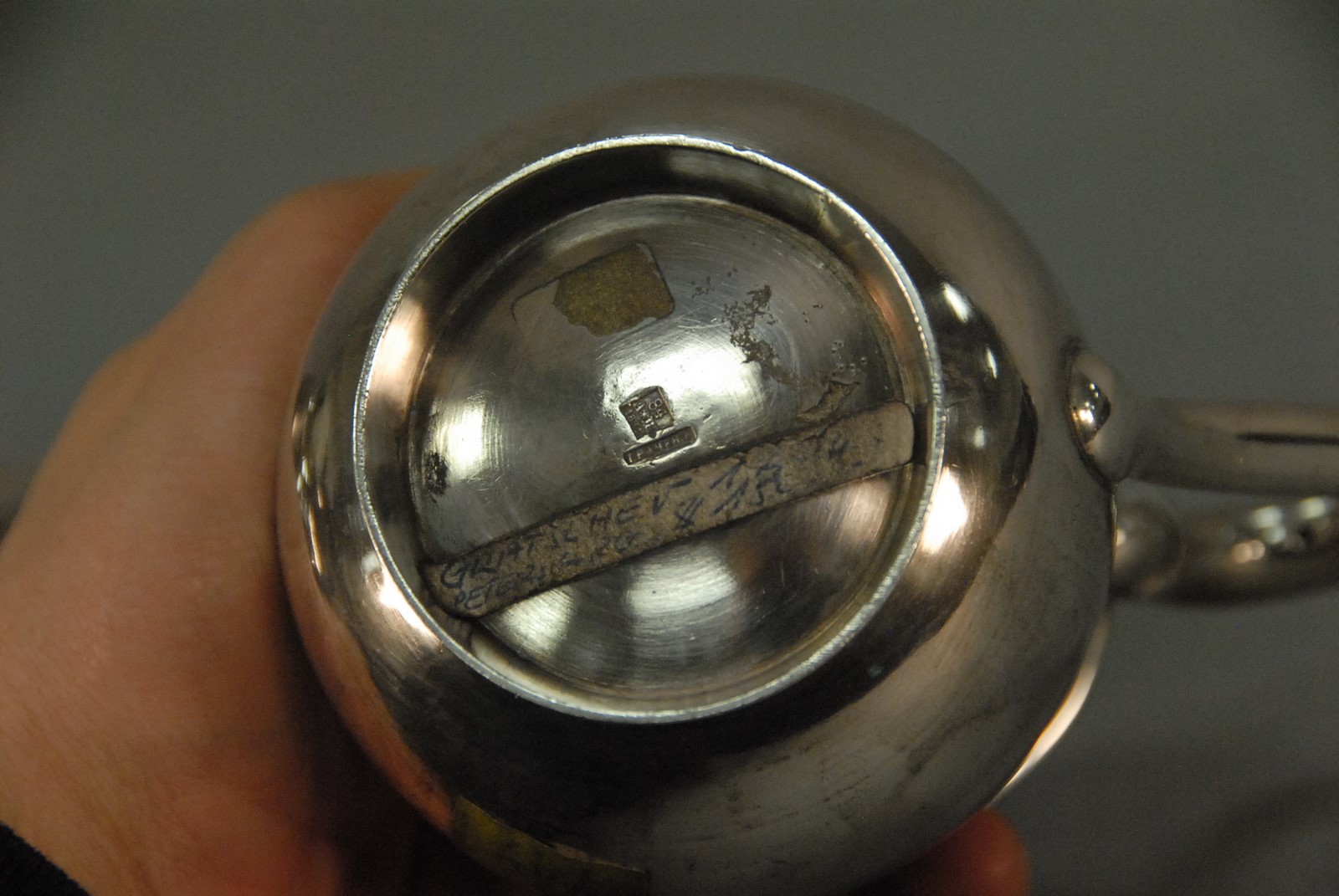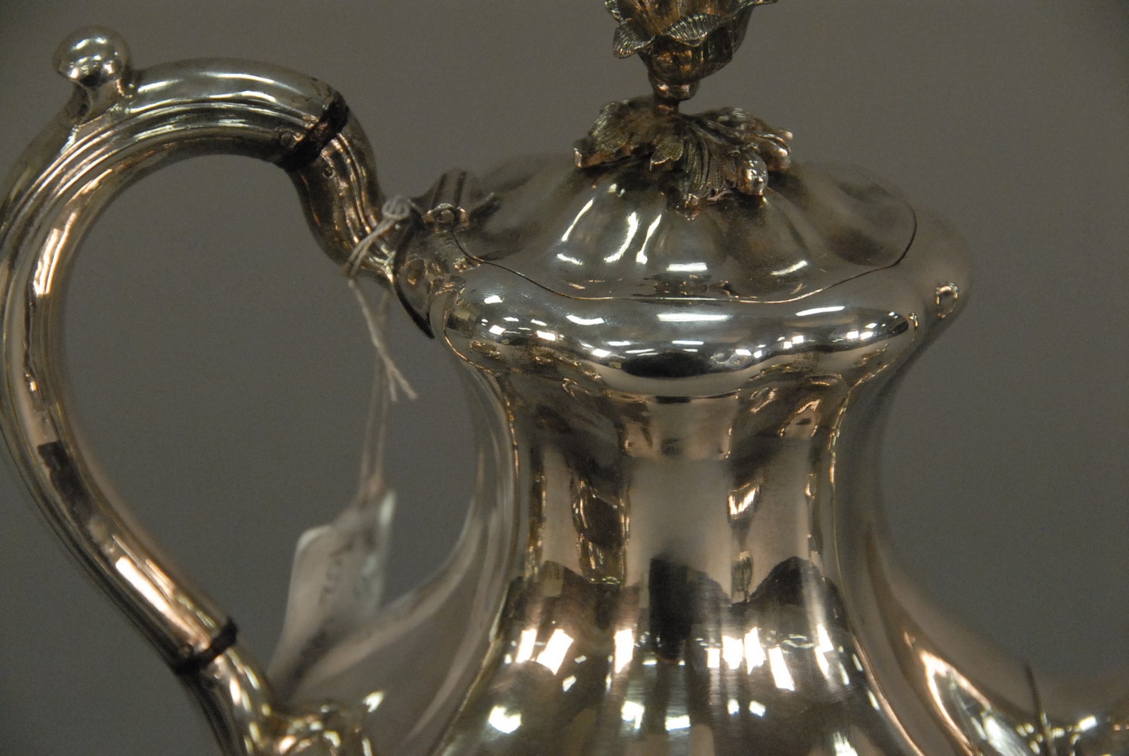 Lot 196: Three piece Russian silver lot including coffee pot and two non matching creamers, marked 84 and various markers marks, 19th century. 43.3 t oz.