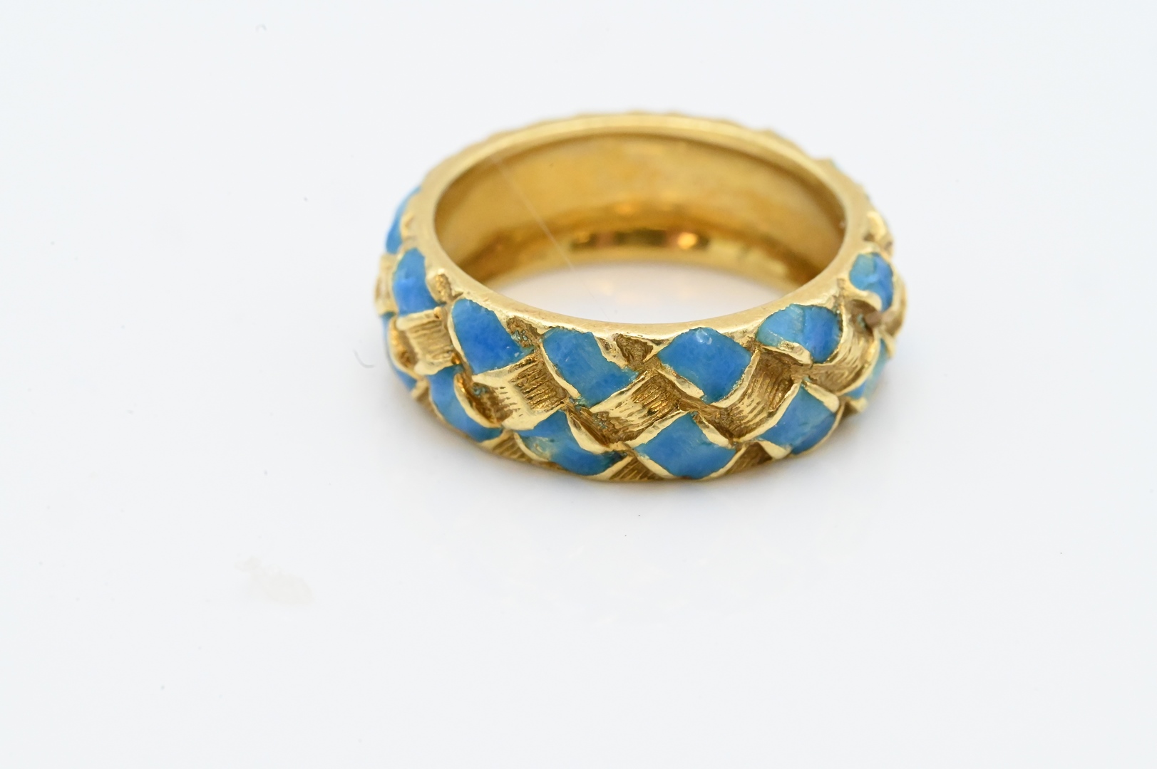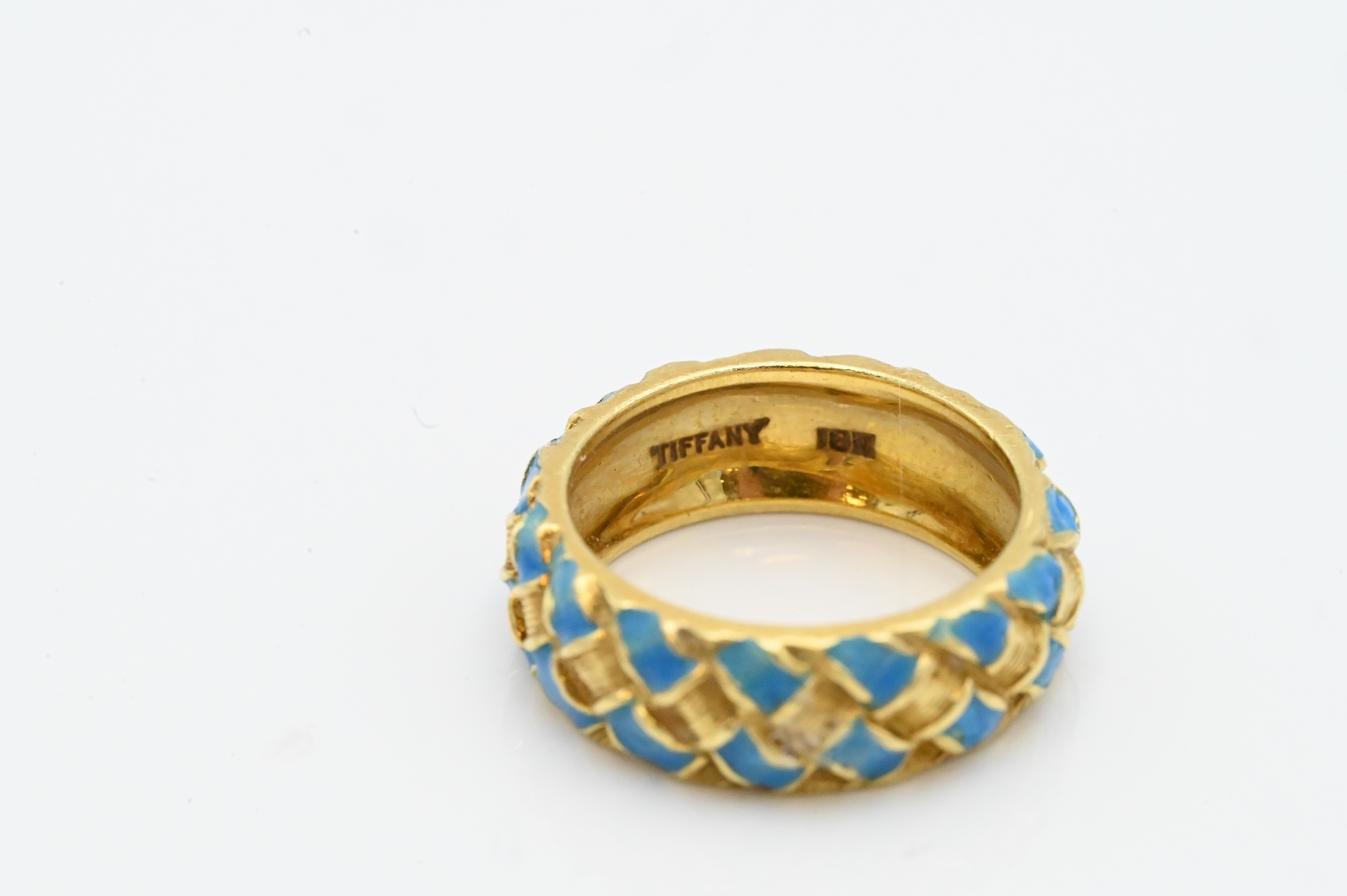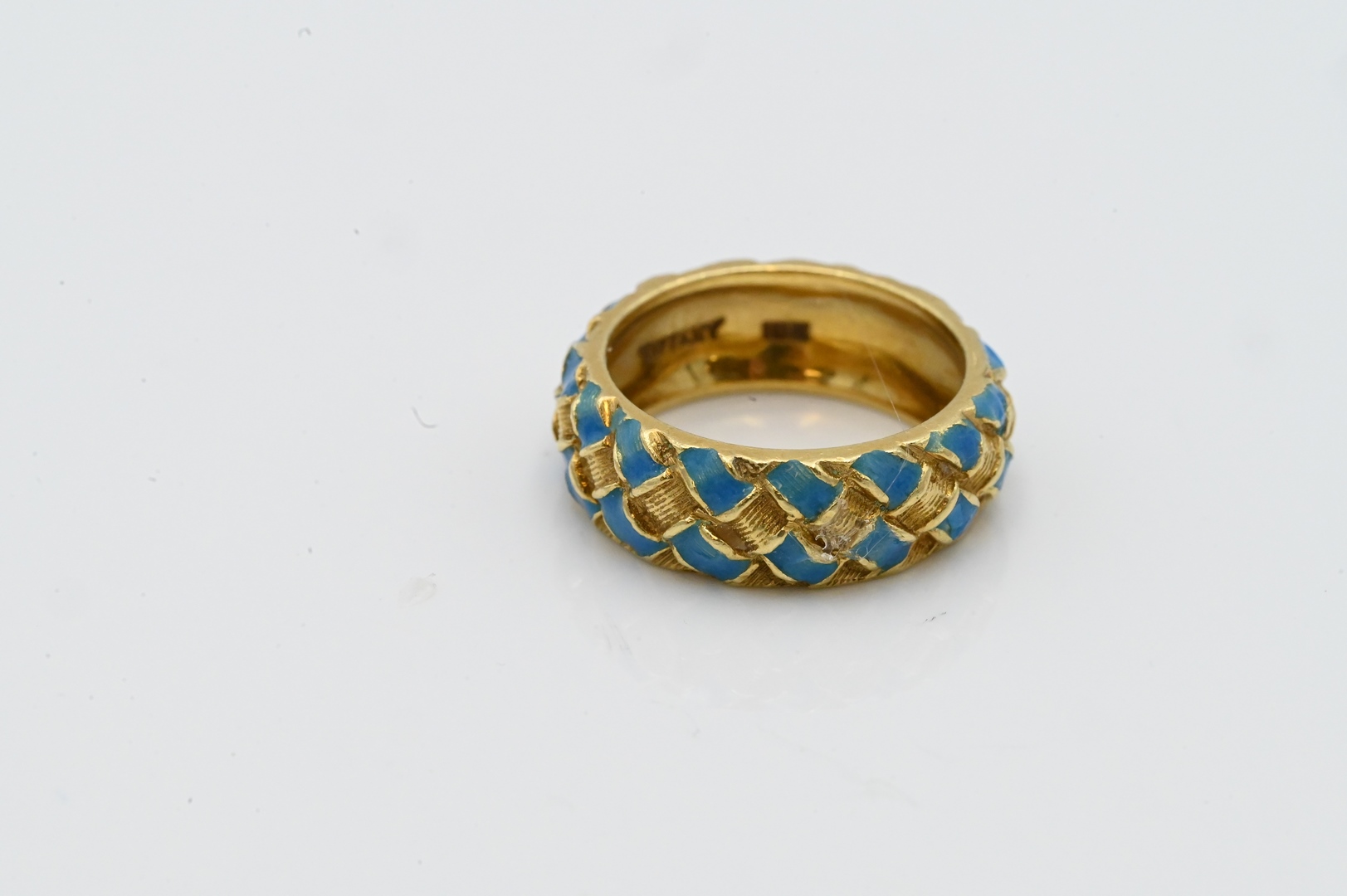 Lot 196: Tiffany & Company 18 Karat Yellow Gold and Light Blue Enameled Ring