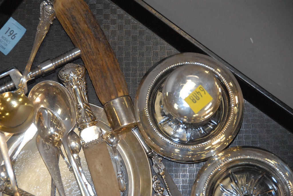 Lot 196: Tray lot spoons, coasters with sterling rims, small container, plate with sterling rim, and cork screw