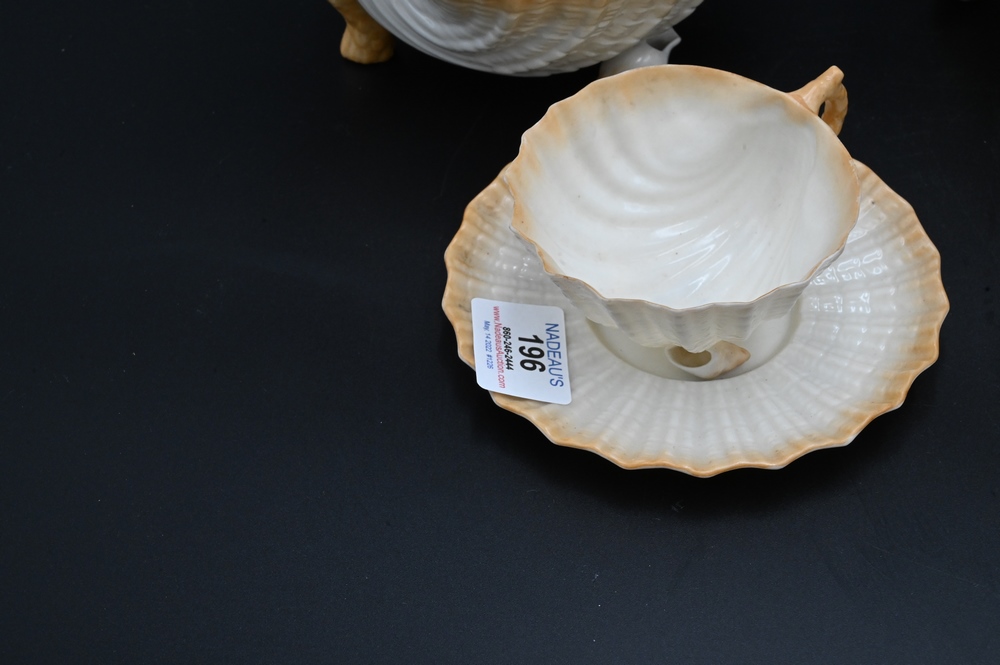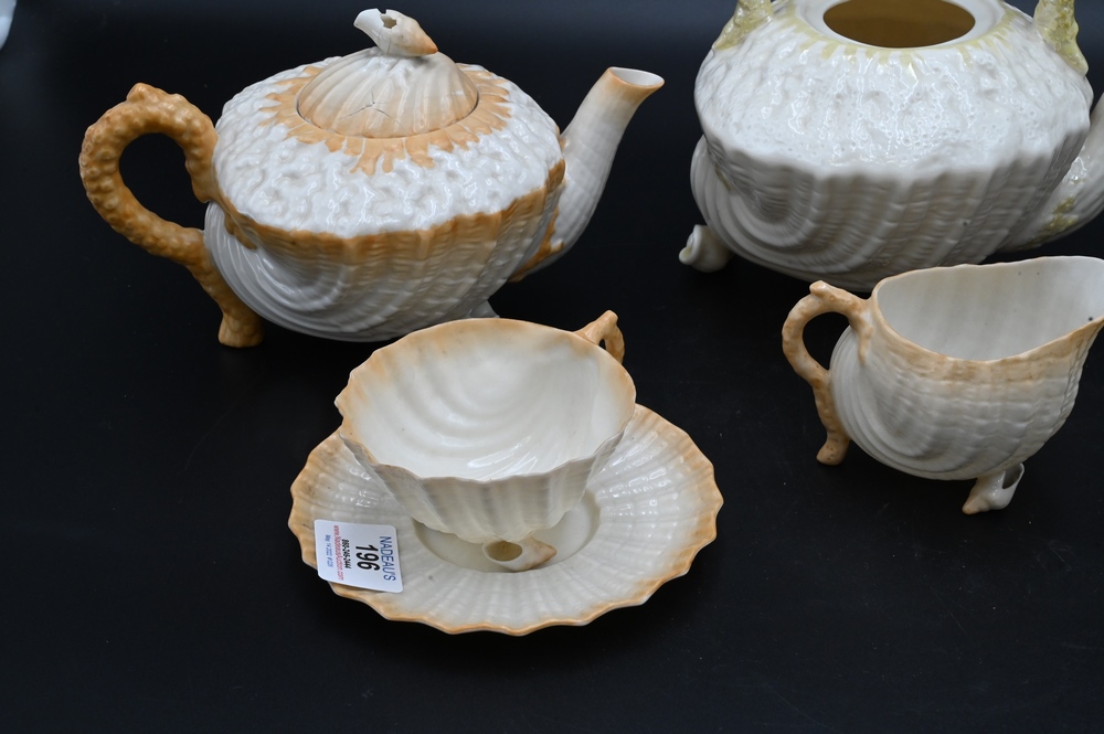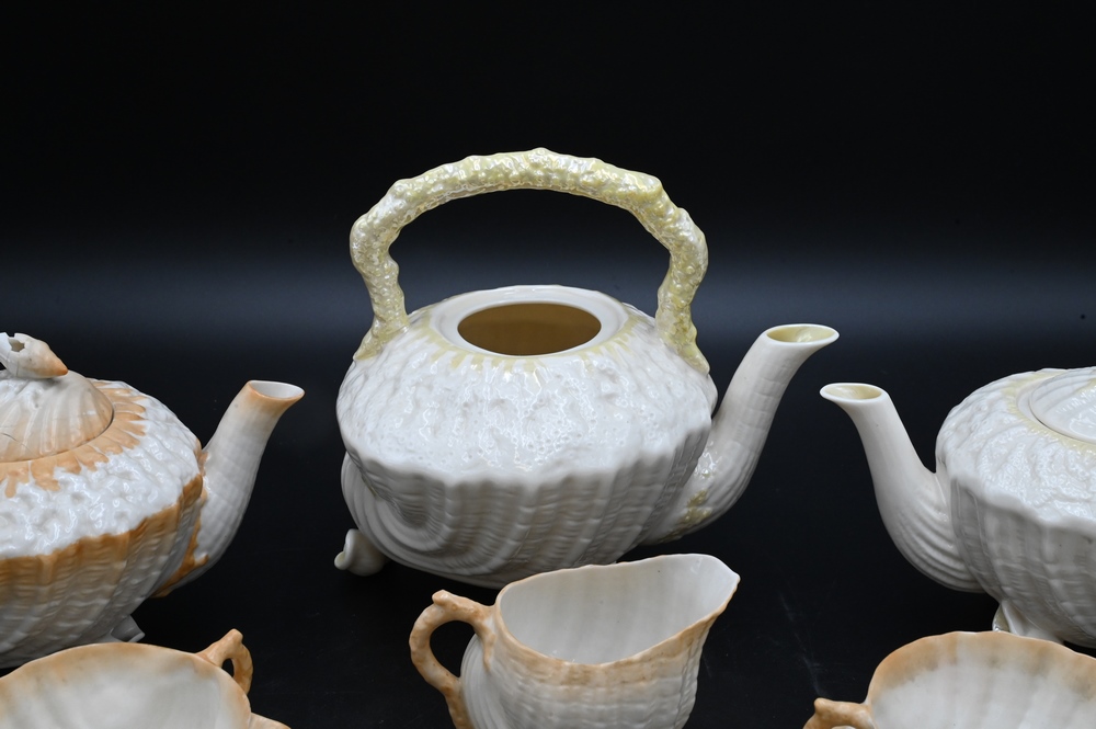 Lot 196: Two Belleek Neptune Tea Sets, to include one six piece with painted brown border, with black mark, (repaired cover); along with a two piece light yellow on shell feet, having green mark (top repaired), tallest 7 1/2 inches. Provenance: Collections of Norma Reilly, New Jersey.