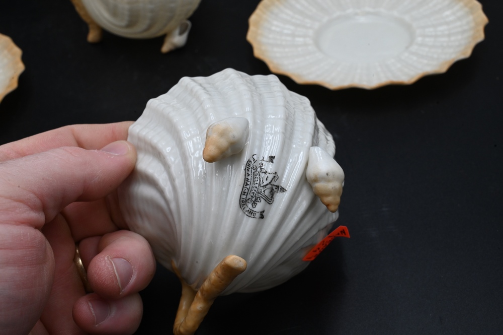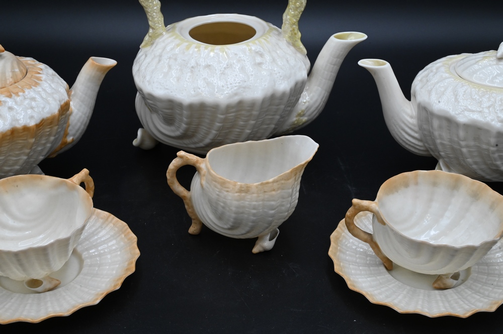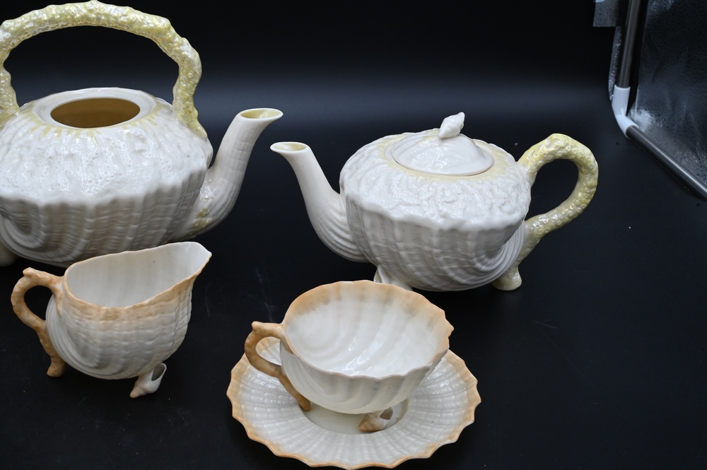 Two Belleek Neptune Tea Sets, to include one six piece with painted brown border, with black mark, (repaired cover); along with a two piece light yellow on shell feet, having green mark (top repaired), tallest 7 1/2 inches. Provenance: Collections of Norma Reilly, New Jersey.