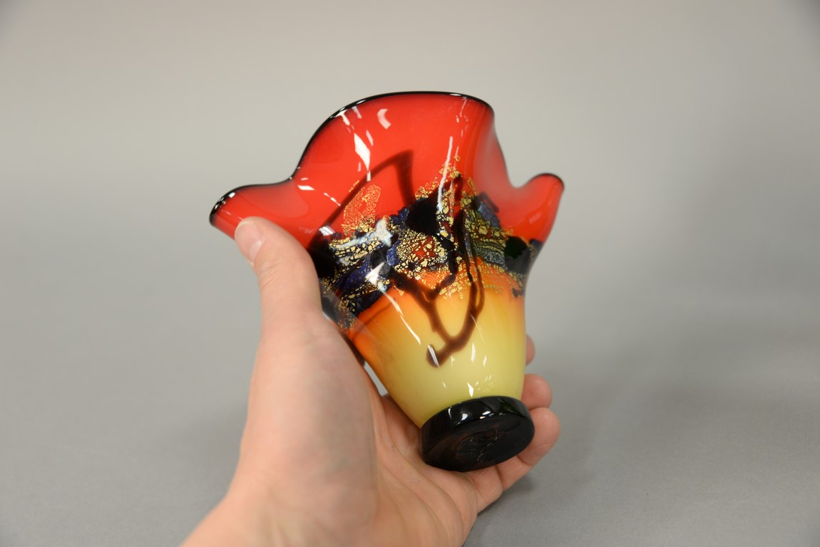 Two Chihuly style art glass vases including a large green vase and a small red with black and gold. ht. 5 1/4 in. and ht. 14 1/2 in.