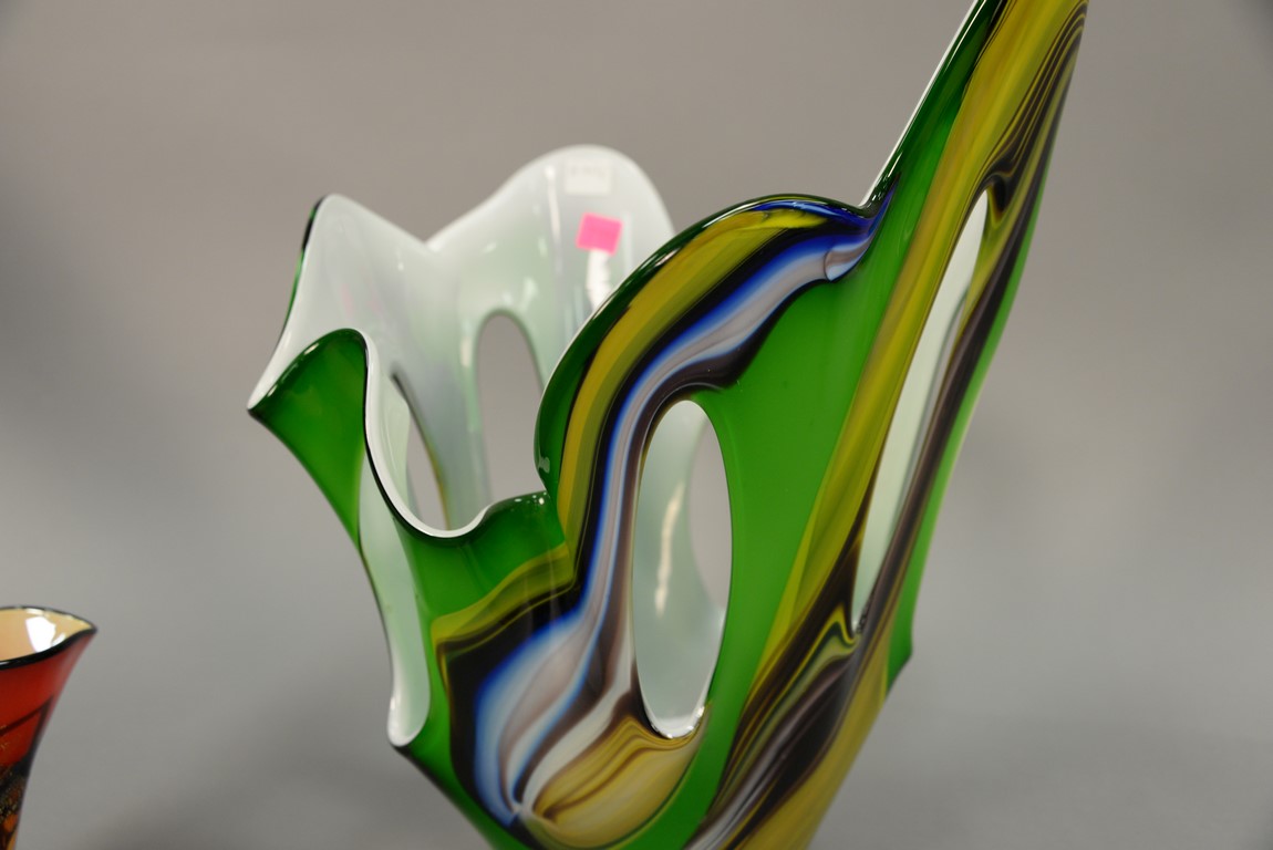 Lot 196: Two Chihuly style art glass vases including a large green vase and a small red with black and gold. ht. 5 1/4 in. and ht. 14 1/2 in.