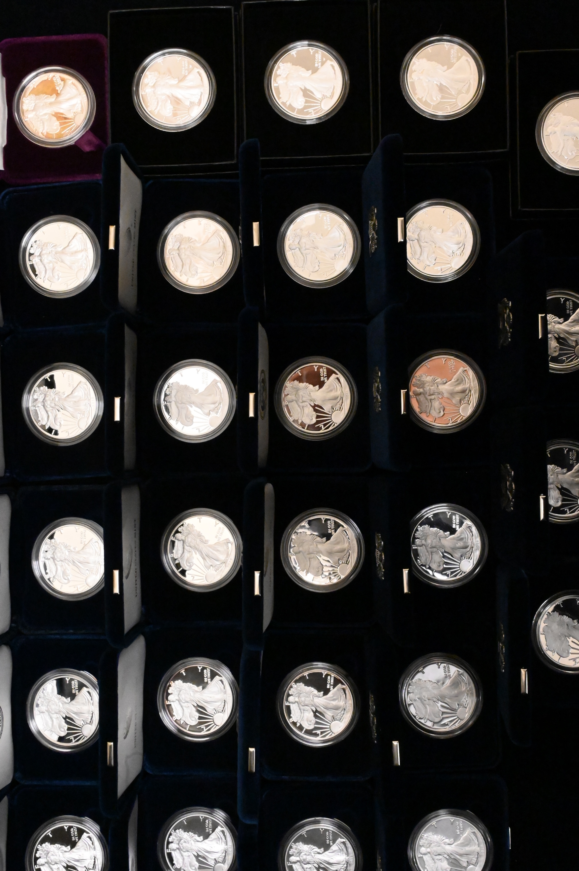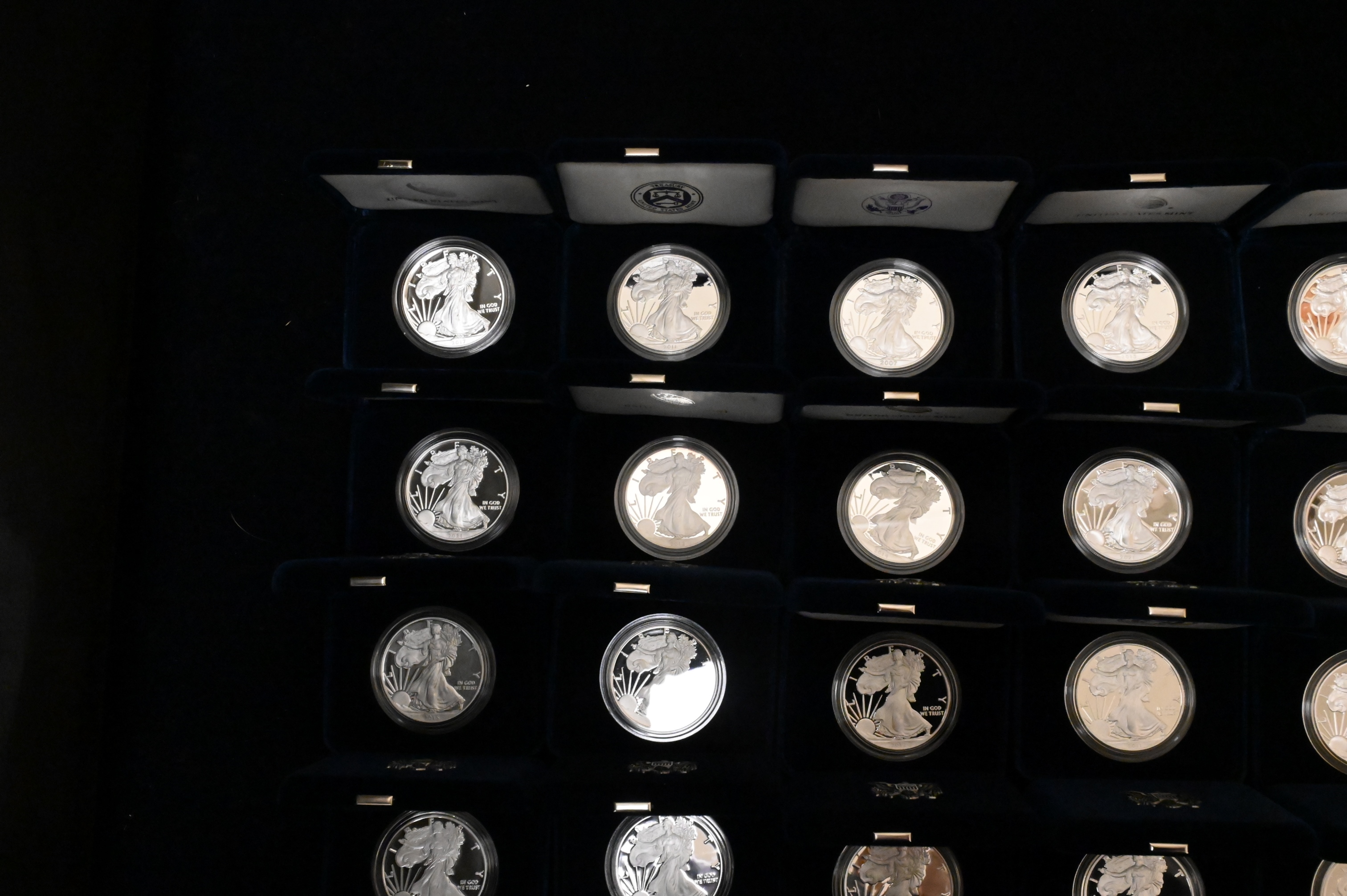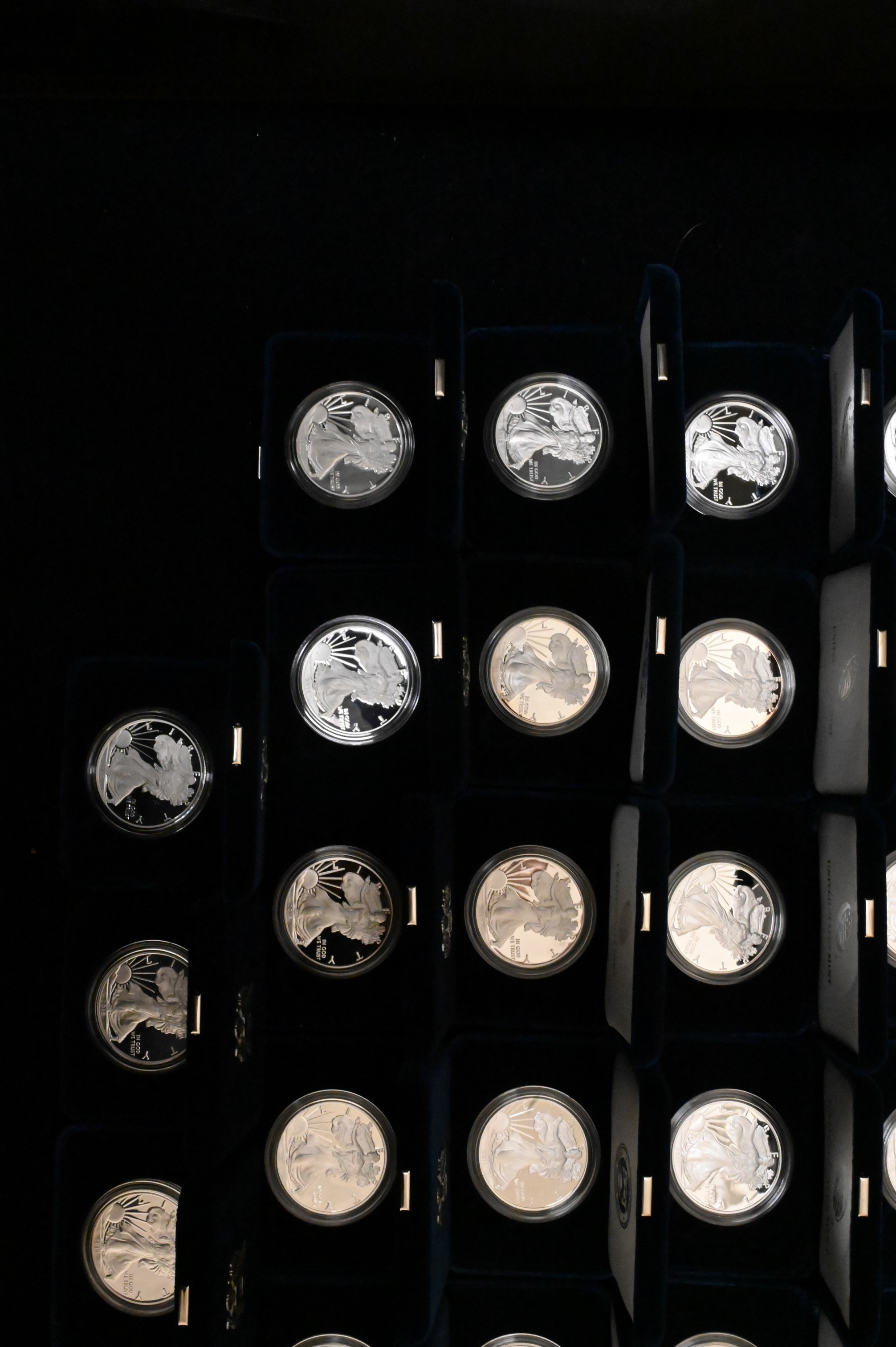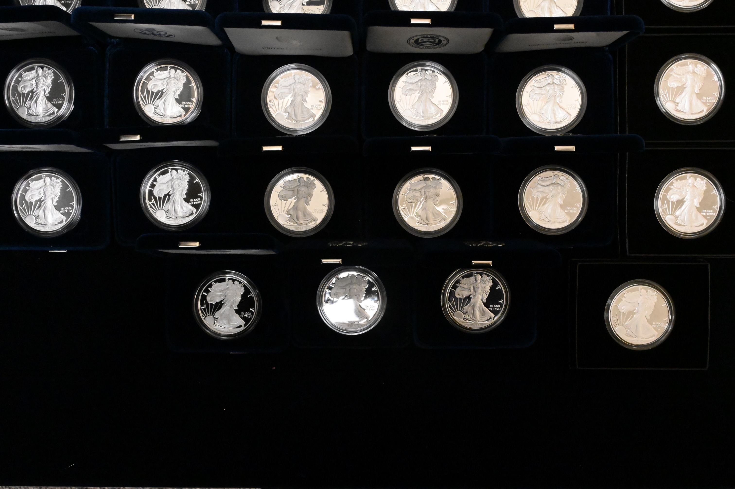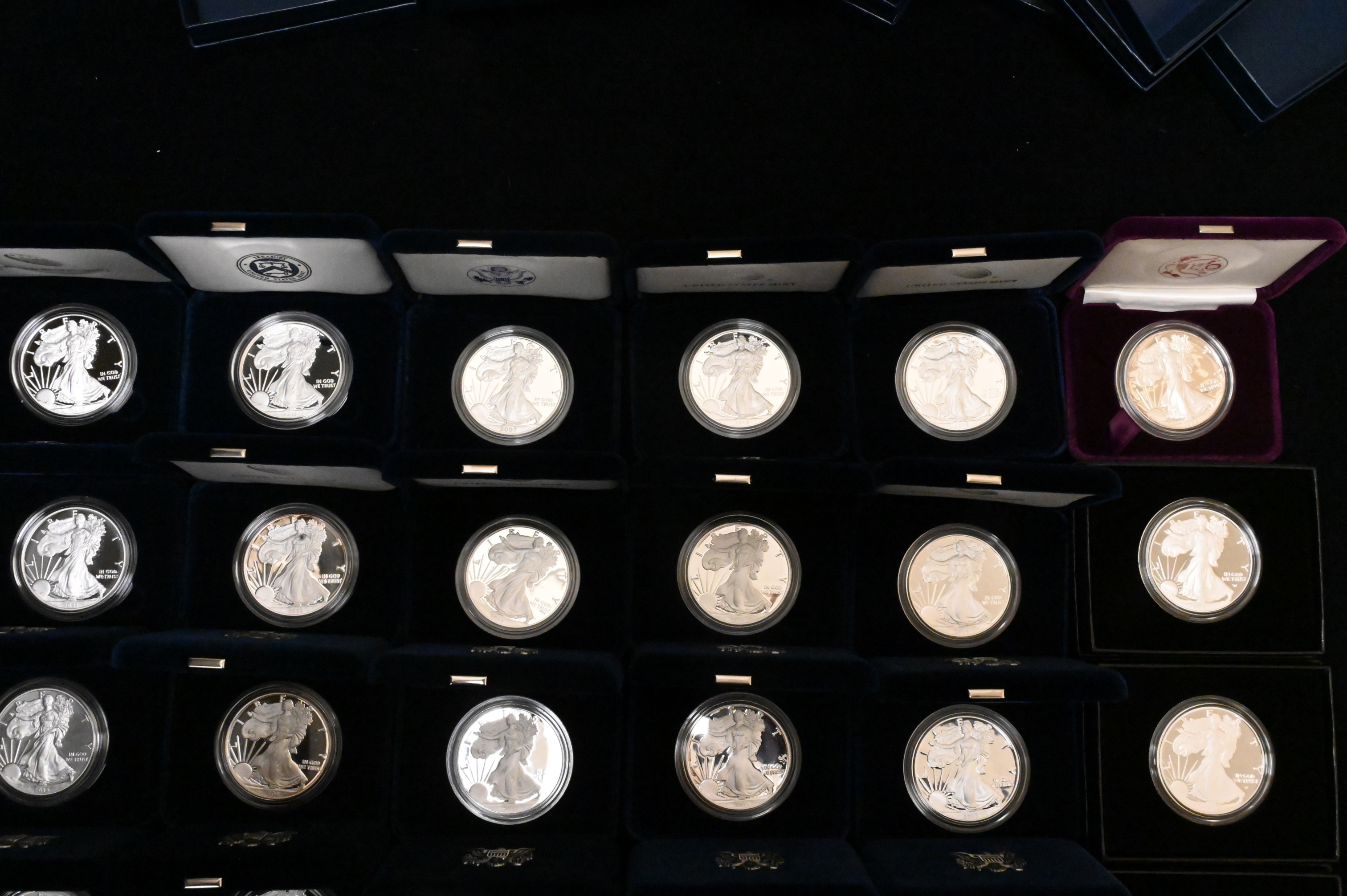 28 American Silver Eagle Proofs, to include one 2007, one 2008, two 2011, two 2012, one 2013, two 2014, three 2015, two 2016, two 2017, one 2018, two 2019, two 2020, four 2021, two 2022 and one 1987. 28 in all